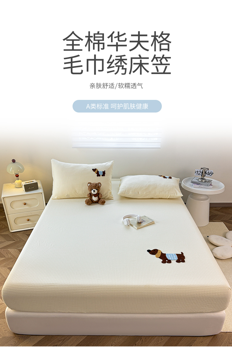 商品名称:居眠 2026新款全棉华夫格毛巾绣系列床笠 乖乖幼崽-灰