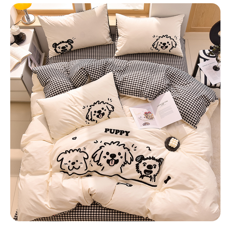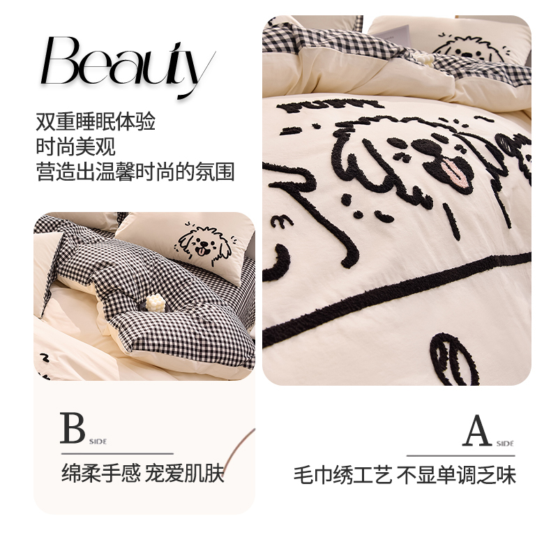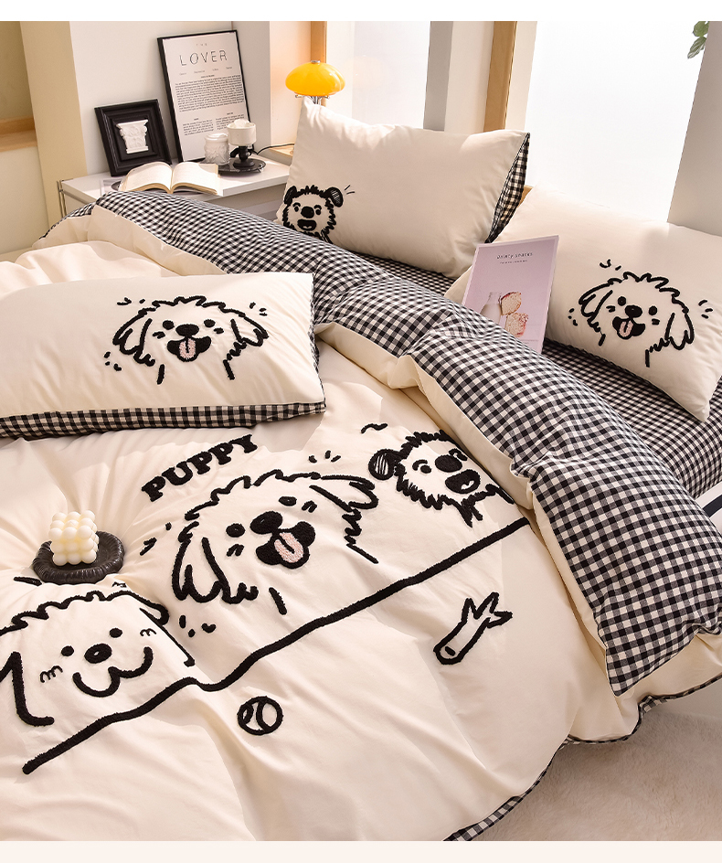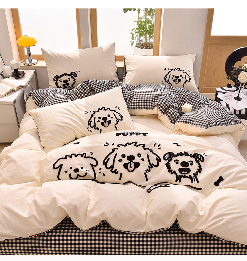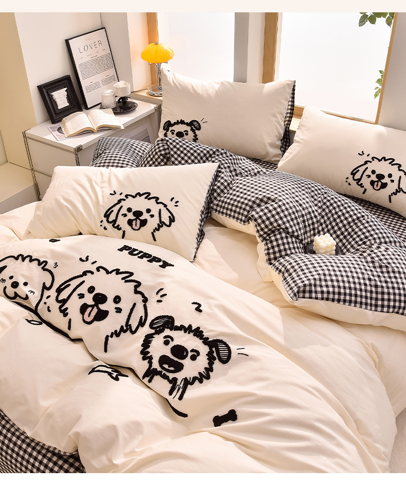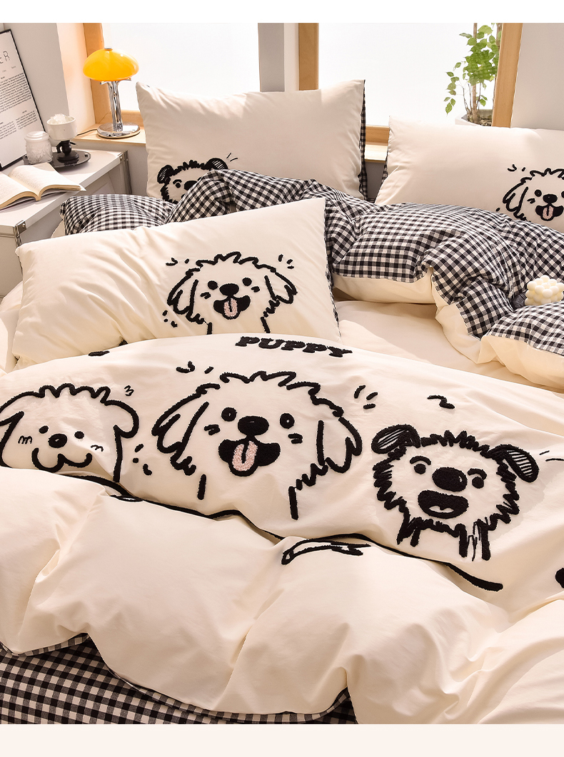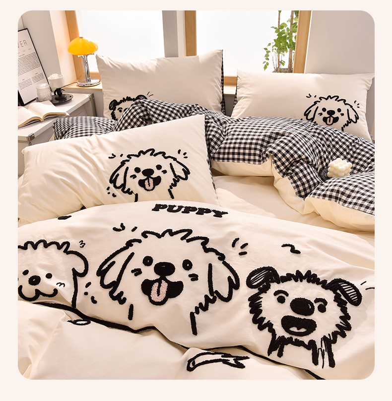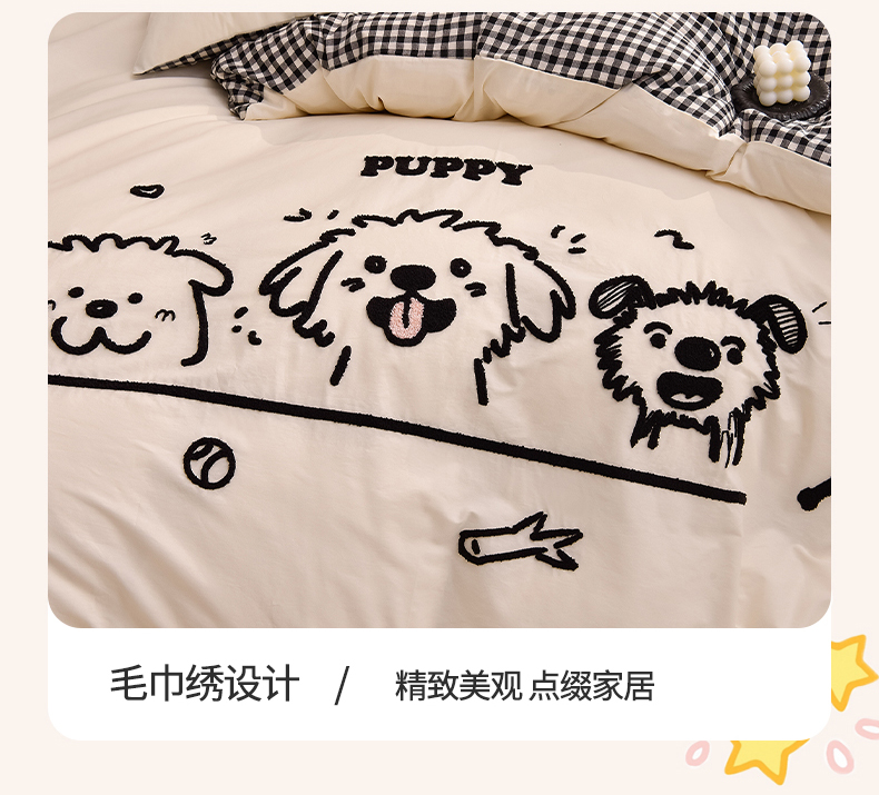 当前位置: 91家纺网 > 商品网购 > 床品套件 > 四件套 > 全棉普通四件套 > 炫拼家纺 2026新款多巴胺系列A类全棉40支水洗棉卡通毛巾绣四件套 多巴胺-潦草小狗
