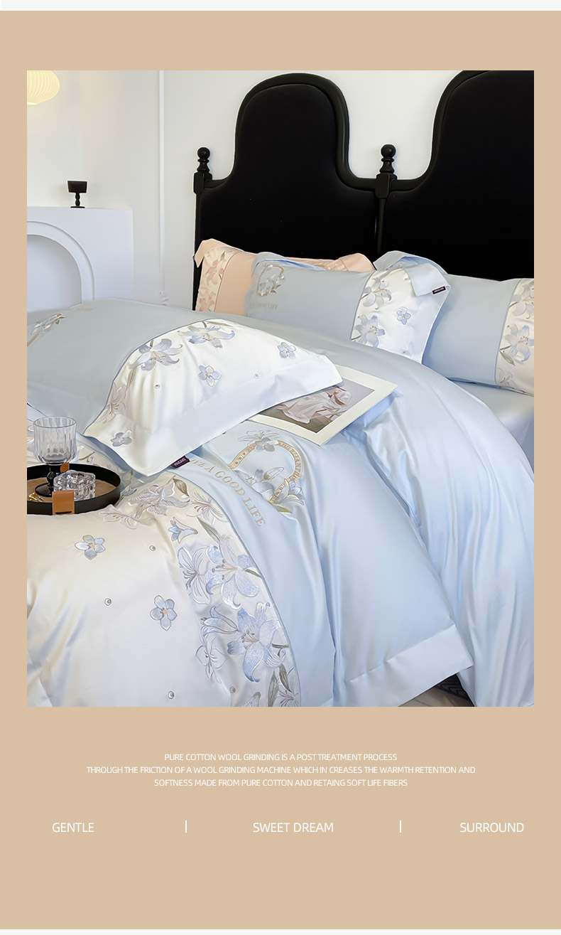 商品名称: 2026新款特供款A类长绒棉纯棉四件套100全棉少女心刺绣被套床单床笠床上用品 花若梦-慕蓝