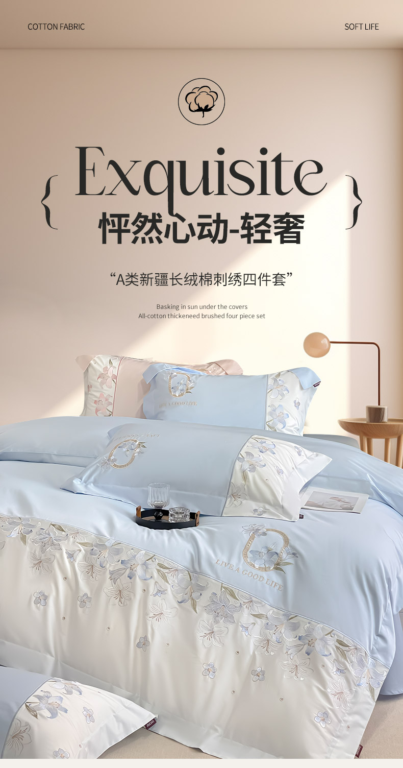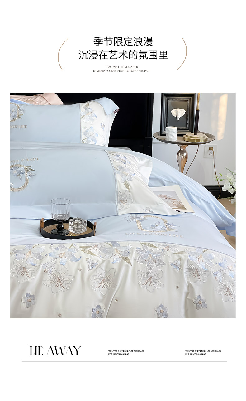 2026新款特供款A类长绒棉纯棉四件套100全棉少女心刺绣被套床单床笠床上用品 花若梦-慕蓝