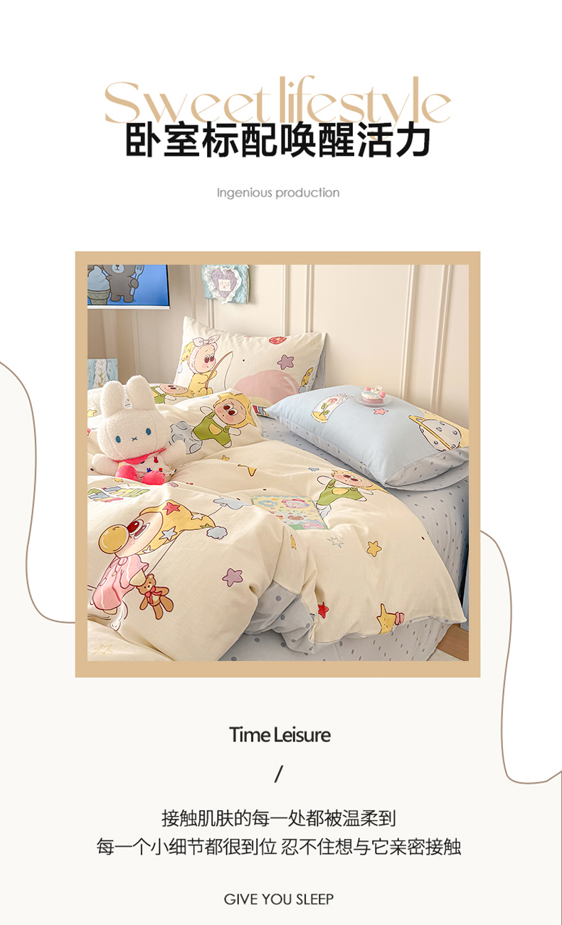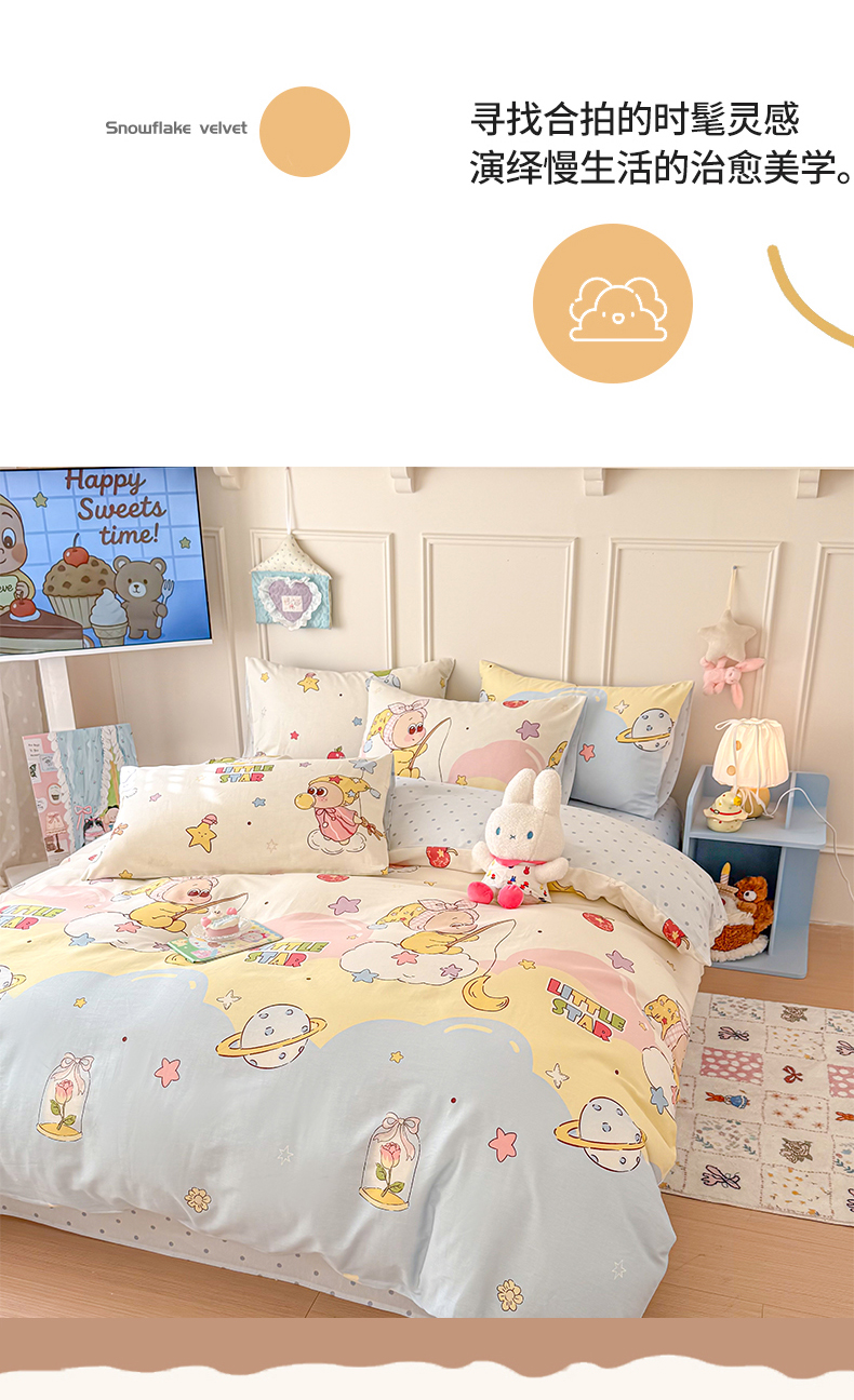 (总)呗旺鹿 2026新款全棉纯棉40支13070卡通印花四件套-场景二,萌星,鼻涕狗,果子象,机灵猫,可爱星人,幸福小熊