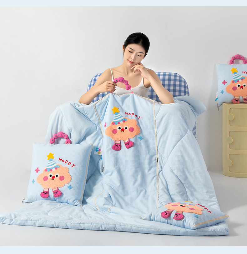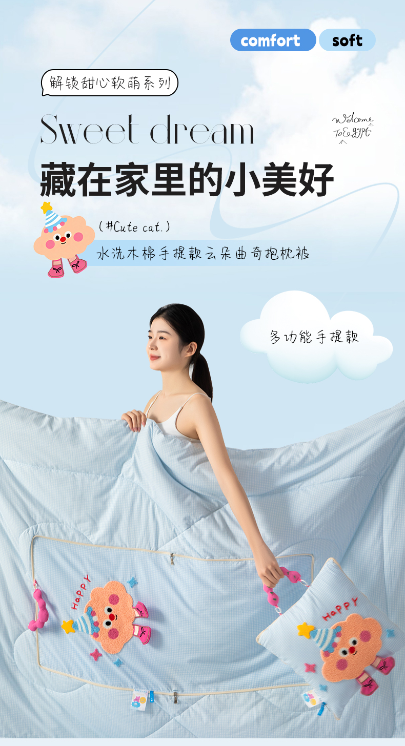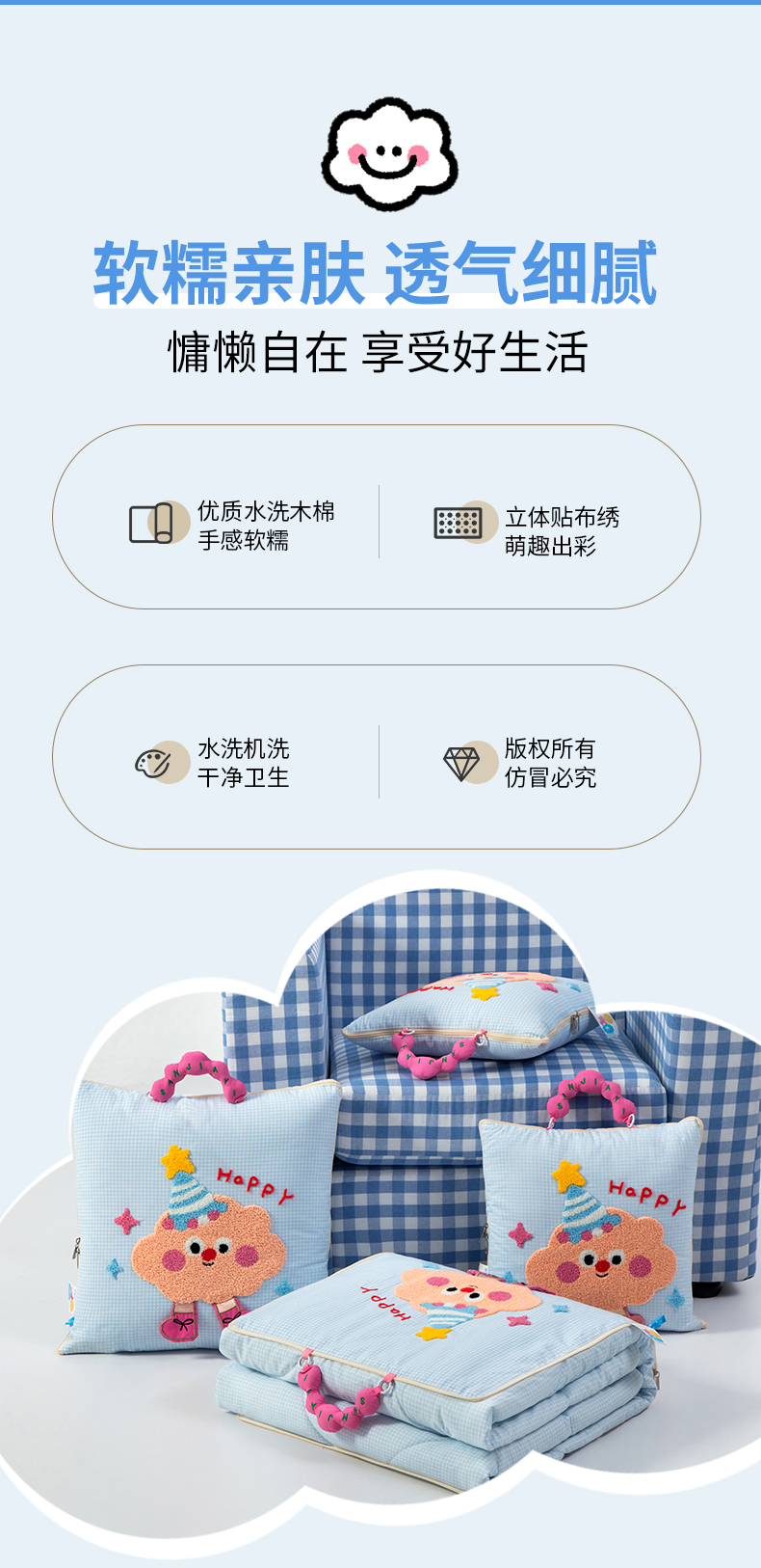 商品名称:雷娜家居 2026新款水洗木棉手提款云朵曲奇抱枕被 云朵蓝