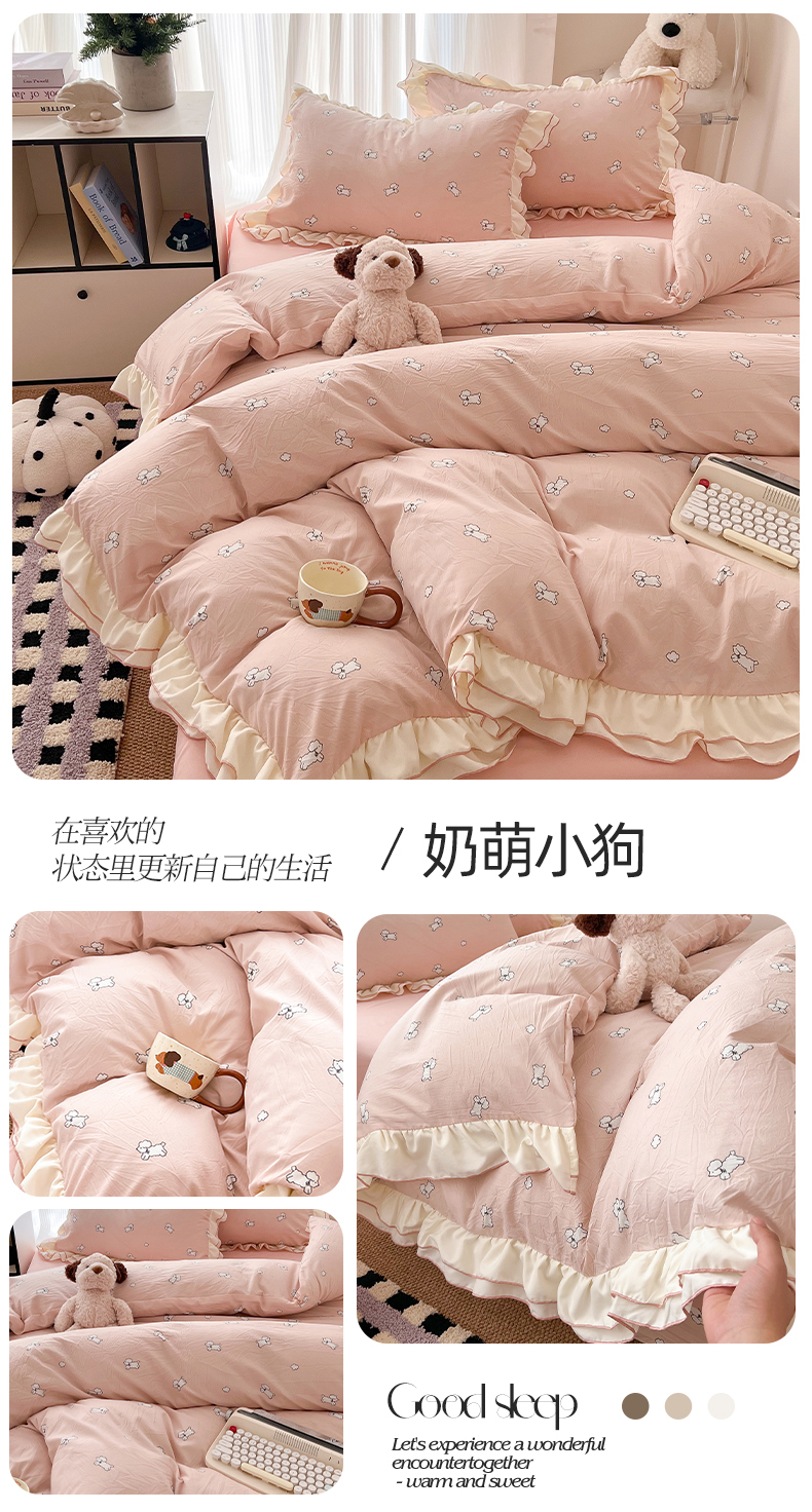 商品名称:吾欢心 2026春夏新款古法水洗仿棉韩版双层花边四件套 奶萌小狗