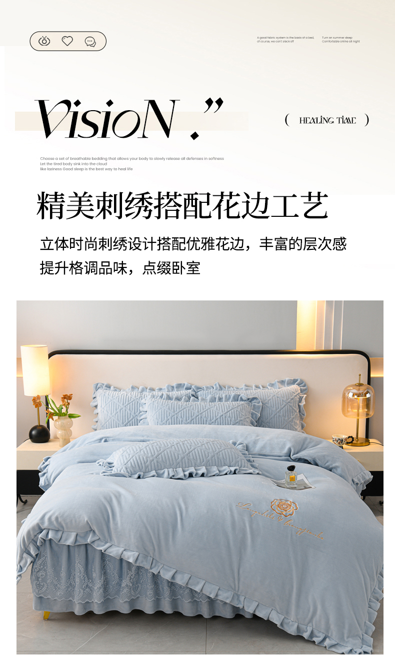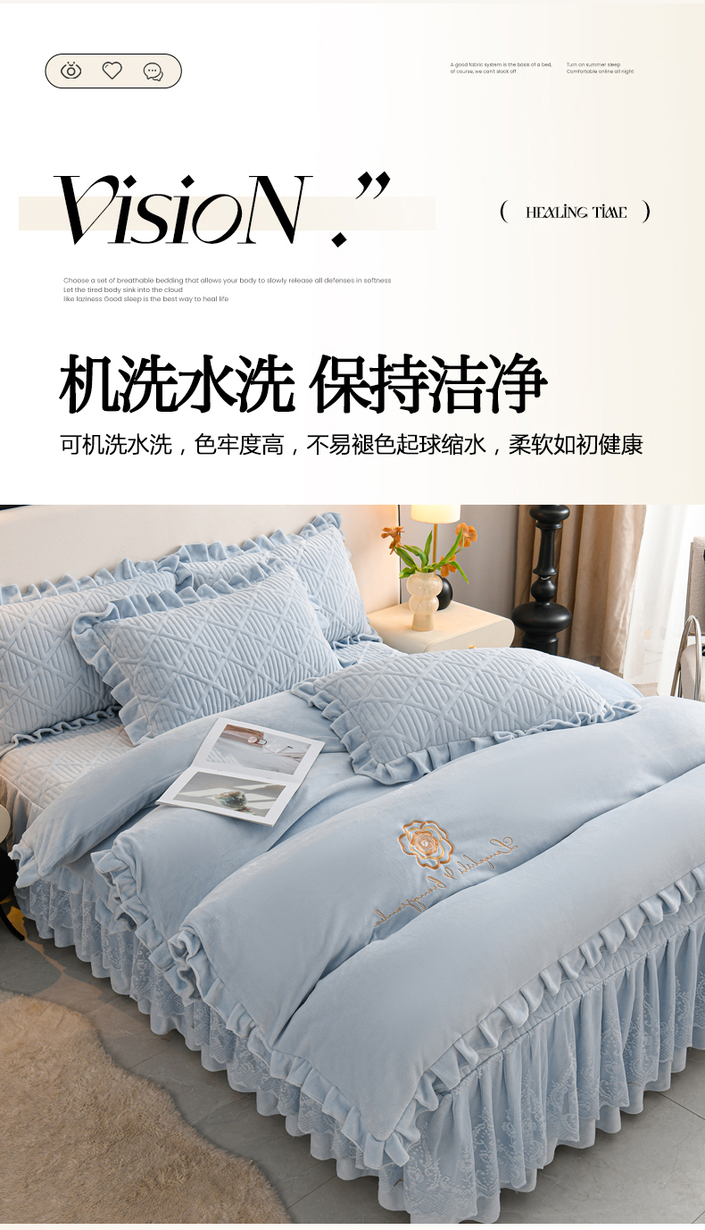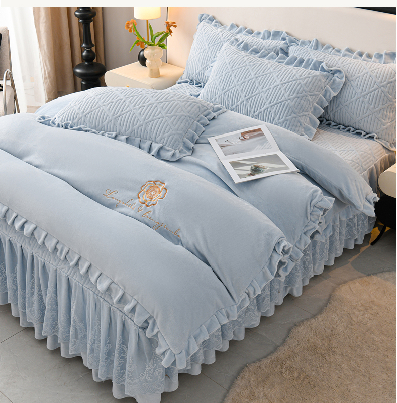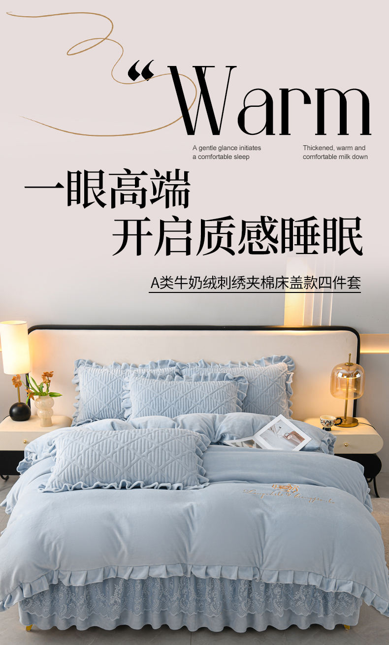 当前位置: 91家纺网 > 商品网购 > 床品套件 > 四件套 > 牛奶绒四件套 > 优家居工厂店 2026新品240克高克重牛奶绒韩版牛奶绒夹棉床裙四件套床裙三件套直播热款-东方韵 东方韵-浅蓝