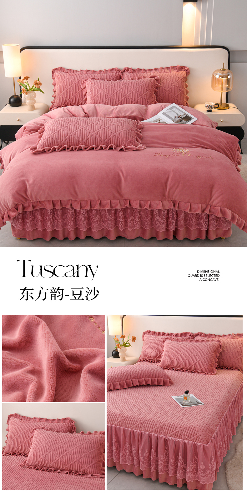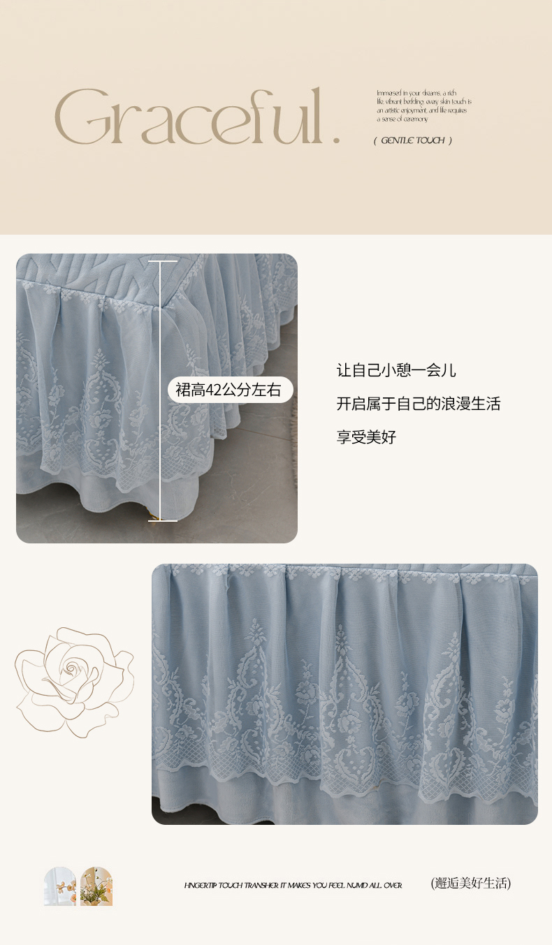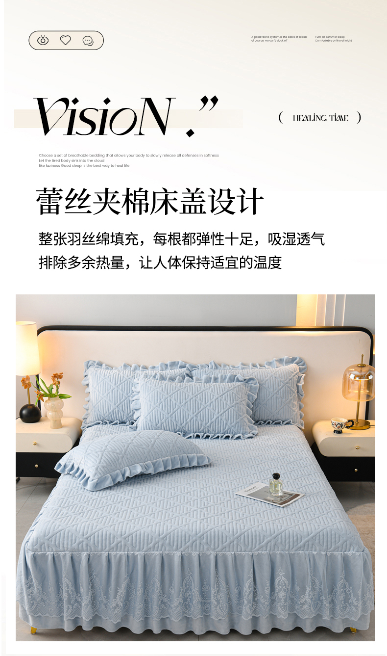 当前位置: 91家纺网 > 商品网购 > 床品套件 > 四件套 > 牛奶绒四件套 > 优家居工厂店 2026新品240克高克重牛奶绒韩版牛奶绒夹棉床裙四件套床裙三件套直播热款-东方韵 东方韵-浅蓝