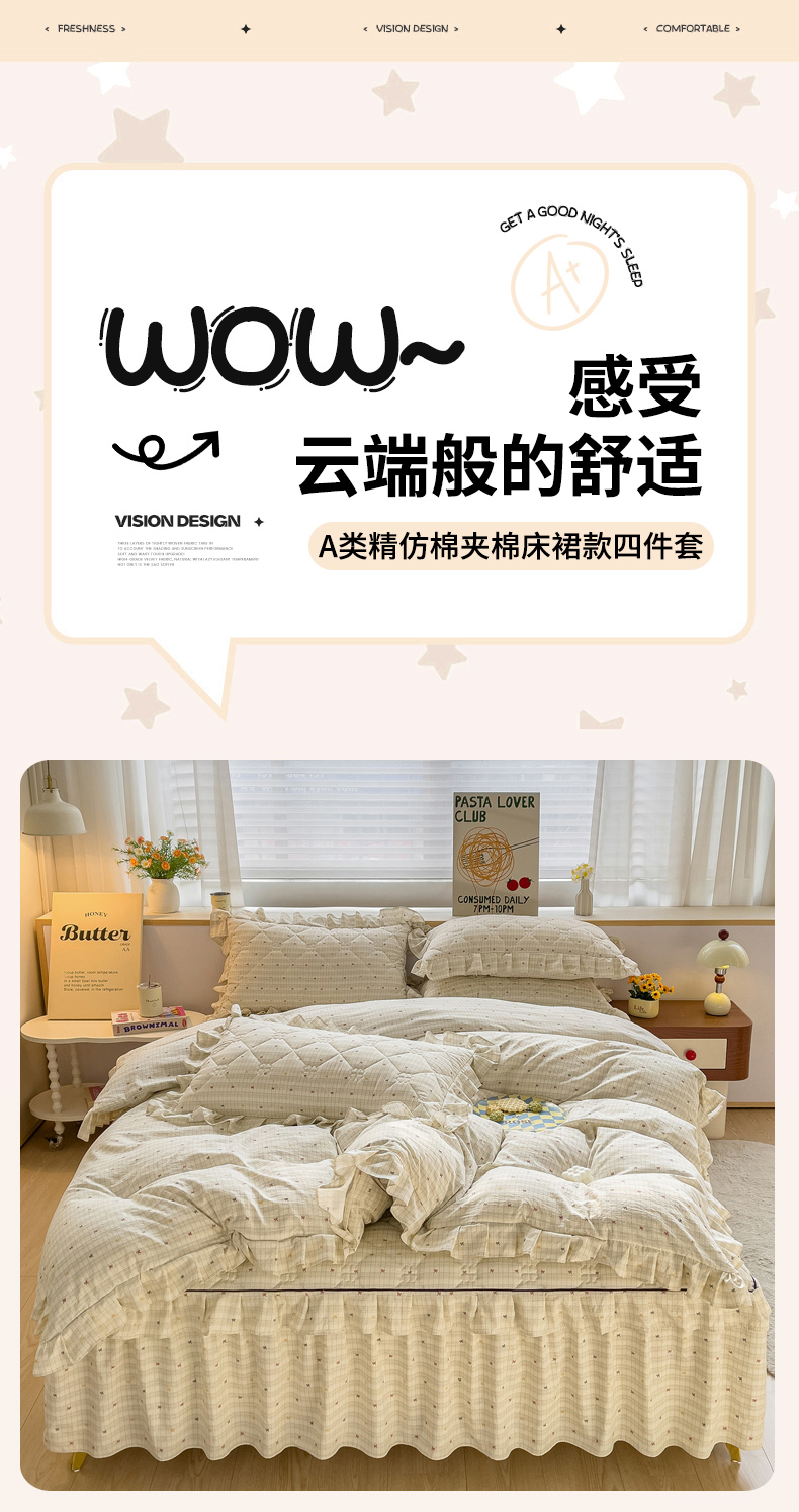 当前位置: 91家纺网 > 商品网购 > 床品套件 > 四件套 > 化纤普通四件套 > 优家居 2026新款精仿棉夹棉床裙四件套水洗棉韩版公主风花边床裙被套直播外贸定制 北岛之恋