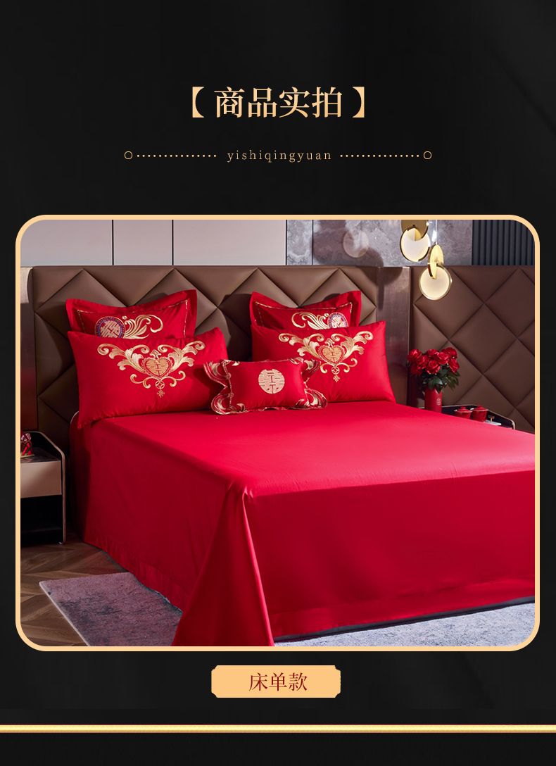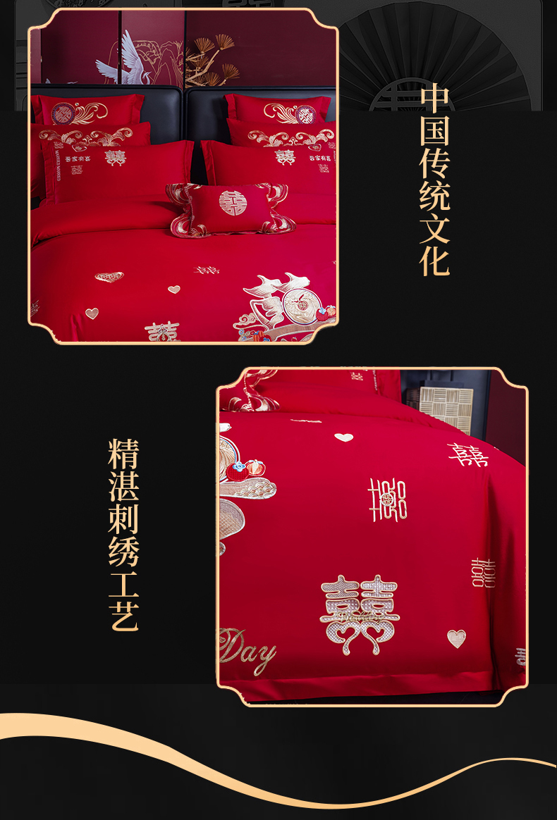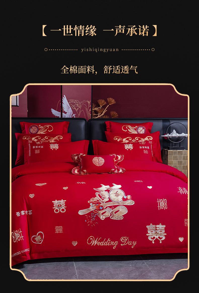 当前位置: 91家纺网 > 商品网购 > 床品套件 > 四件套 > 婚庆四件套 > 慕她家纺 2026年全棉纯棉婚庆四件套大红色刺绣结床上用品 大喜日子