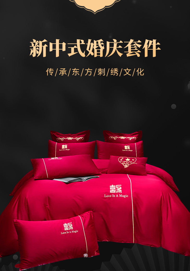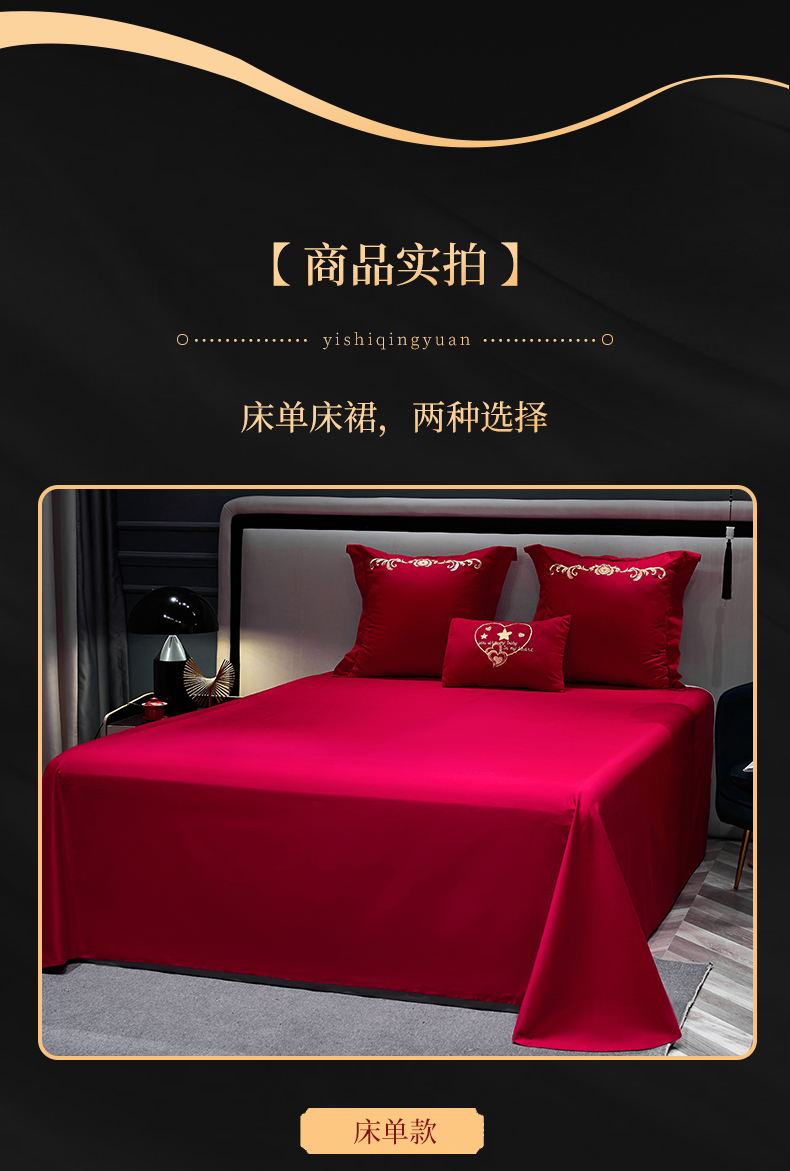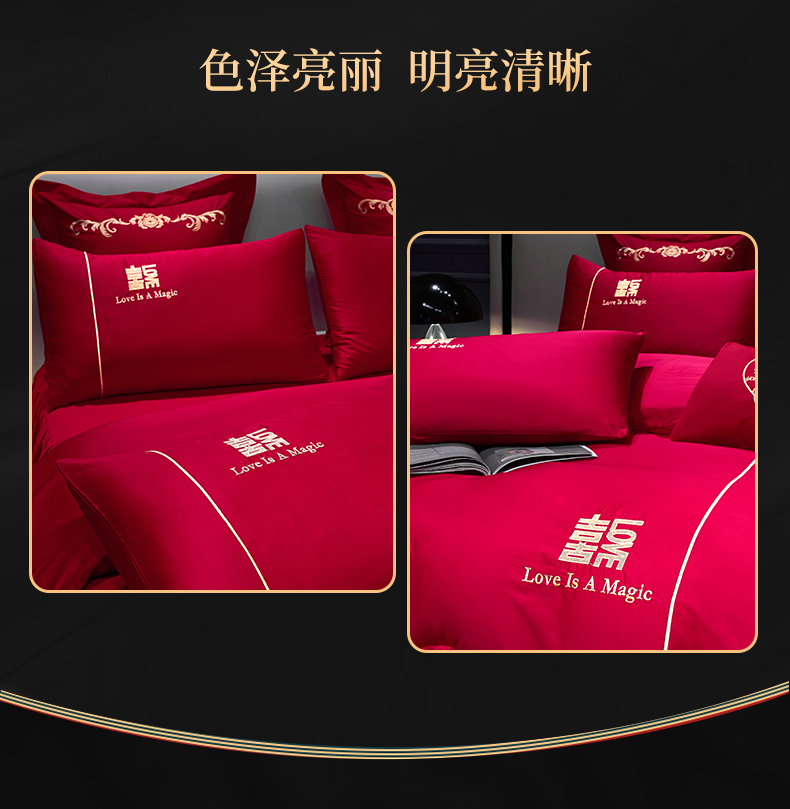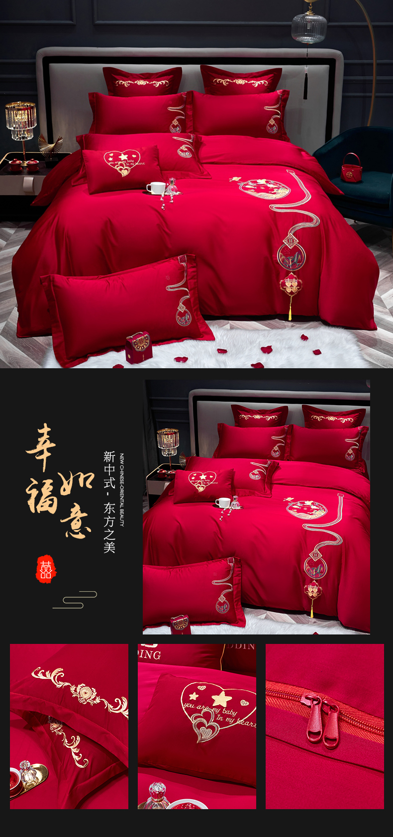 当前位置: 91家纺网 > 商品网购 > 床品套件 > 四件套 > 婚庆四件套 > 慕她家纺 2026年磨毛亲肤棉婚庆四件套大红色刺绣结床上用品 一见钟情