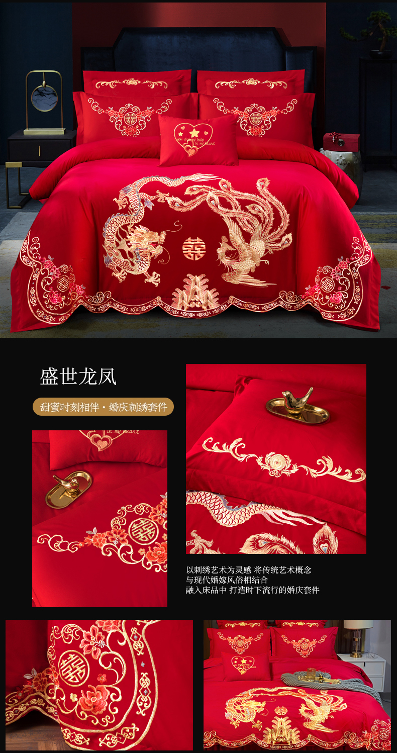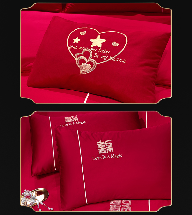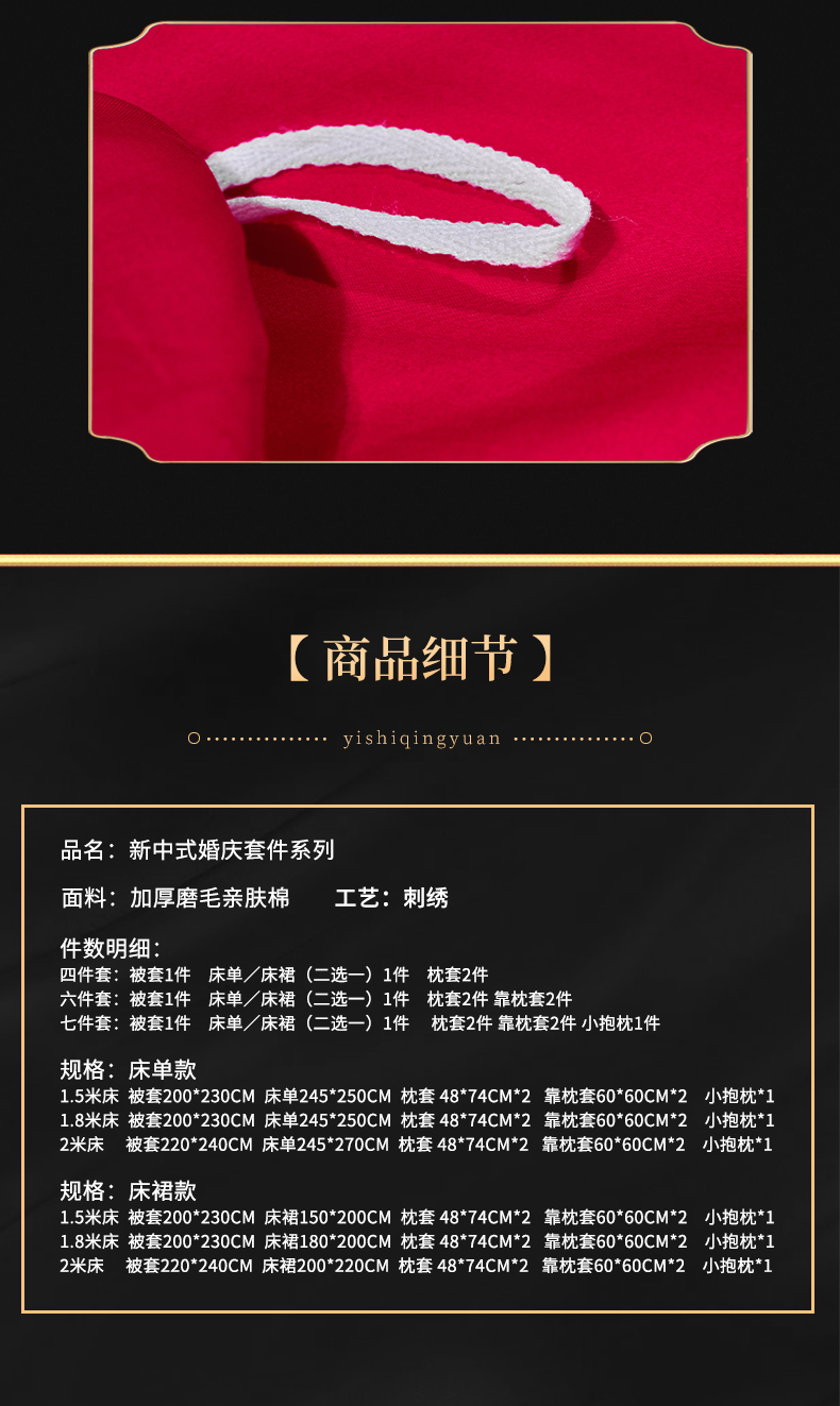 当前位置: 91家纺网 > 商品网购 > 床品套件 > 四件套 > 婚庆四件套 > 慕她家纺 2026年磨毛亲肤棉婚庆四件套大红色刺绣结床上用品 一见钟情