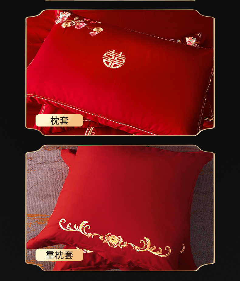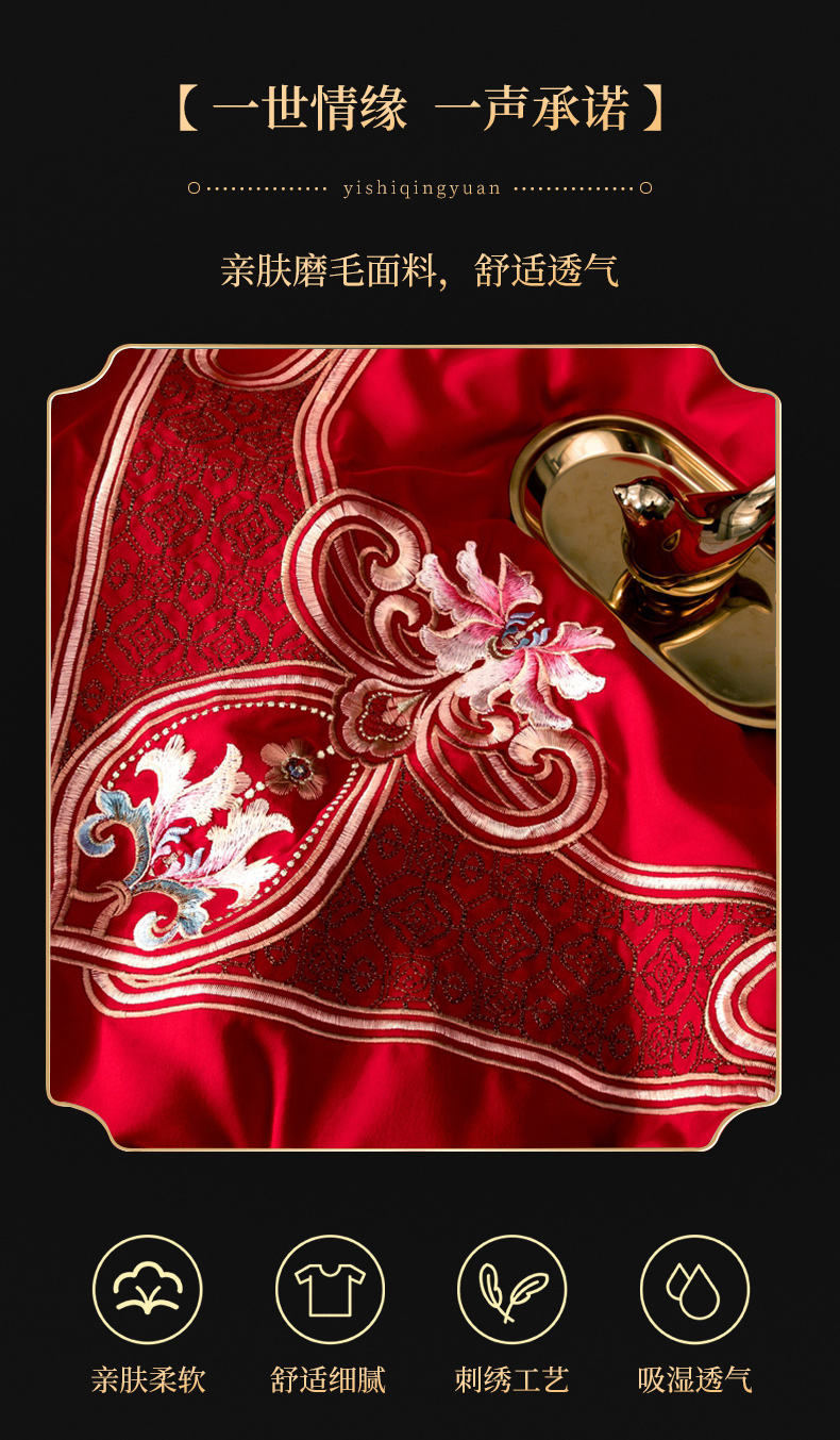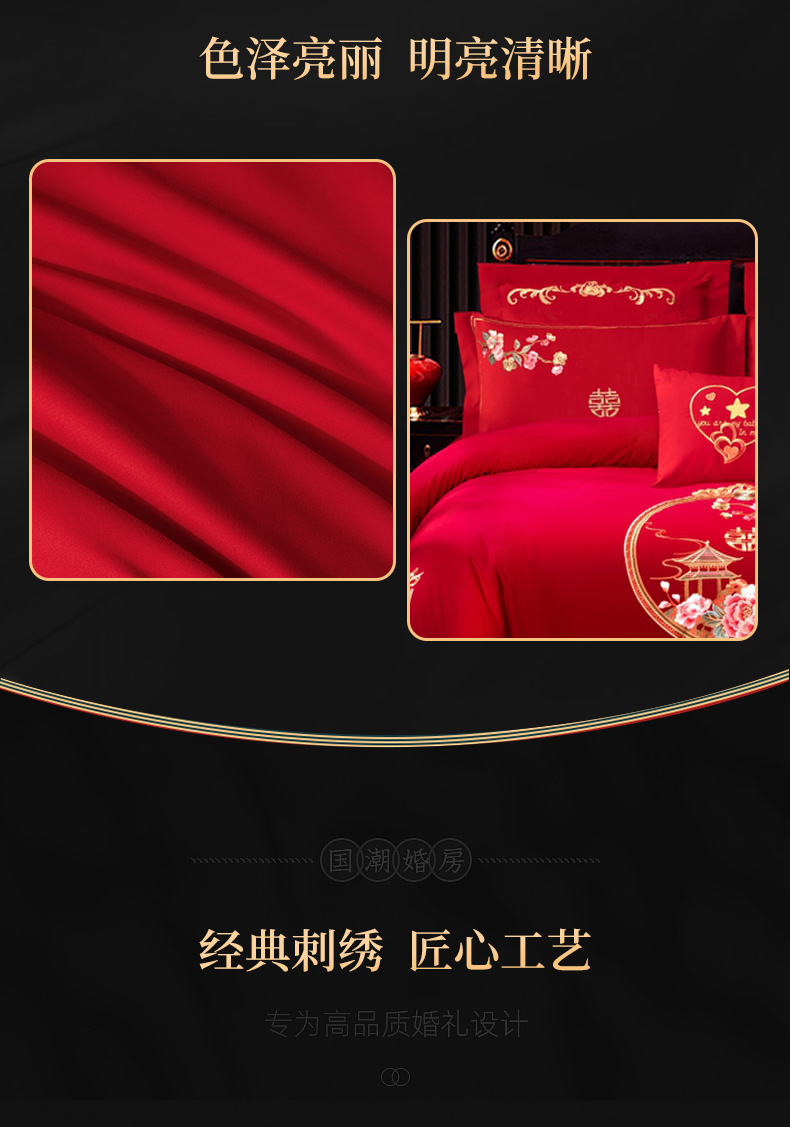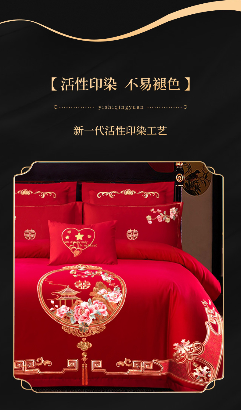 当前位置: 91家纺网 > 商品网购 > 床品套件 > 四件套 > 婚庆四件套 > 慕她家纺 2026年磨毛亲肤棉婚庆四件套大红色刺绣结床上用品 幸福满园