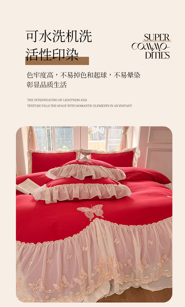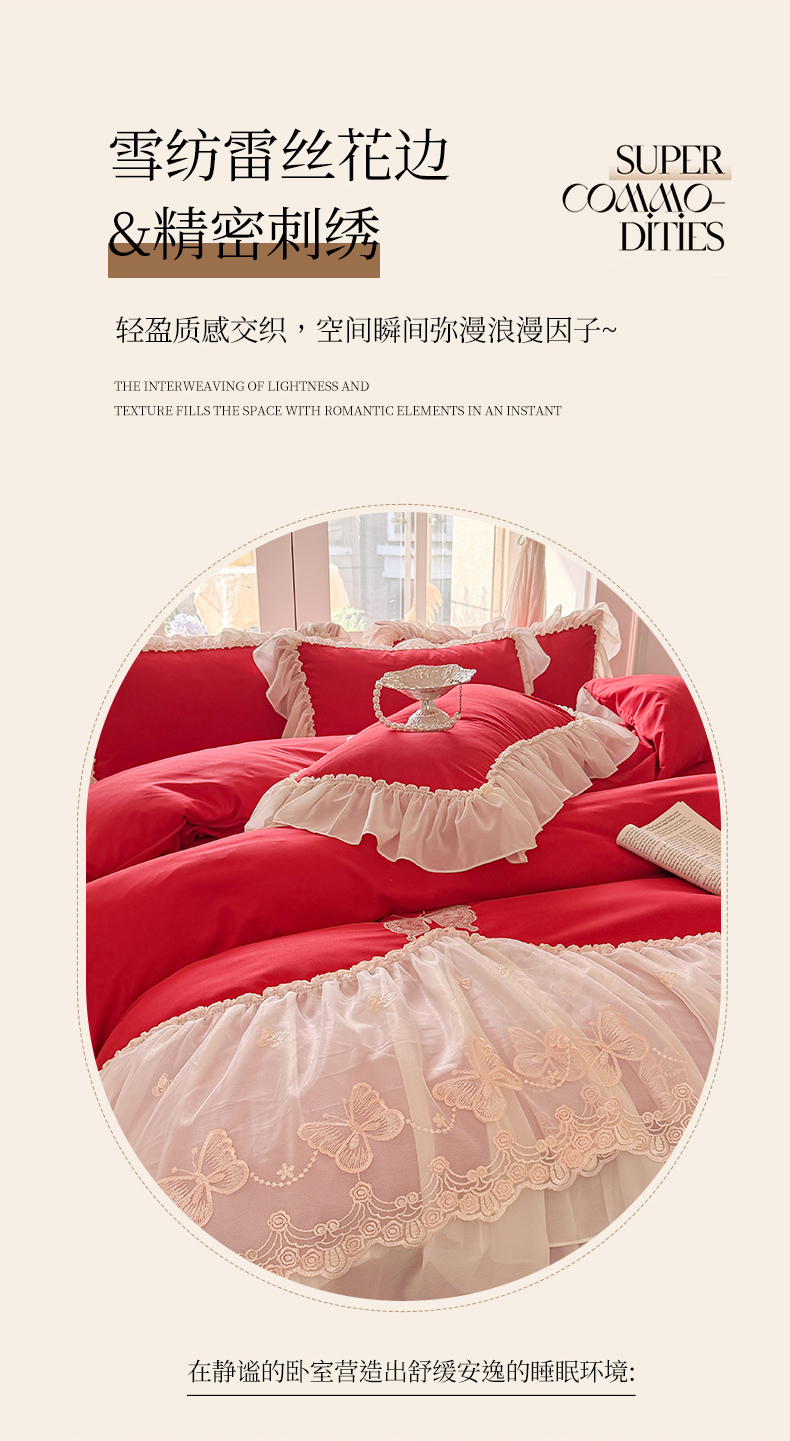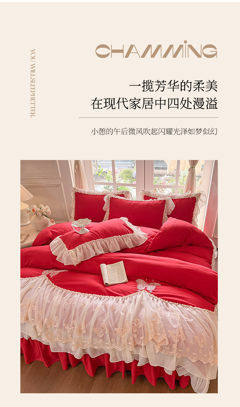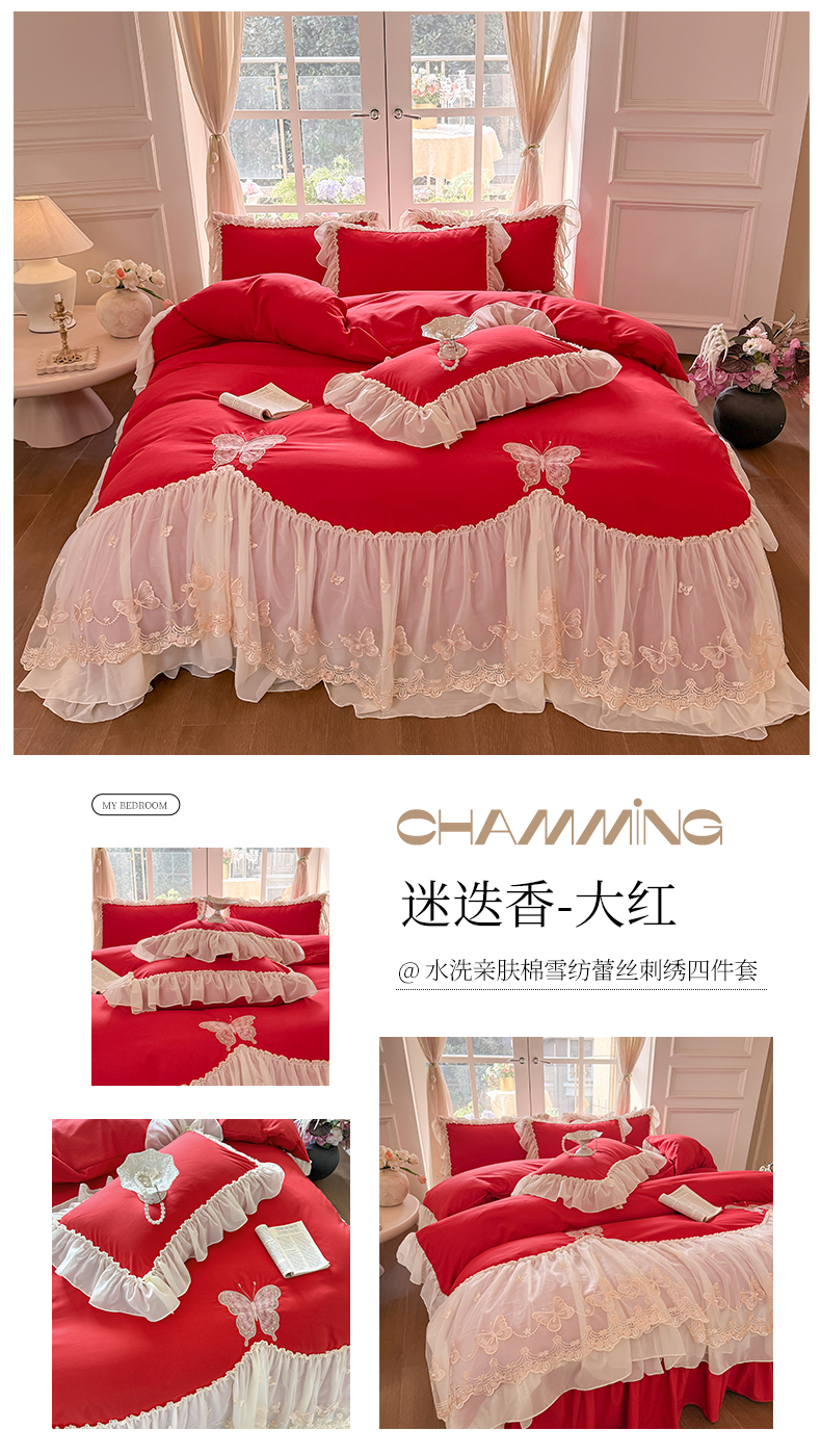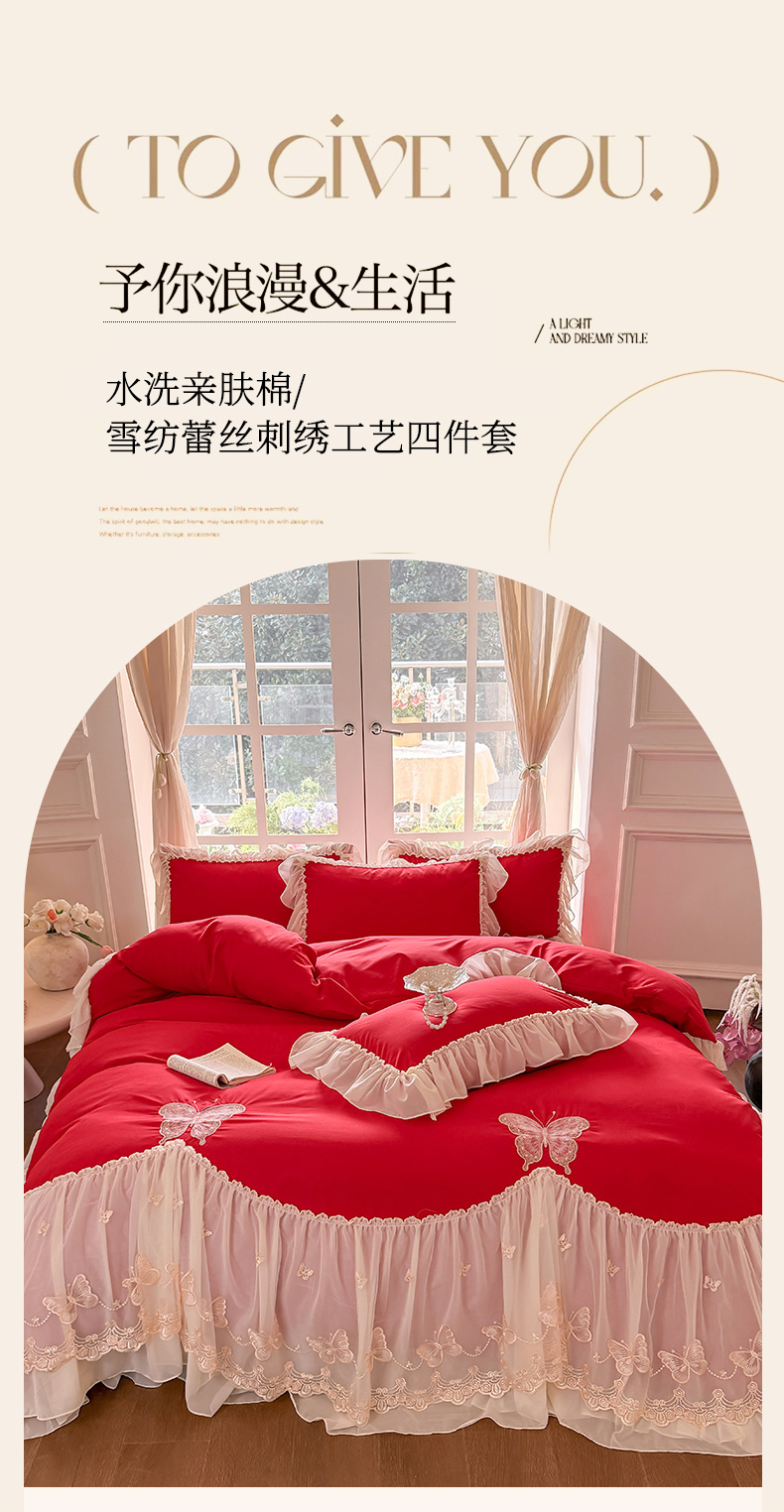 当前位置: 91家纺网 > 商品网购 > 床品套件 > 四件套 > 水洗棉四件套 > 富盛家纺 2026新款水洗亲肤棉雪纺蕾丝刺绣公主风韩版四件套-迷迭香 迷迭香—大红