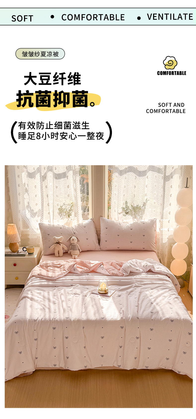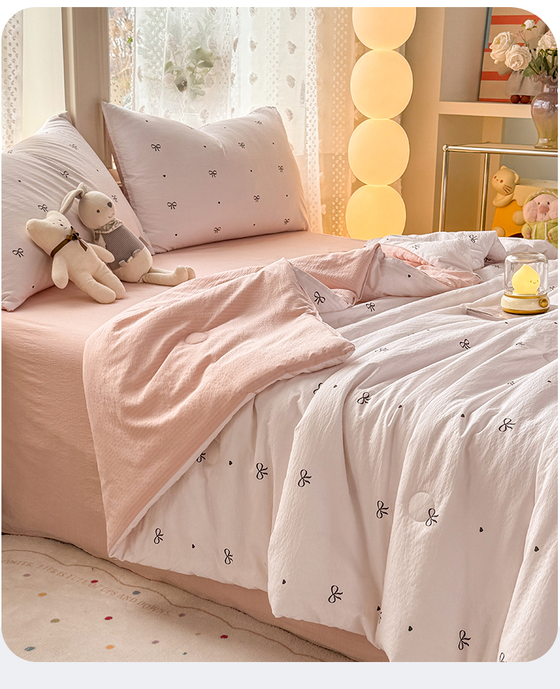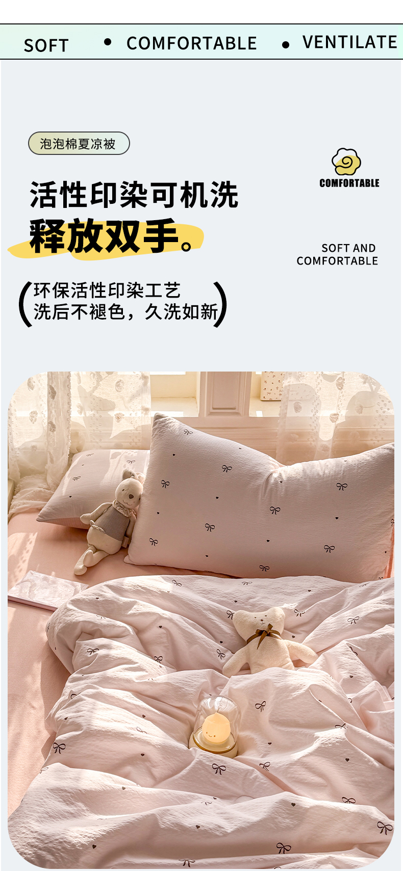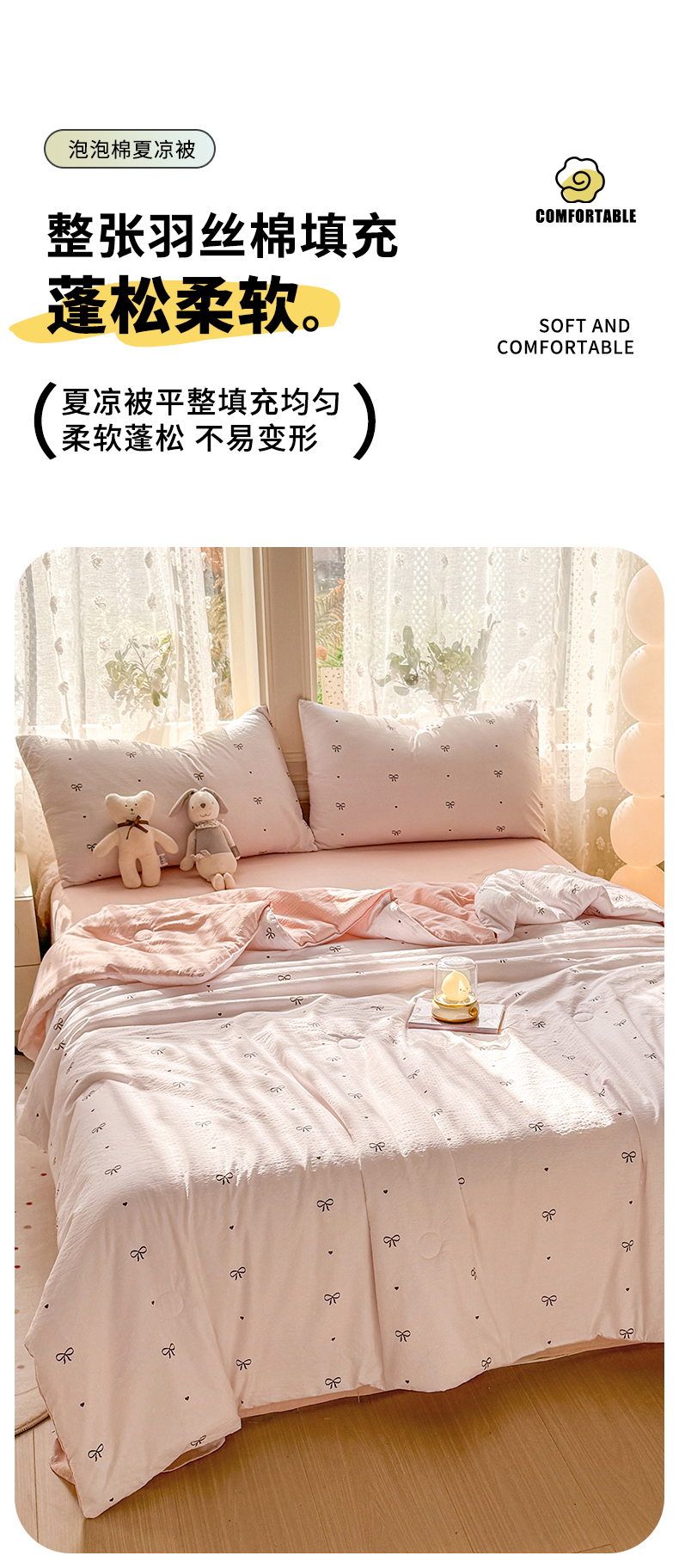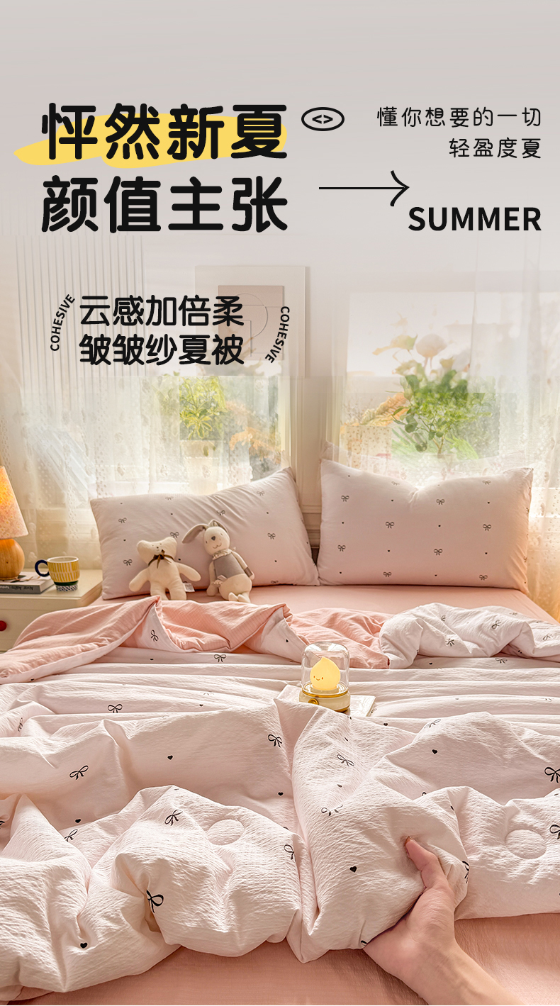 • 91家纺网 家纺一手货源 找家纺 丽美人家纺 2026春夏新款简单款皱皱纱夏被夏凉被空调被 粉色蝴蝶结