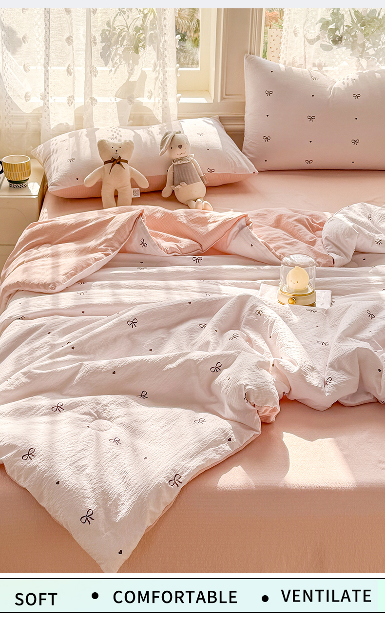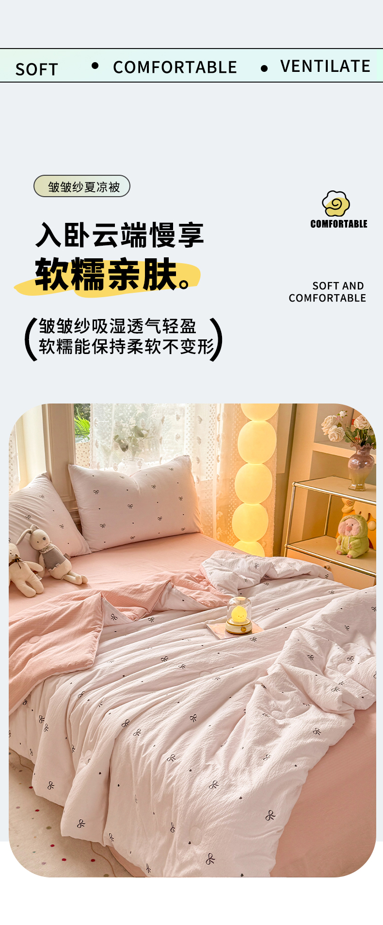 丽美人家纺 2026春夏新款简单款皱皱纱夏被夏凉被空调被 粉色蝴蝶结
