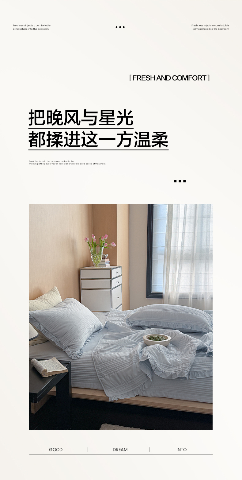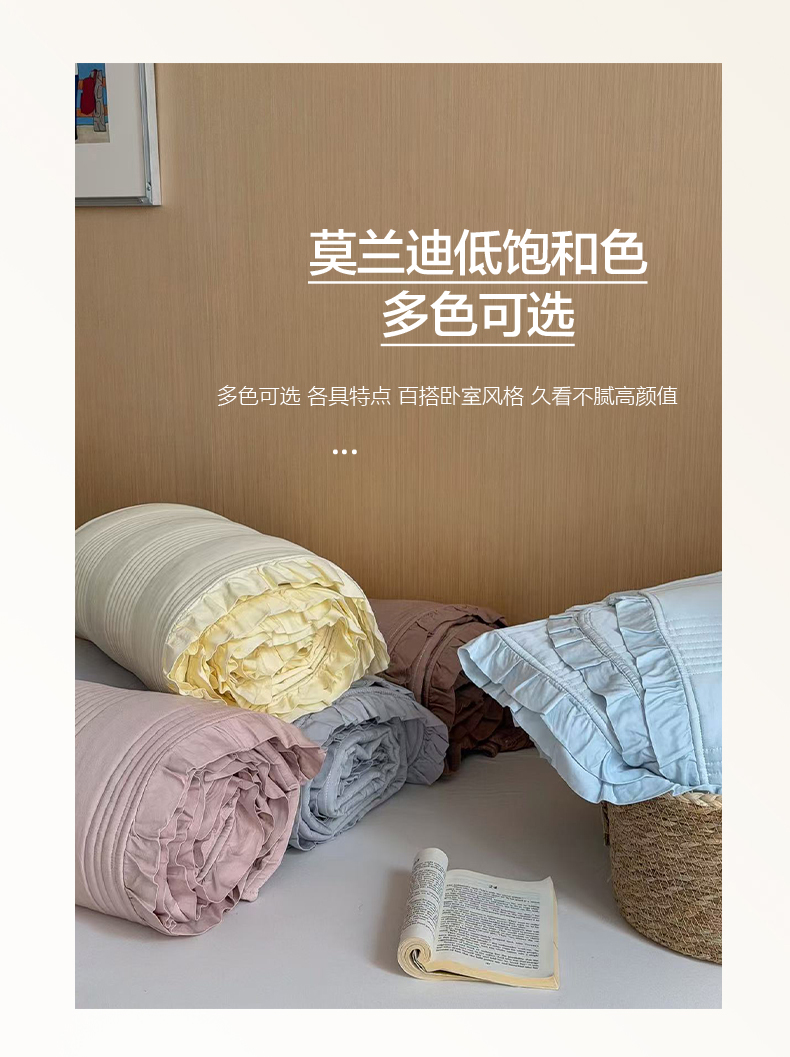 (总)漫调家纺 2026春夏新品双面棉麻法式荷叶边高温水洗夏被可配夏被四件套床单床盖四件套(夏被四件套咨询微信),粉雾花甸,蓝雾花影,奶杏枝蔓,青枝野果,组合