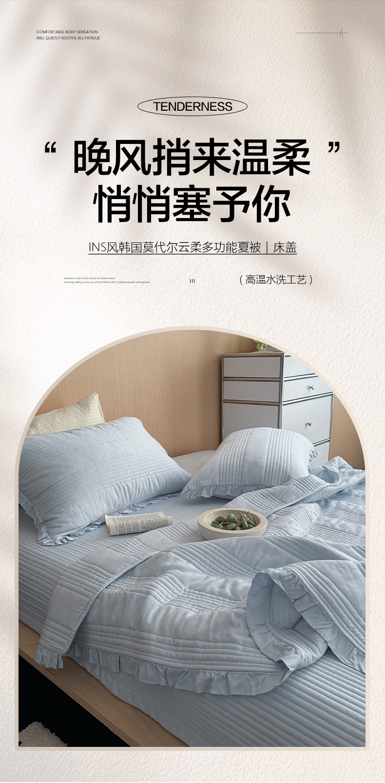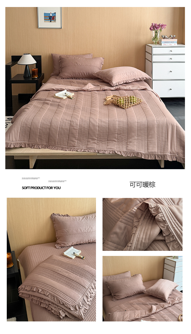 (总)漫调家纺 2026新款韩国莫代尔夏被床盖系列-花边款,海盐蓝,可可暖棕,奶杏,柔粉,雾灰