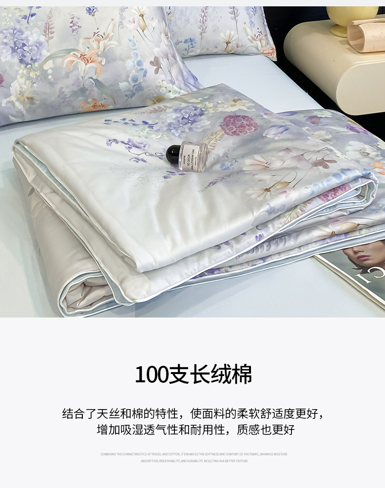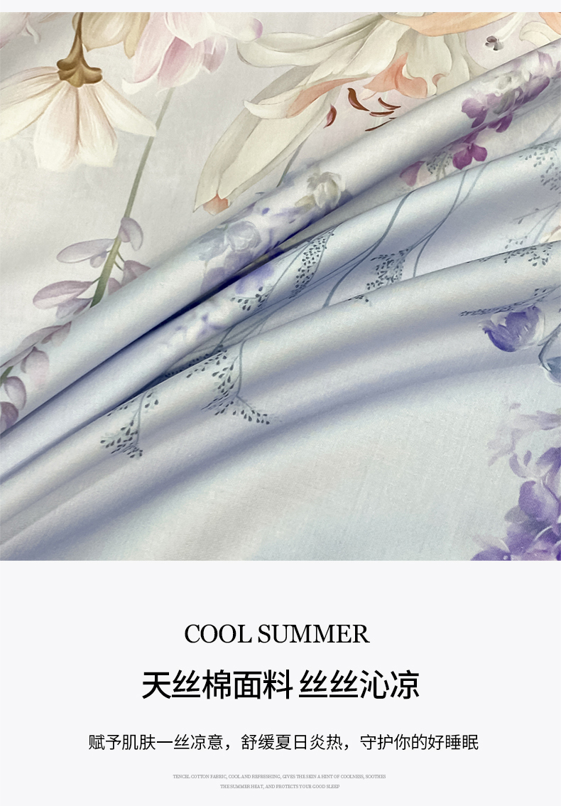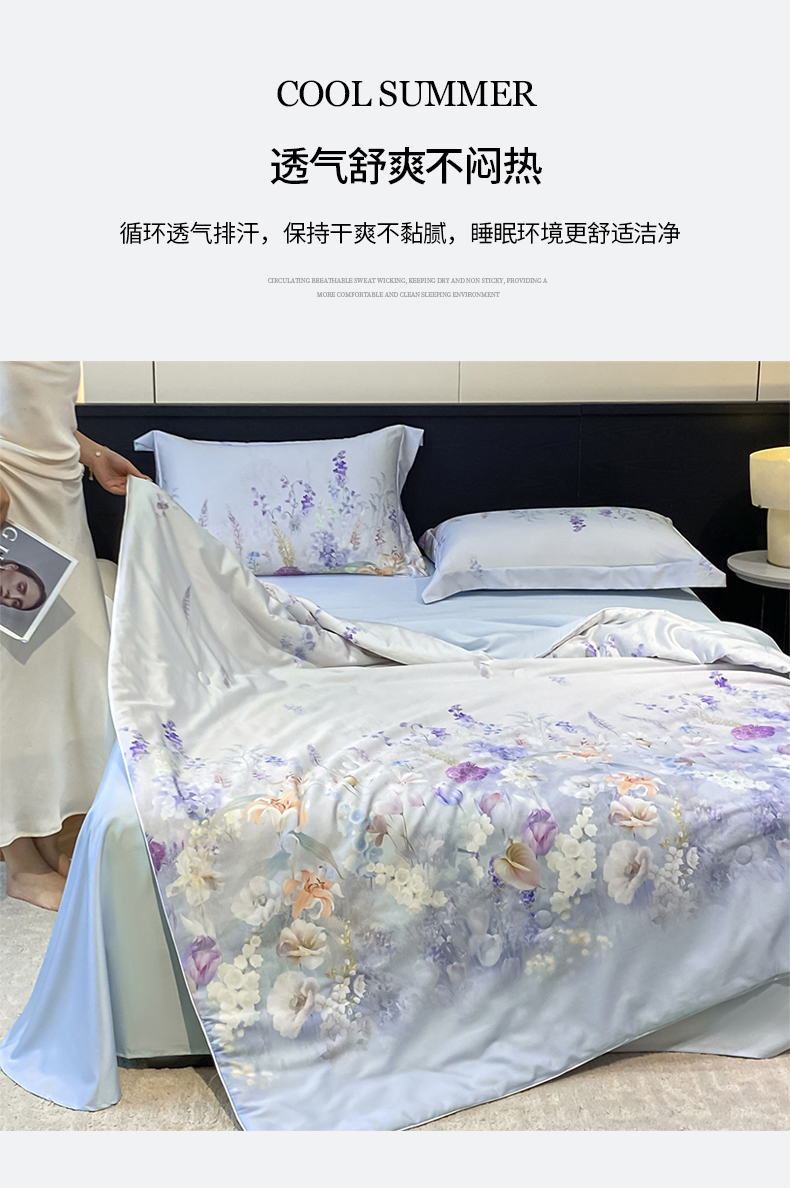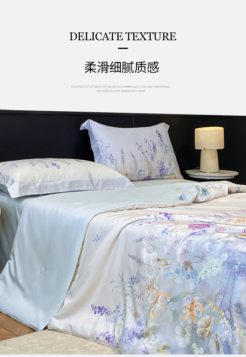 当前位置: 91家纺网 > 商品网购 > 床品套件 > 四件套 > 其它四件套 > 新方向 【控价 提供买家秀】2026新款数码印花A类20%蚕丝天丝棉夏被四件套-那些花儿 那些花儿-微光蓝
