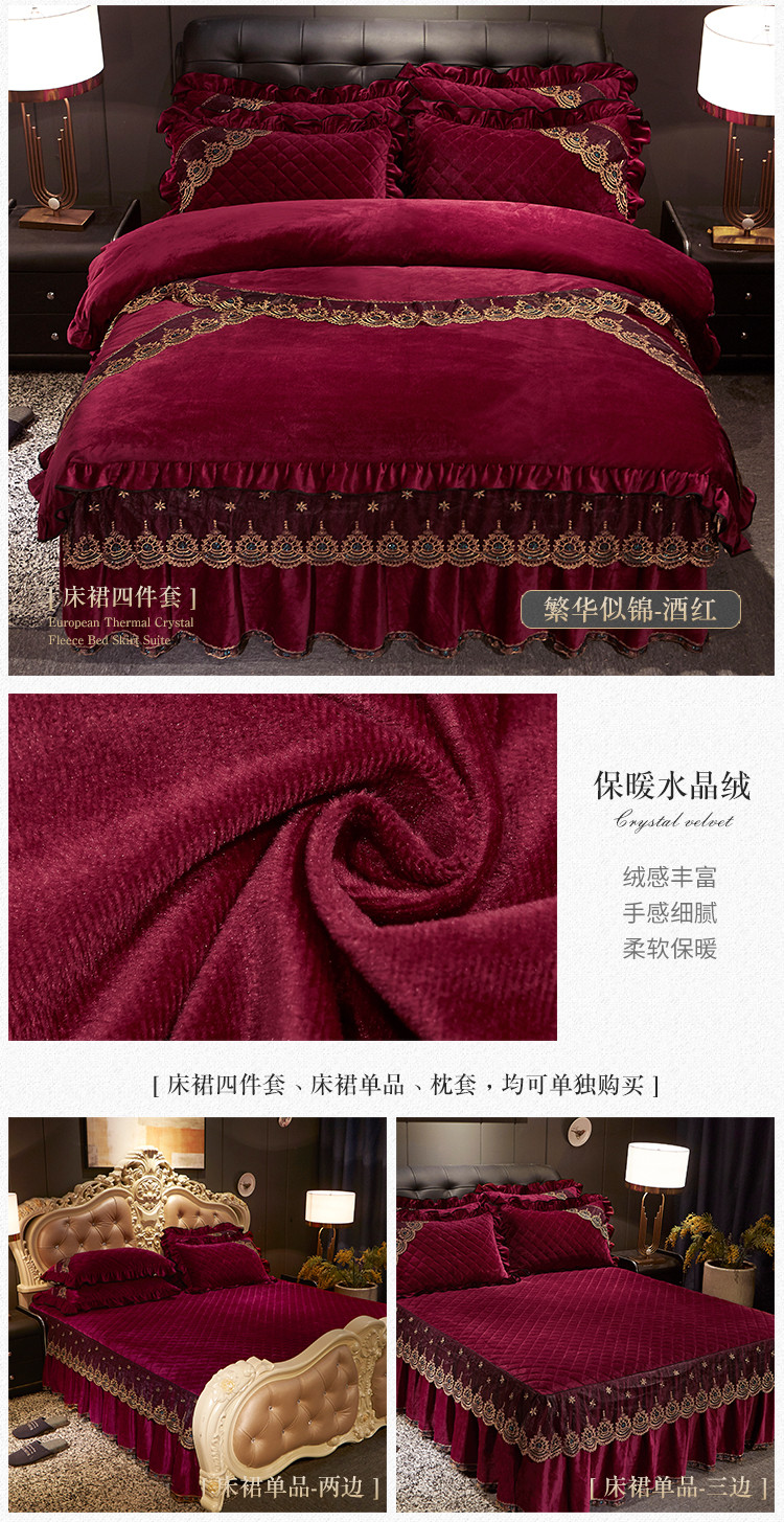 (总)宜凡家纺 2025新款婴儿绒压花全夹棉床裙四件套,韵雅-中国红,韵雅-黑天鹅