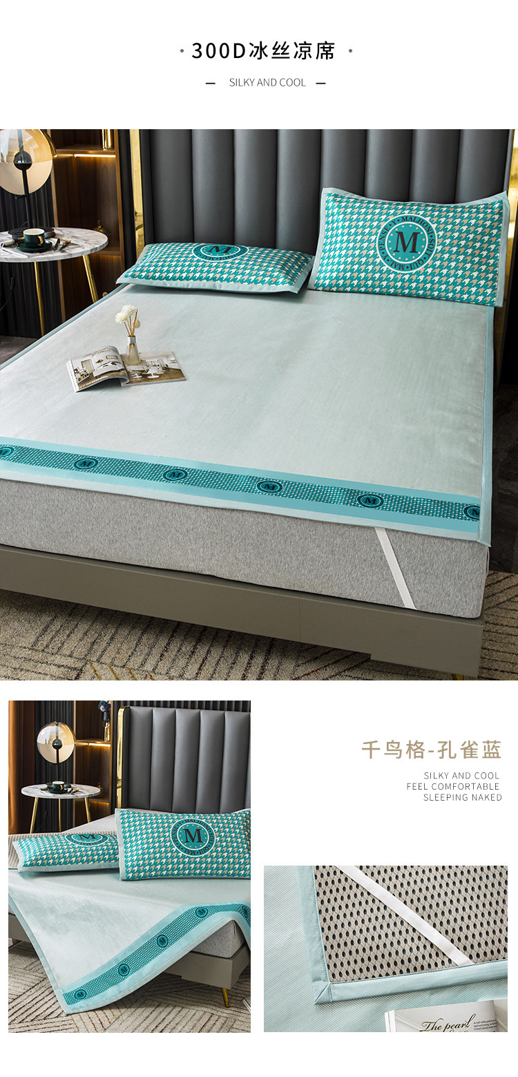 商品名称:小芽家居 2024新款千鸟格冰丝凉席三件套 千鸟格-孔雀蓝