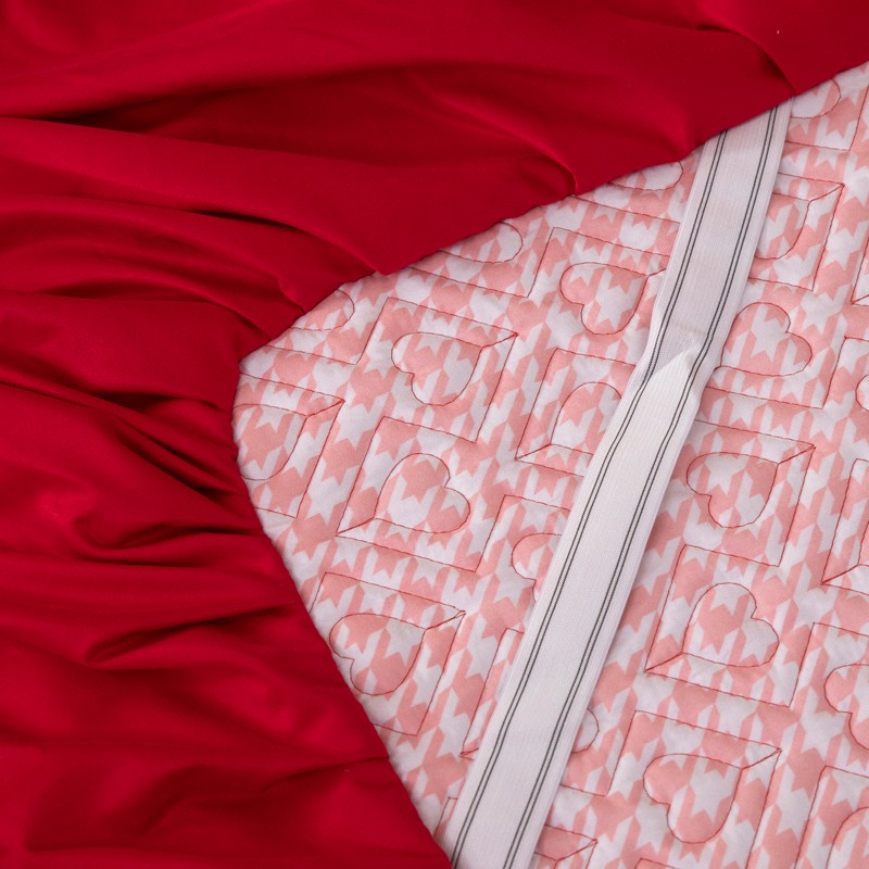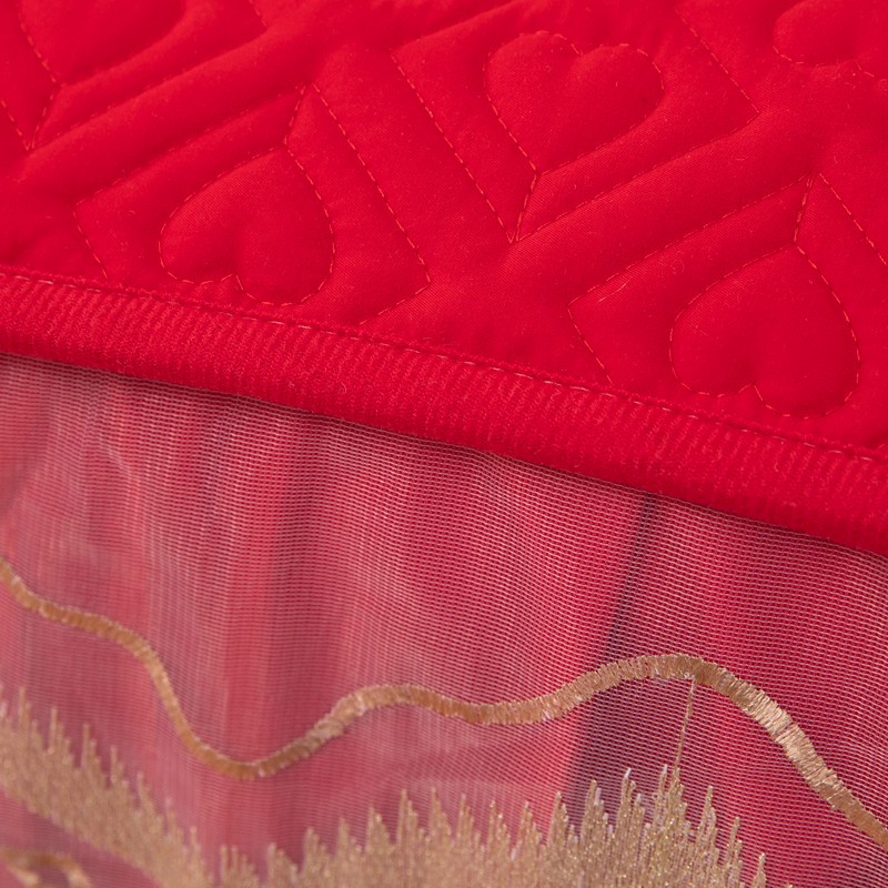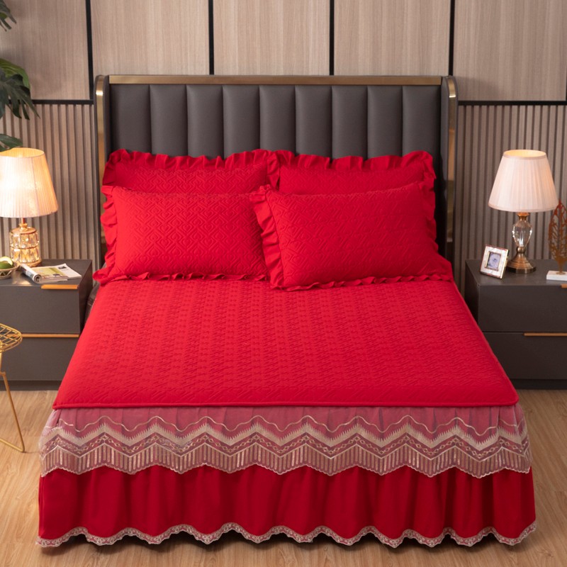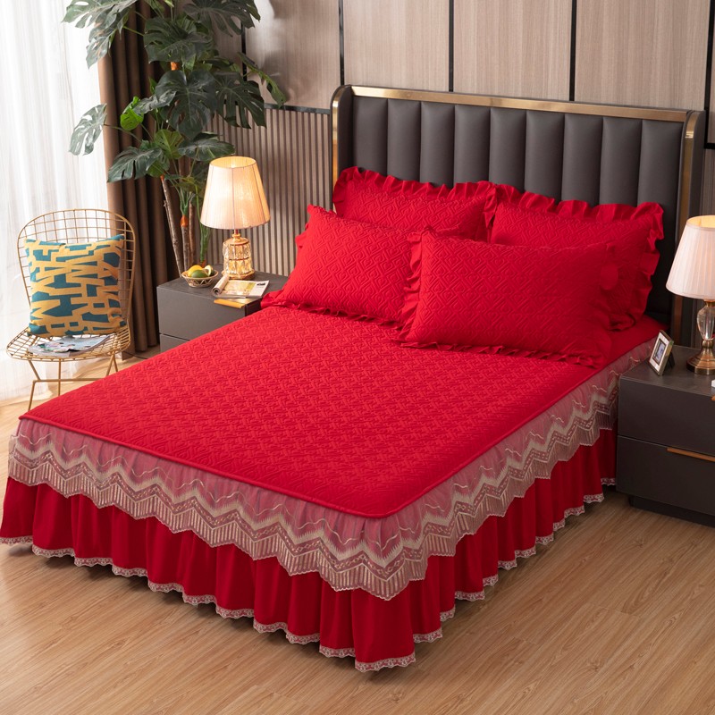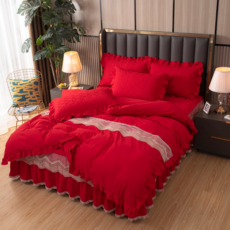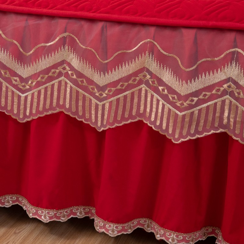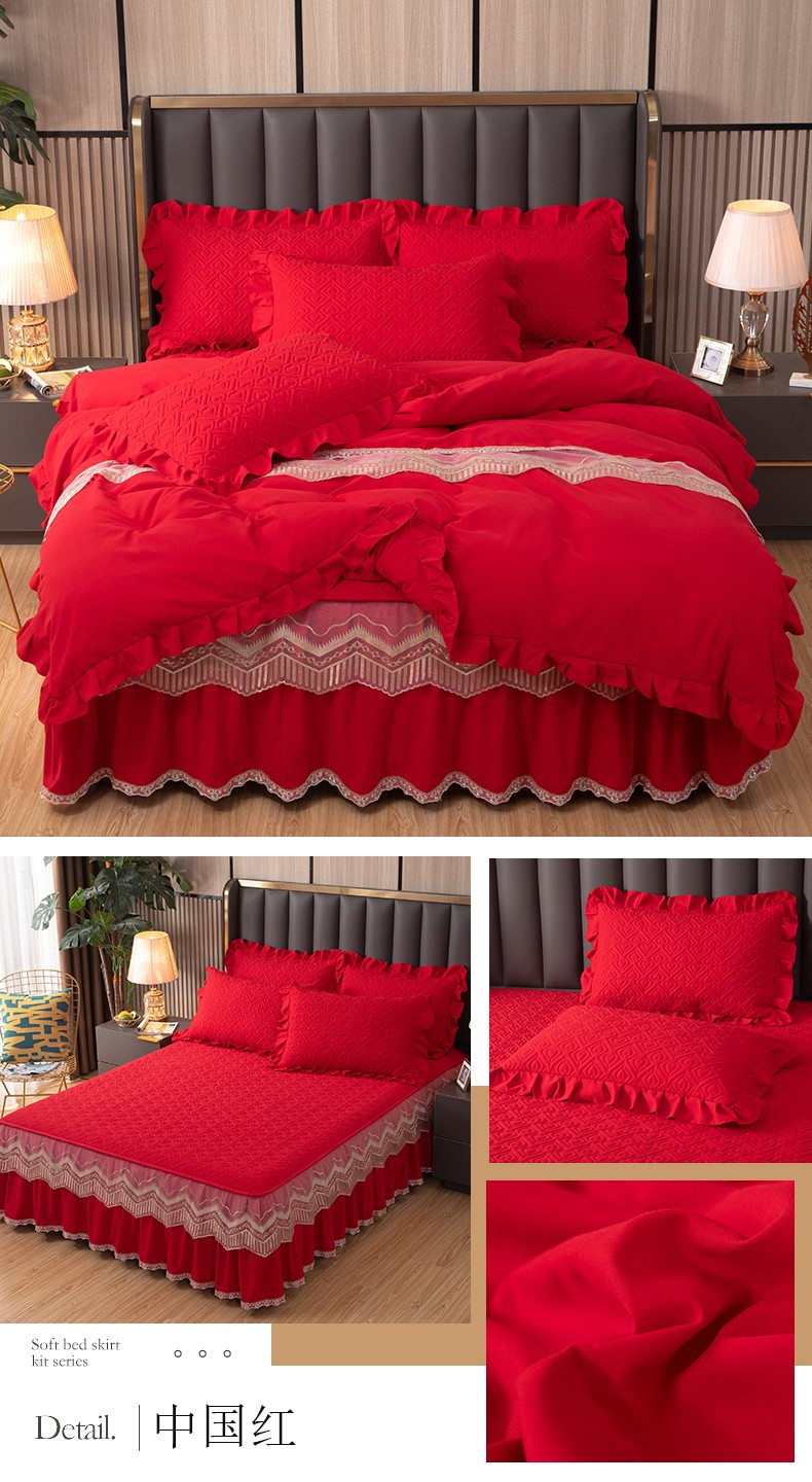 木兰花 新款 超柔氧棉加厚磨毛韩版蕾丝夹棉四件套床裙款中国红