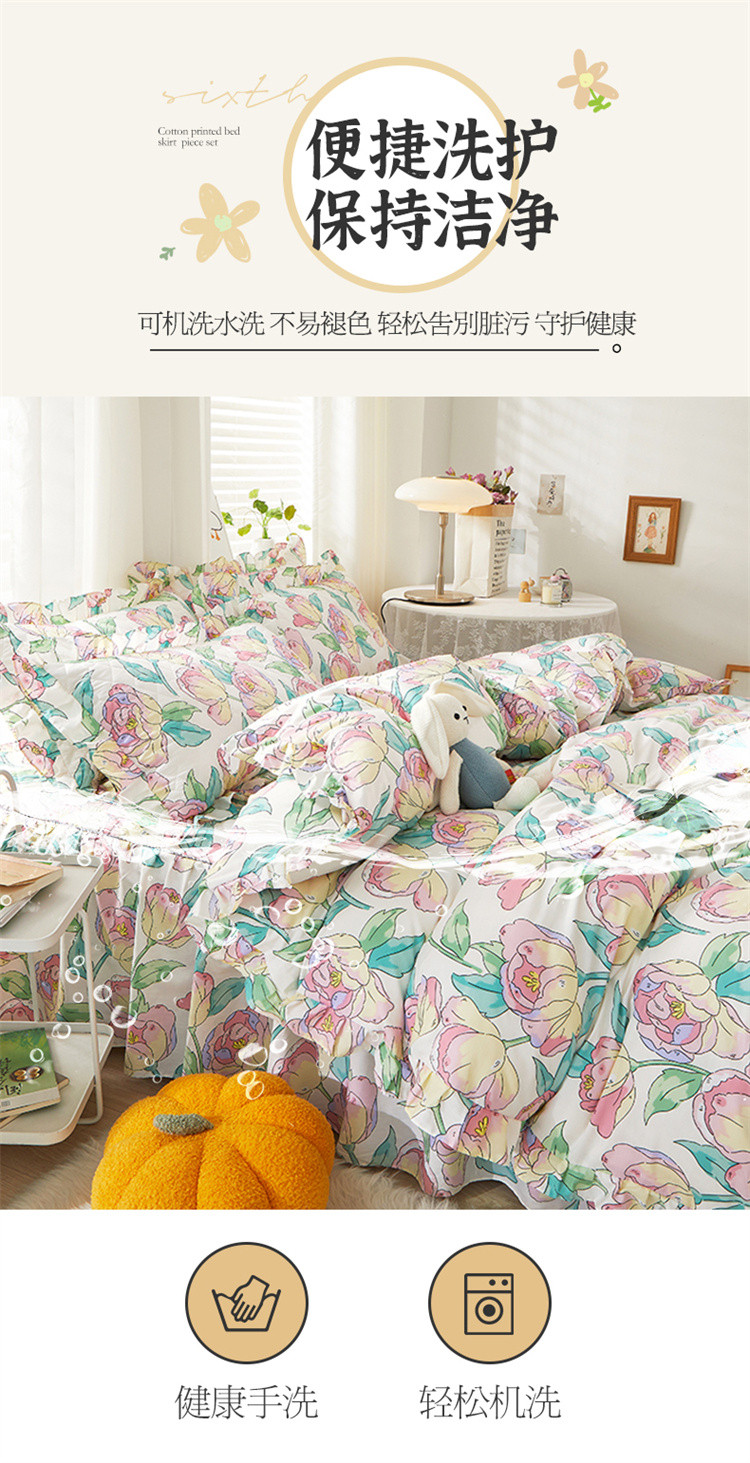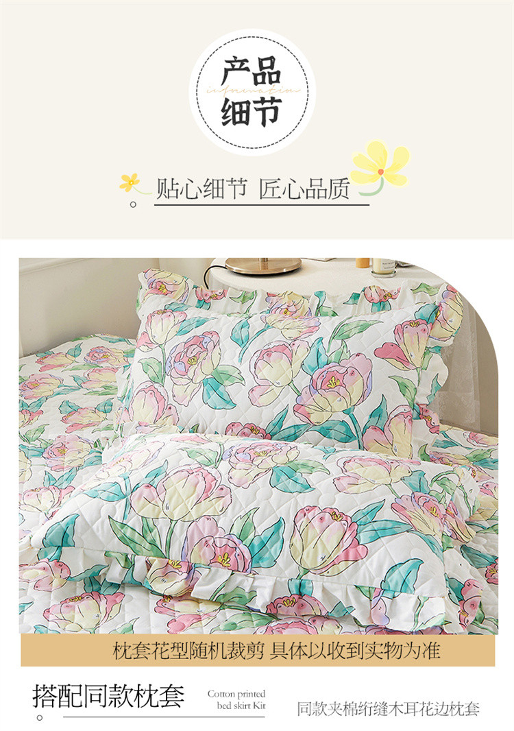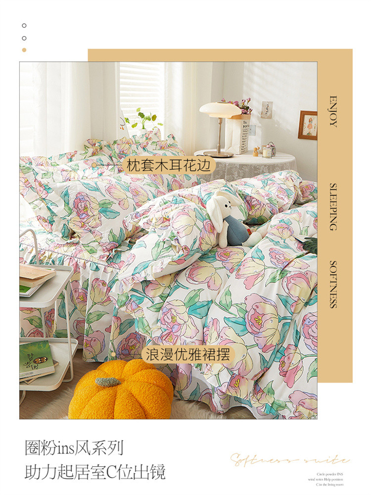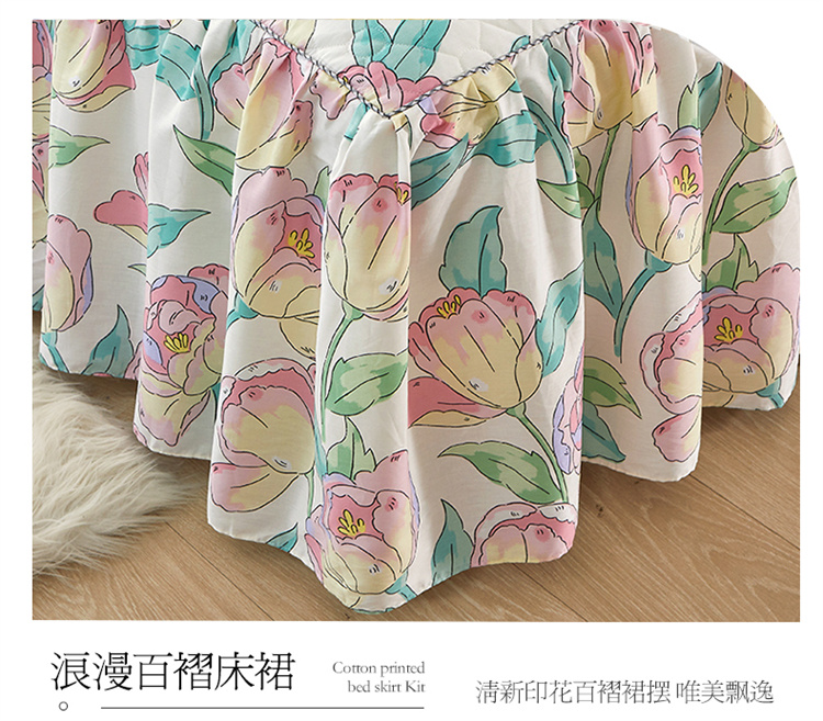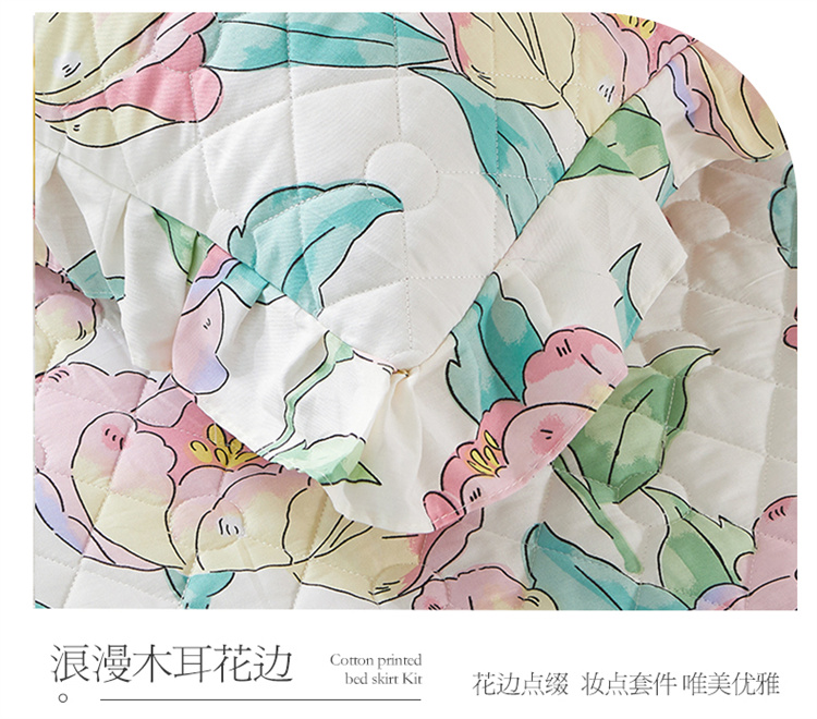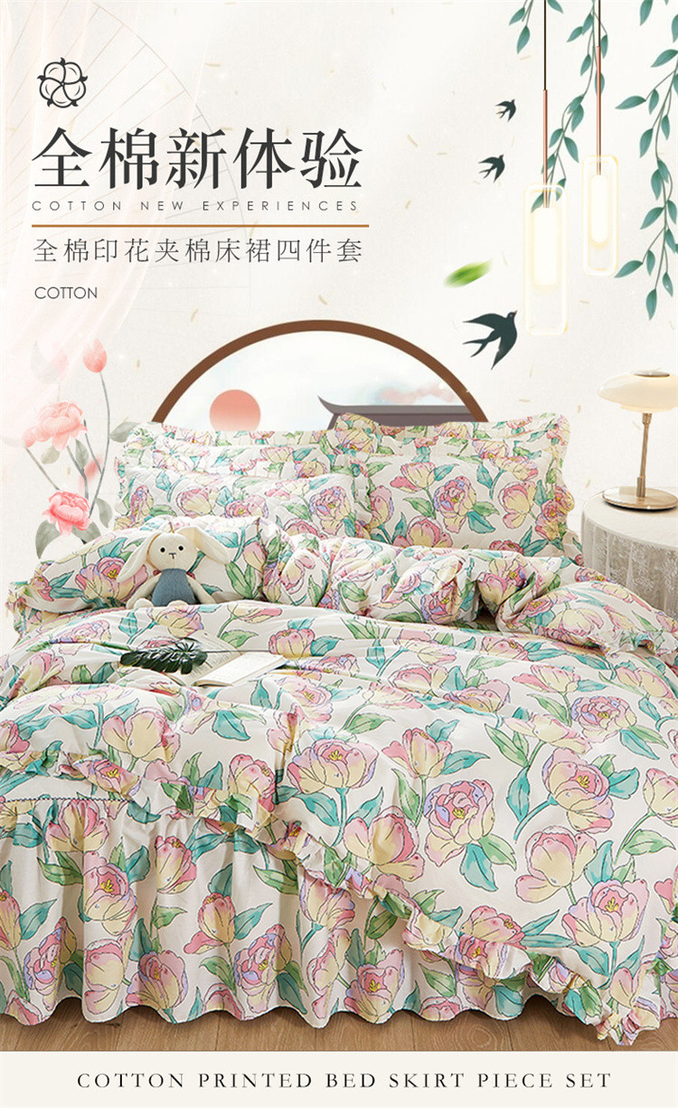 当前位置: 91家纺网 > 商品网购 > 床品套件 > 四件套 > 全棉普通四件套 > 十个点 2022新款全棉夹棉印花床裙四件套 花影
