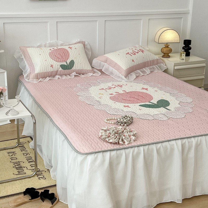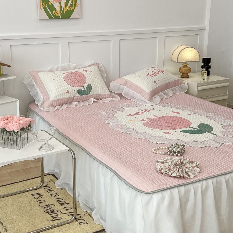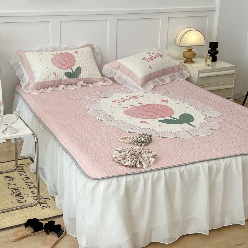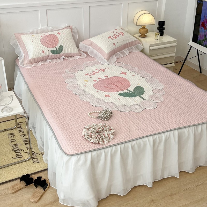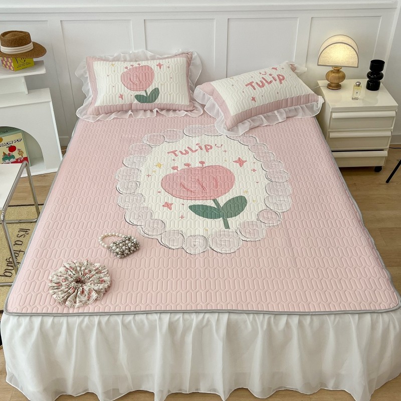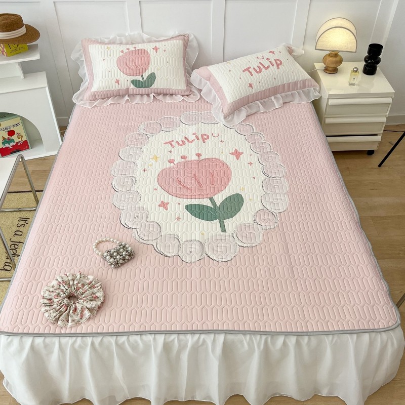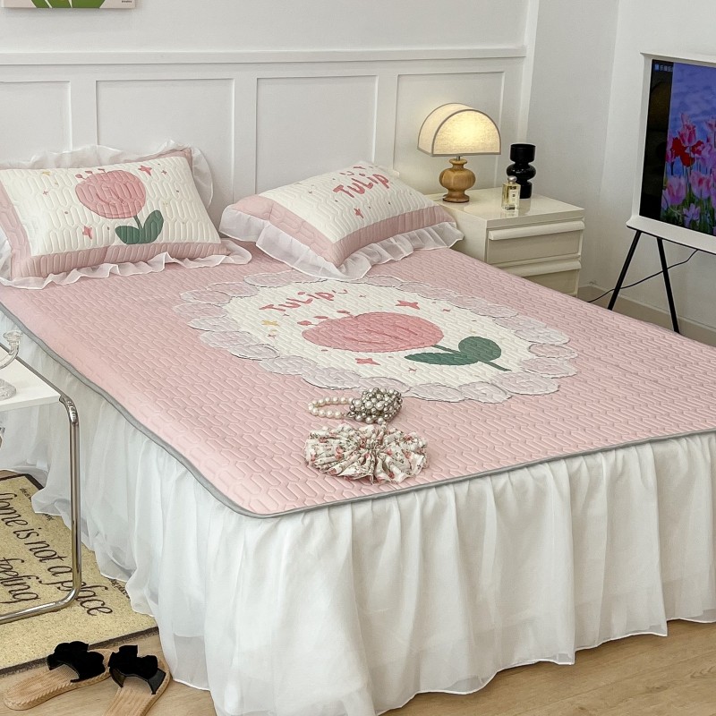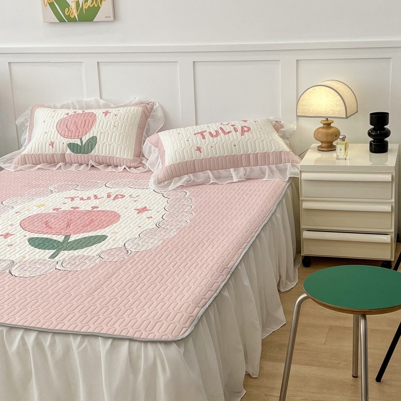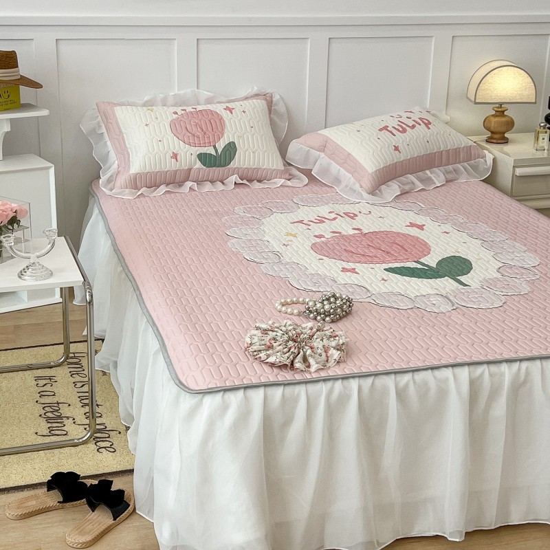 昔可 2022新款ins风小清新床裙款乳胶凉席三件套 床裙款-粉圈郁金香