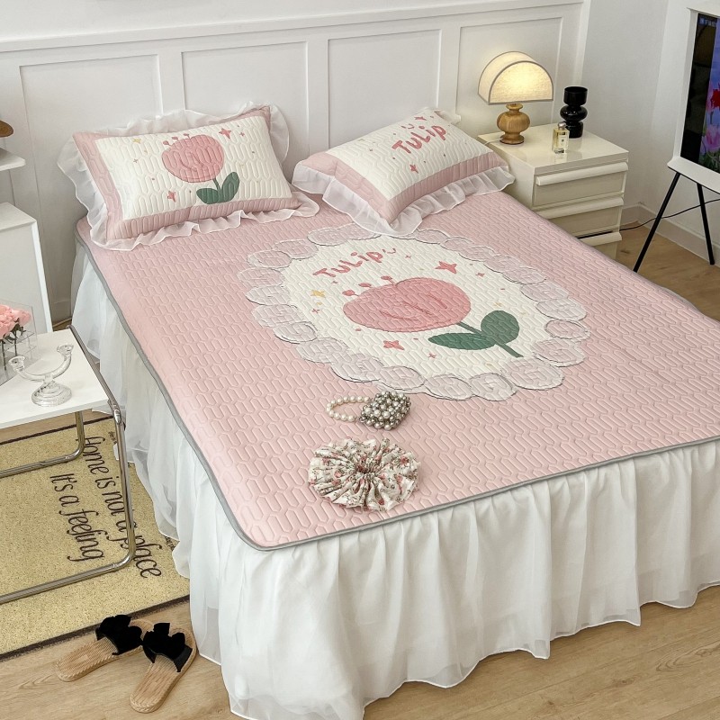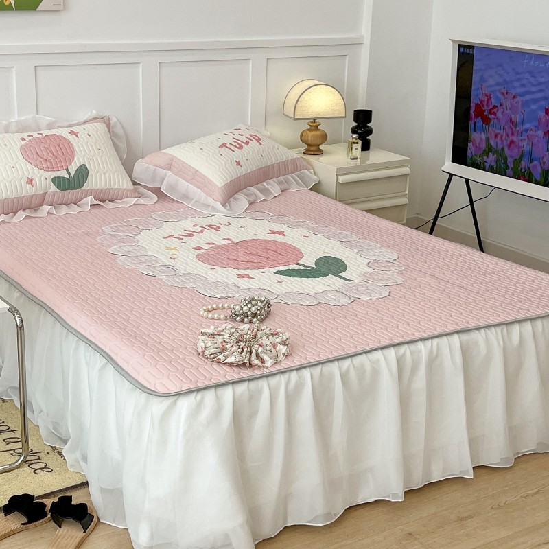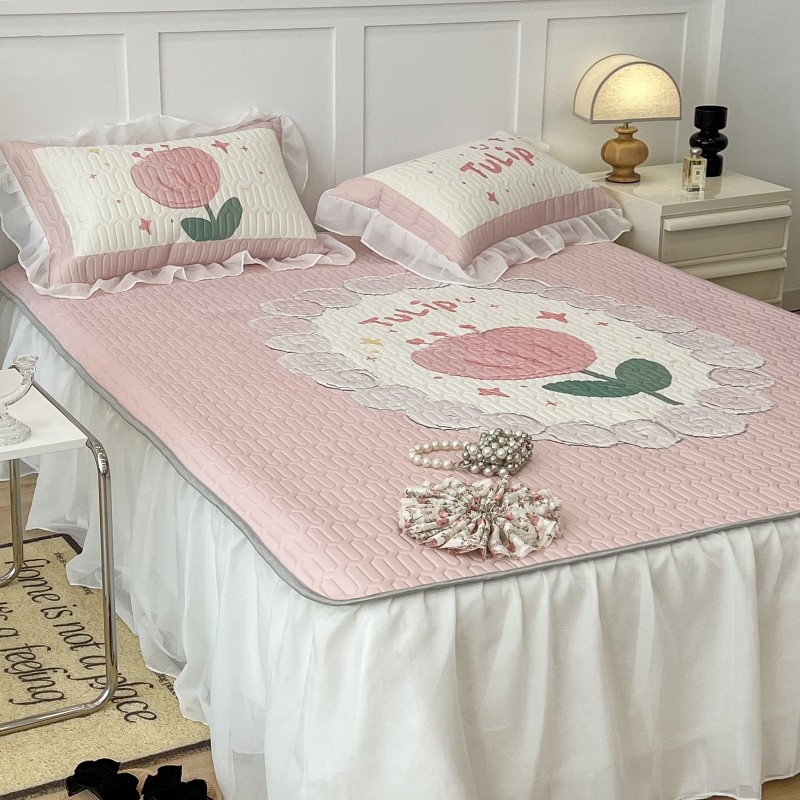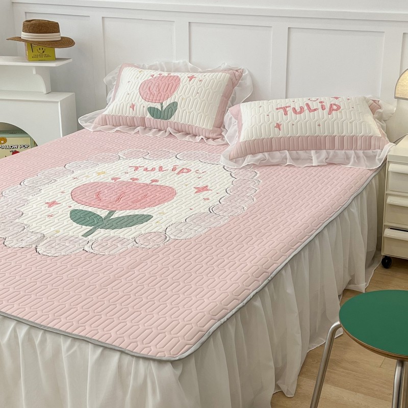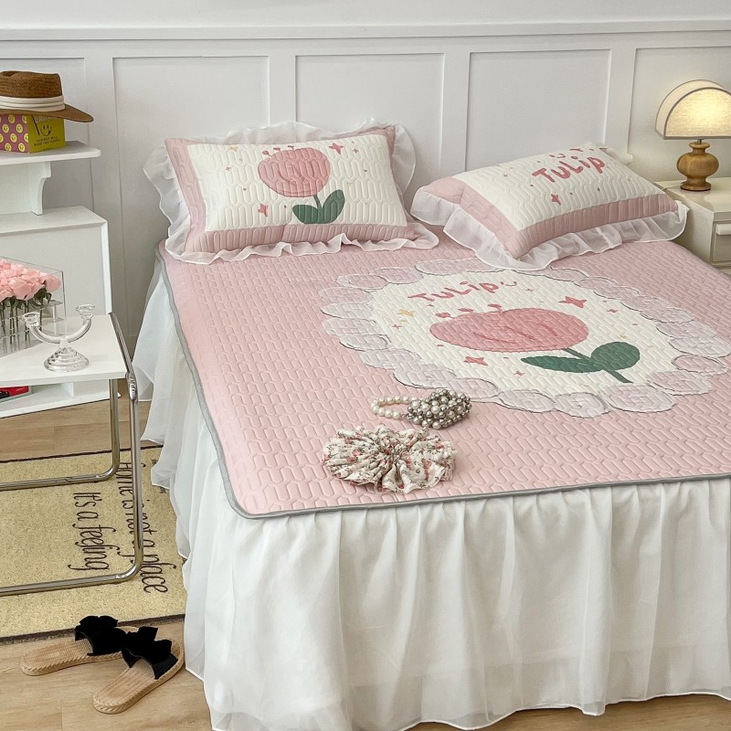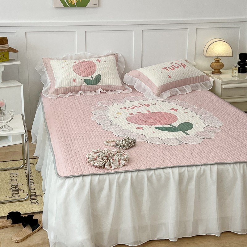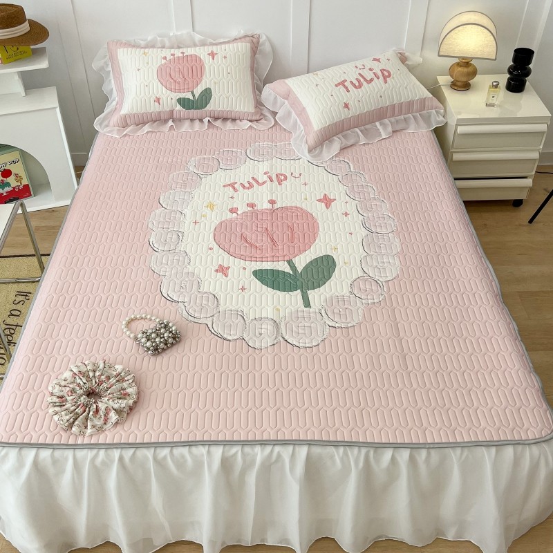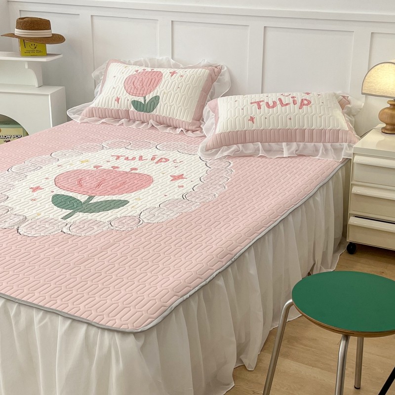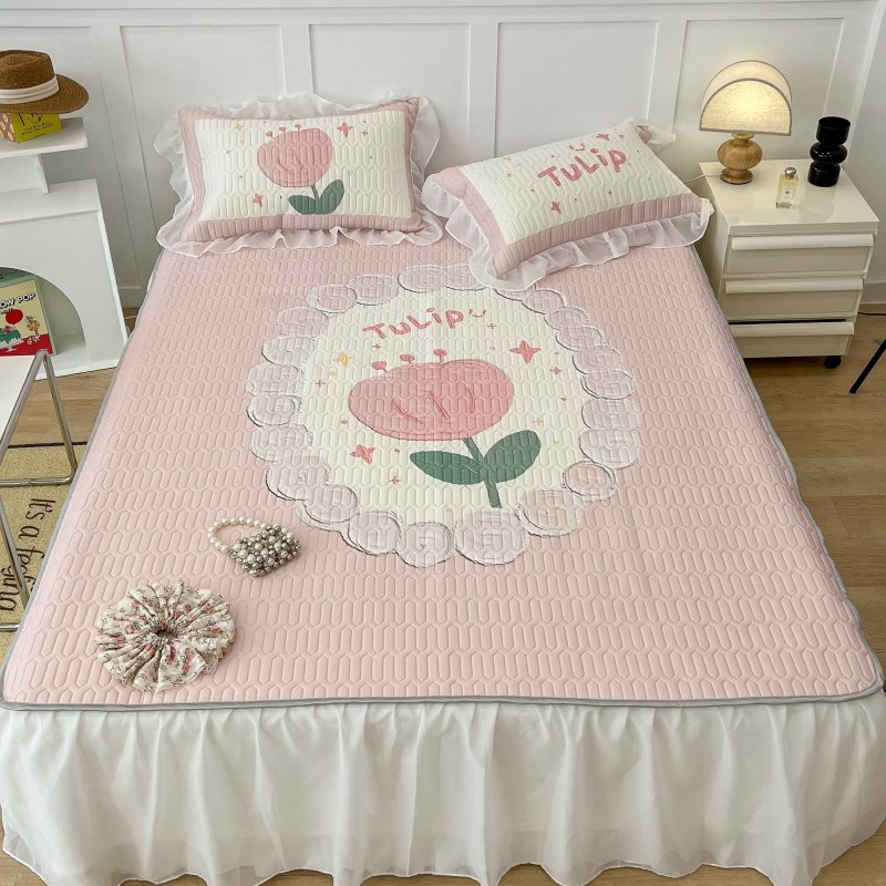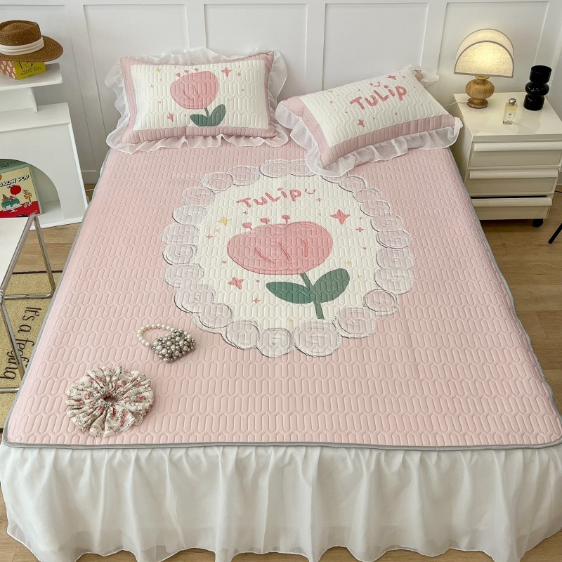 昔可 2022新款ins风小清新床裙款乳胶凉席三件套 床裙款-粉圈郁金香