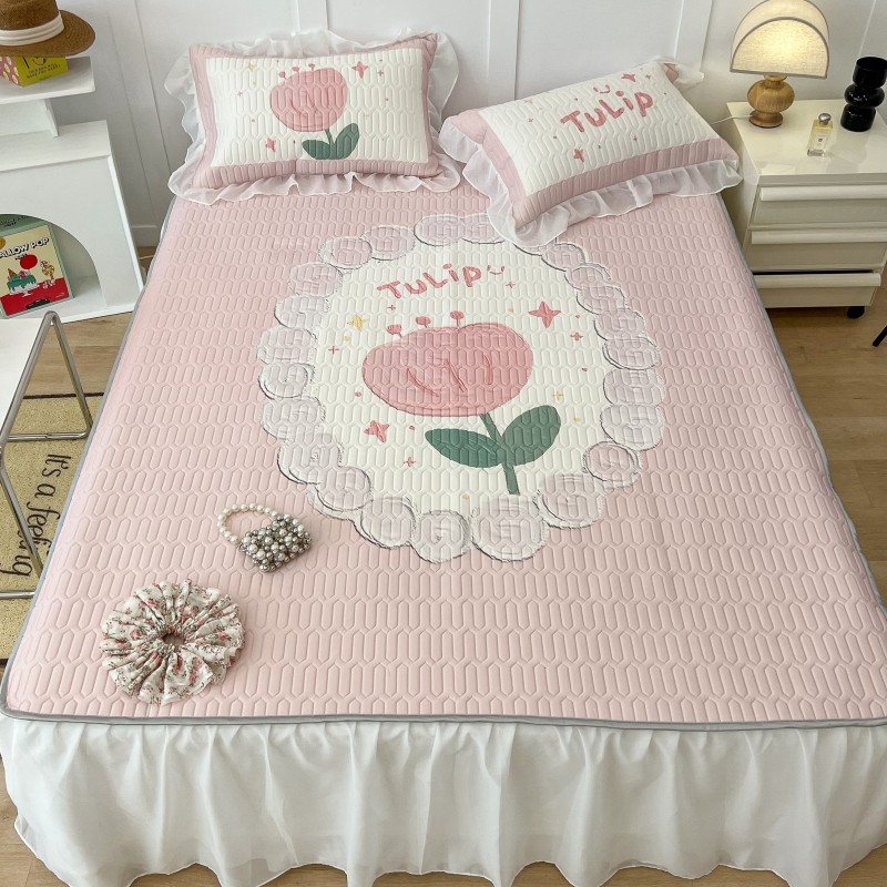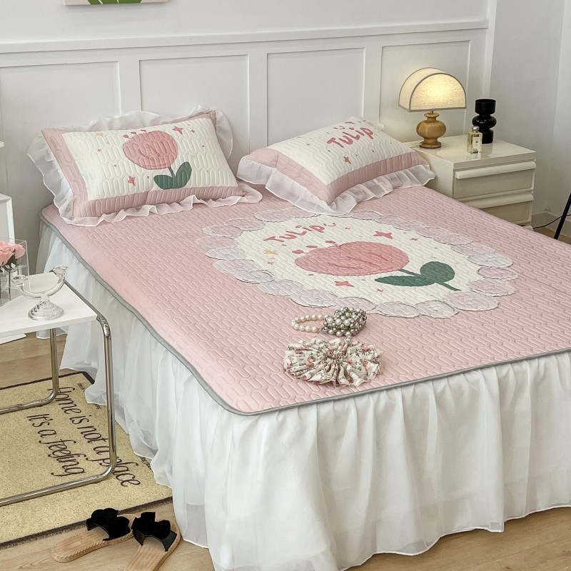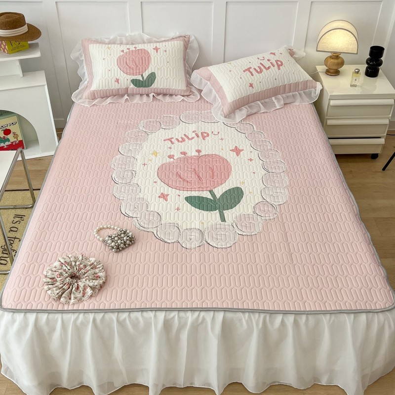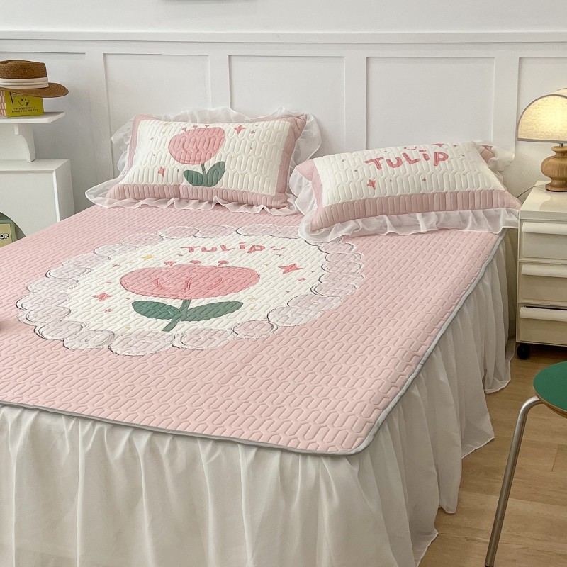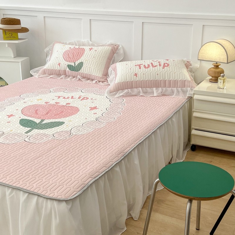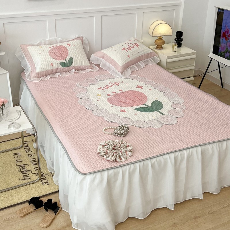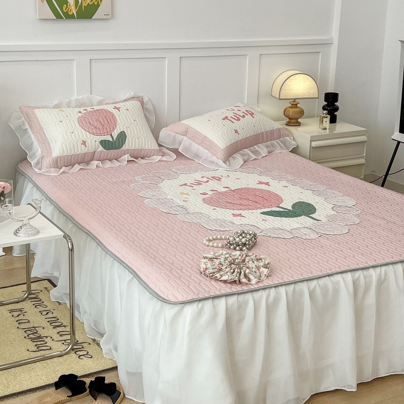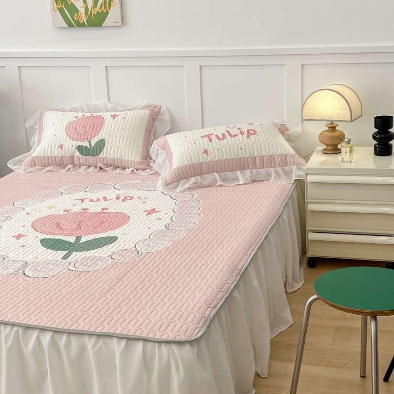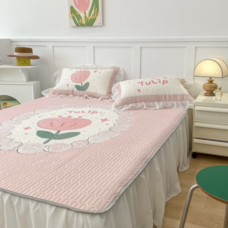昔可 2022新款ins风小清新床裙款乳胶凉席三件套 床裙款-粉圈郁金香