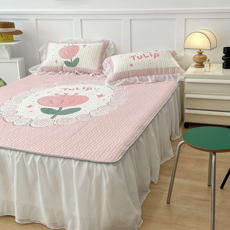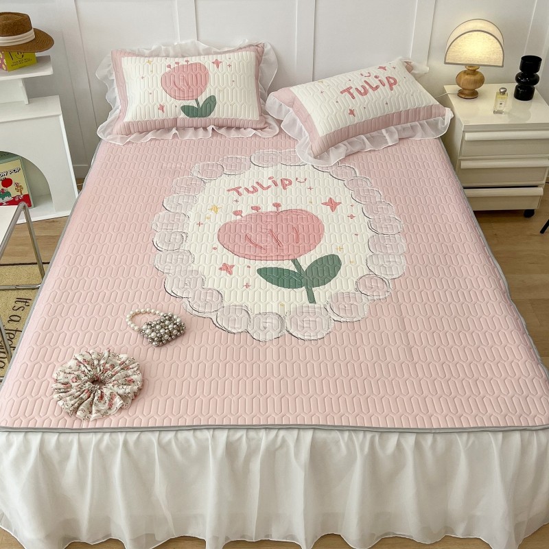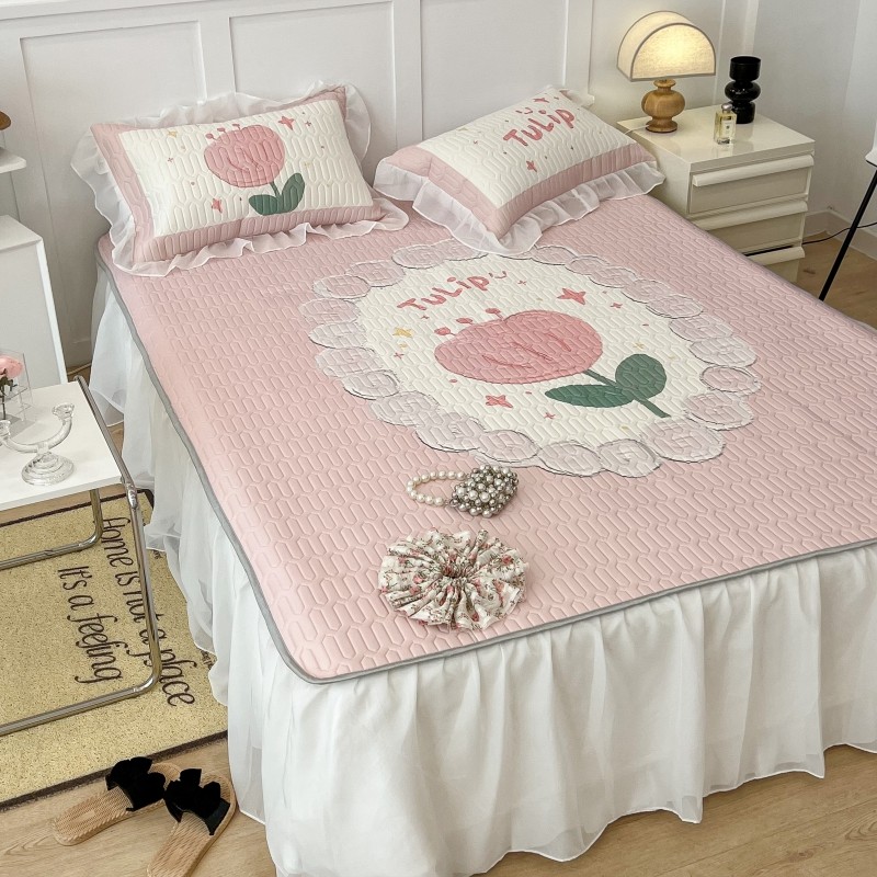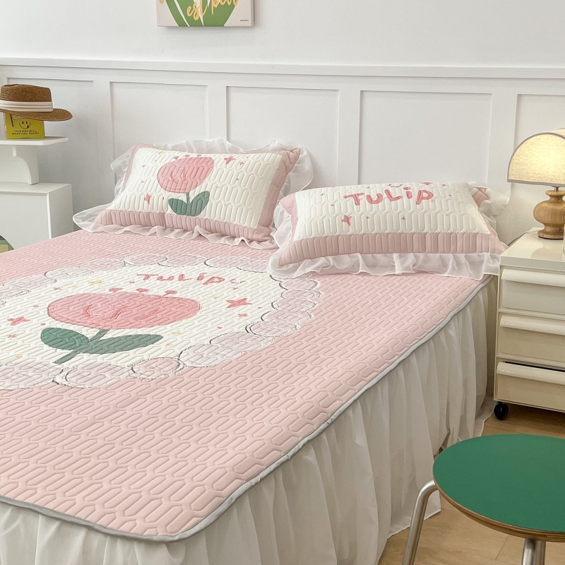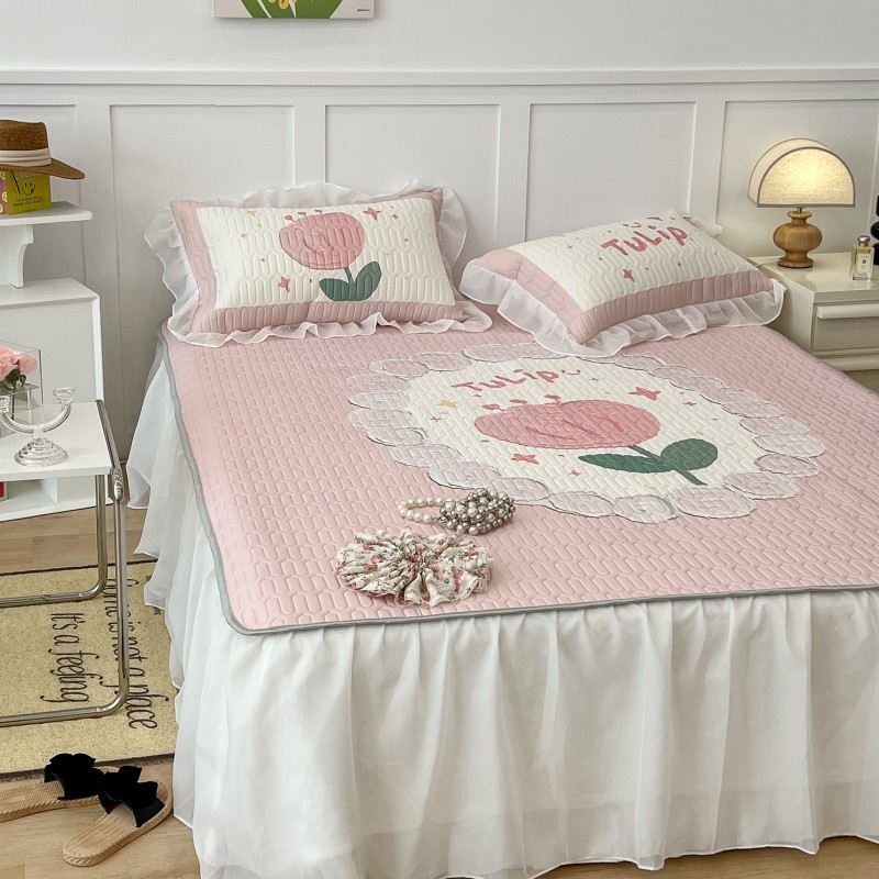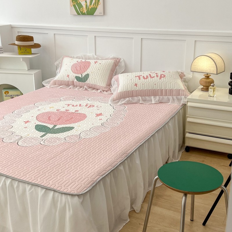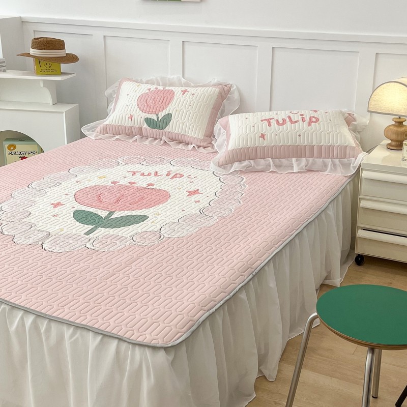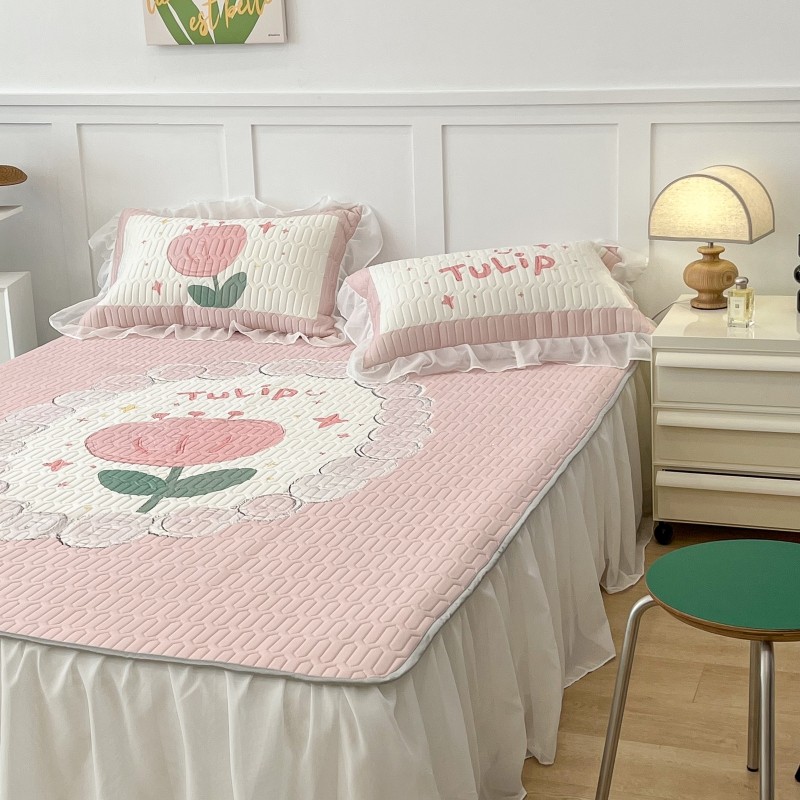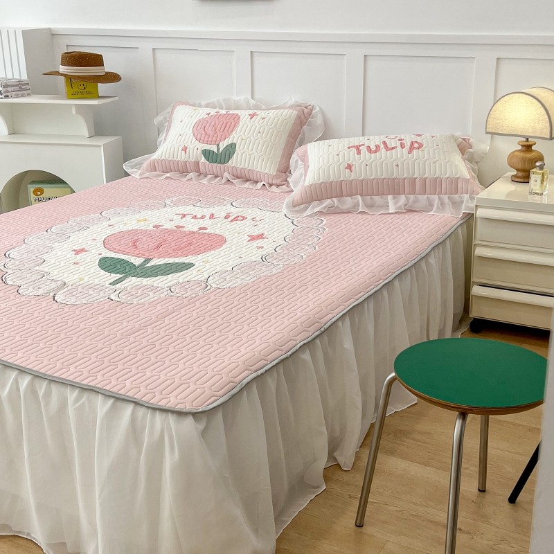 昔可 2022新款ins风小清新床裙款乳胶凉席三件套 床裙款-粉圈郁金香