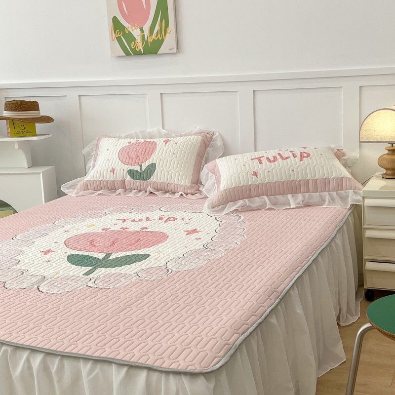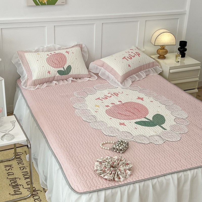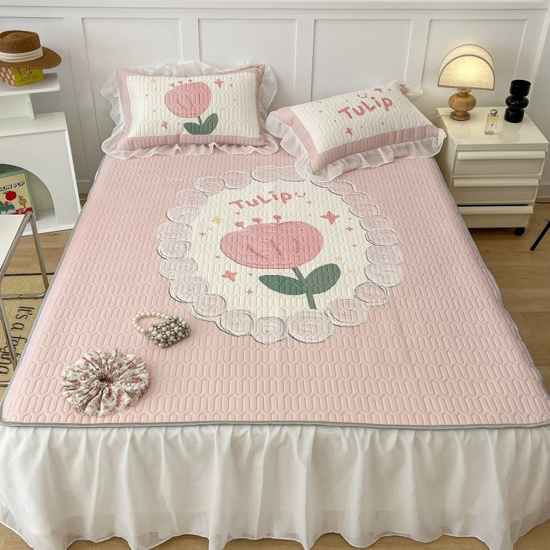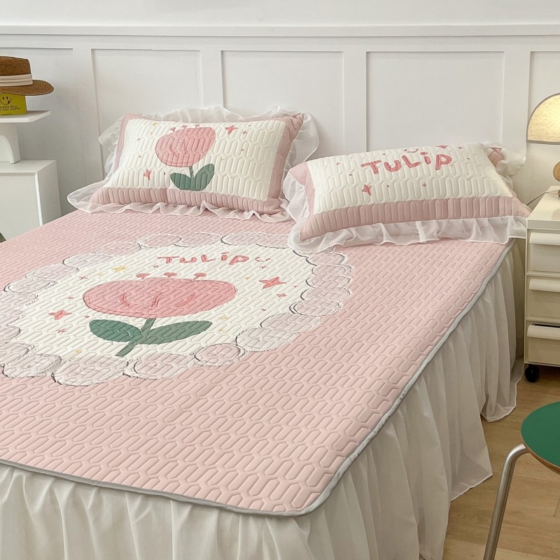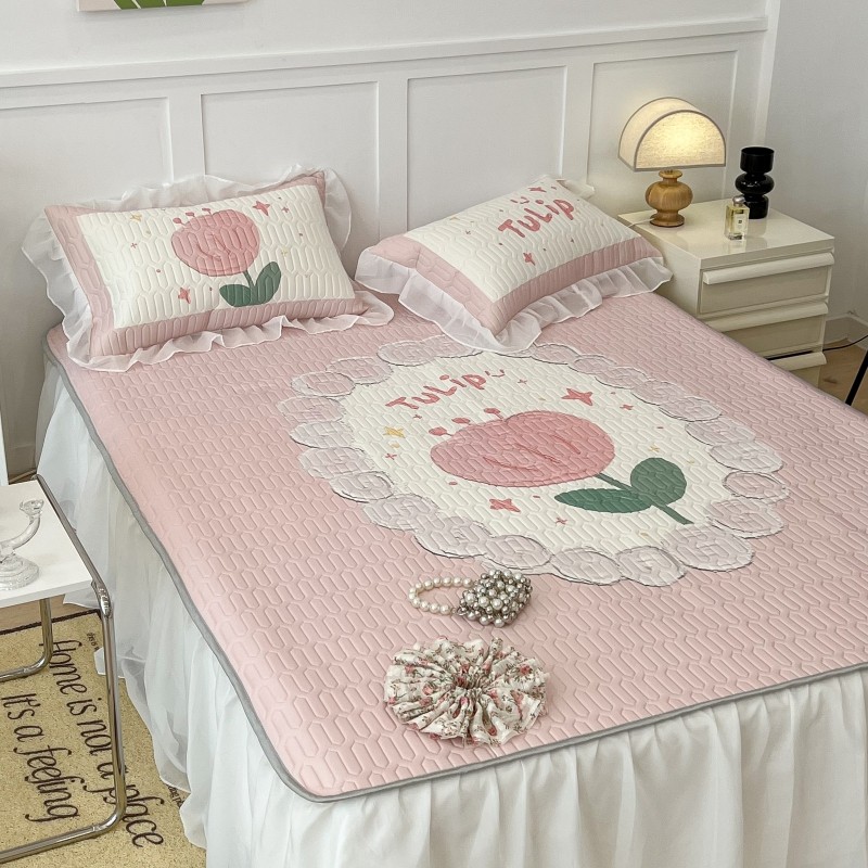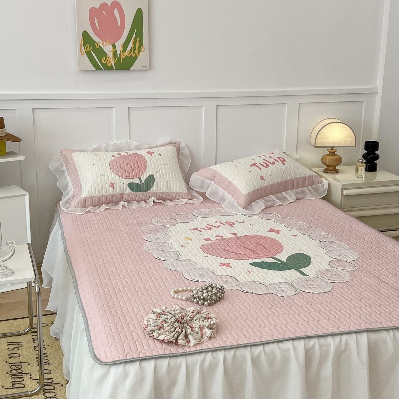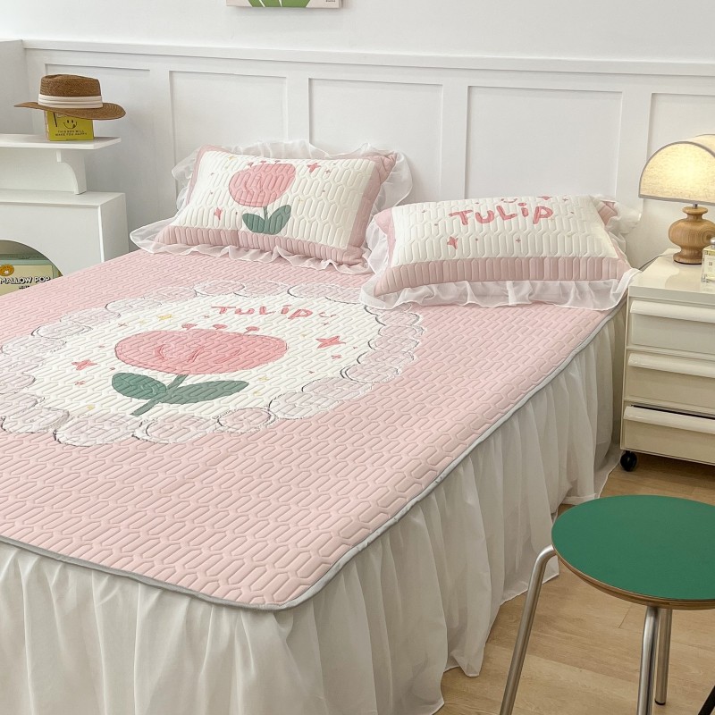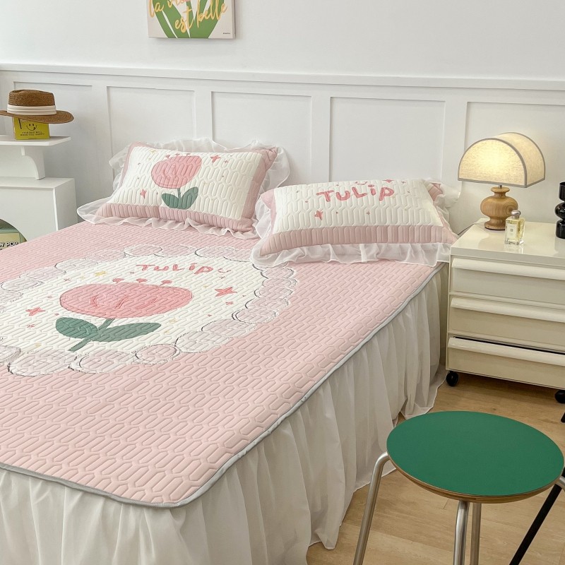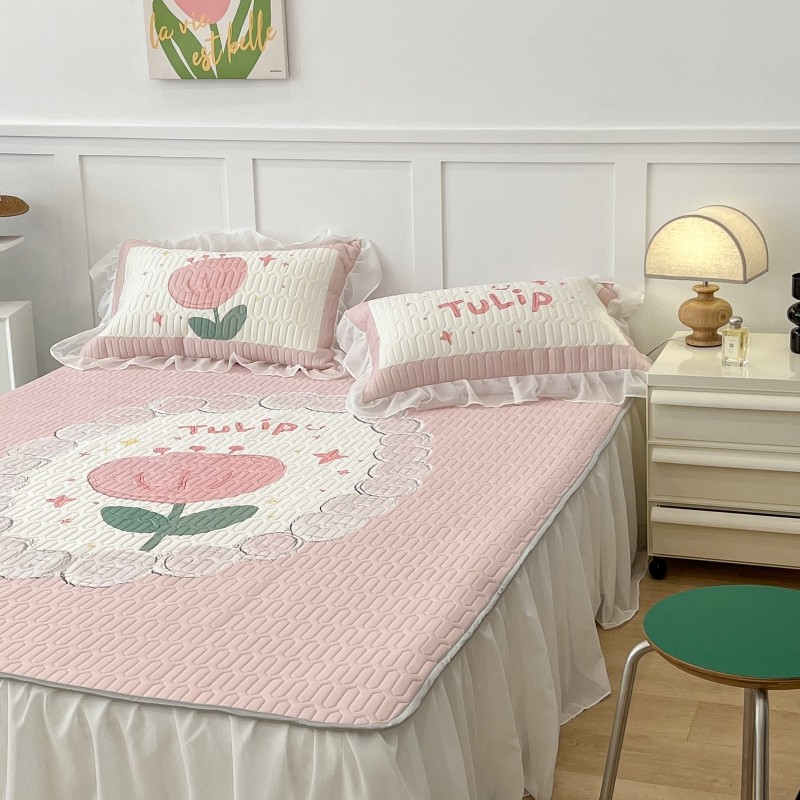 昔可 2022新款ins风小清新床裙款乳胶凉席三件套 床裙款-粉圈郁金香