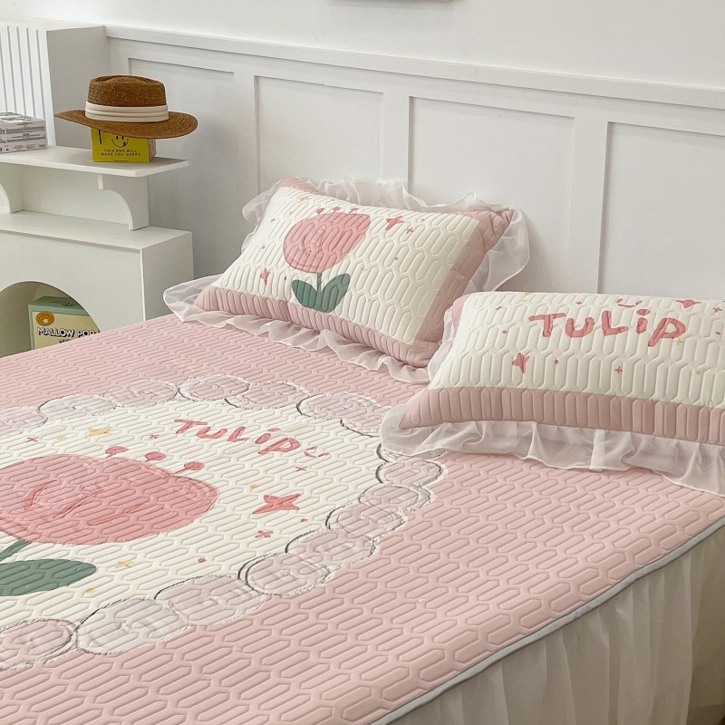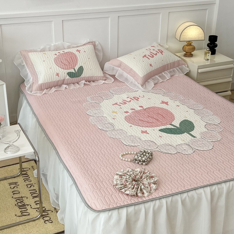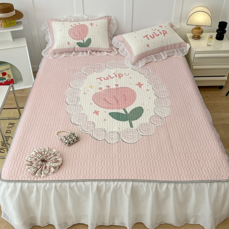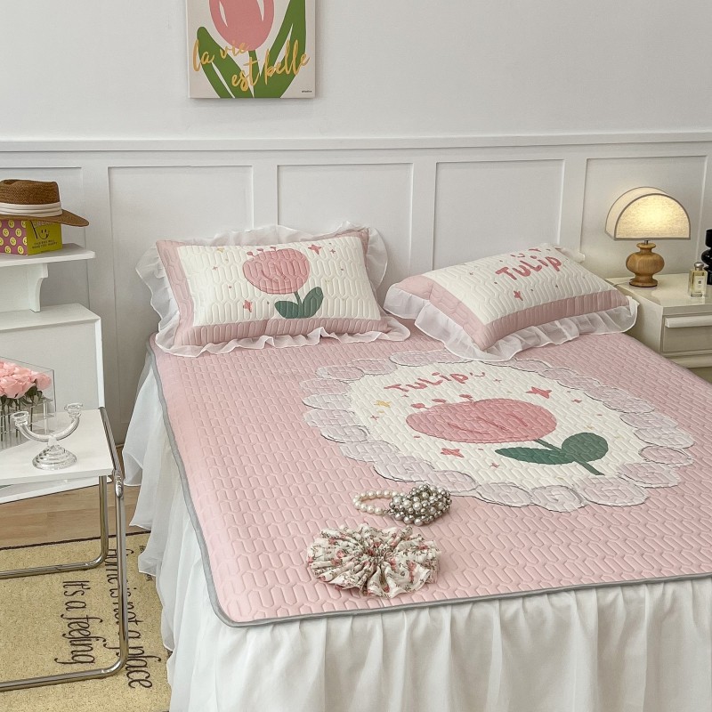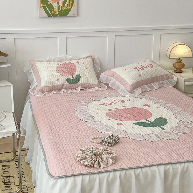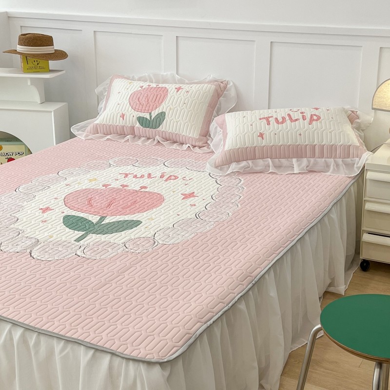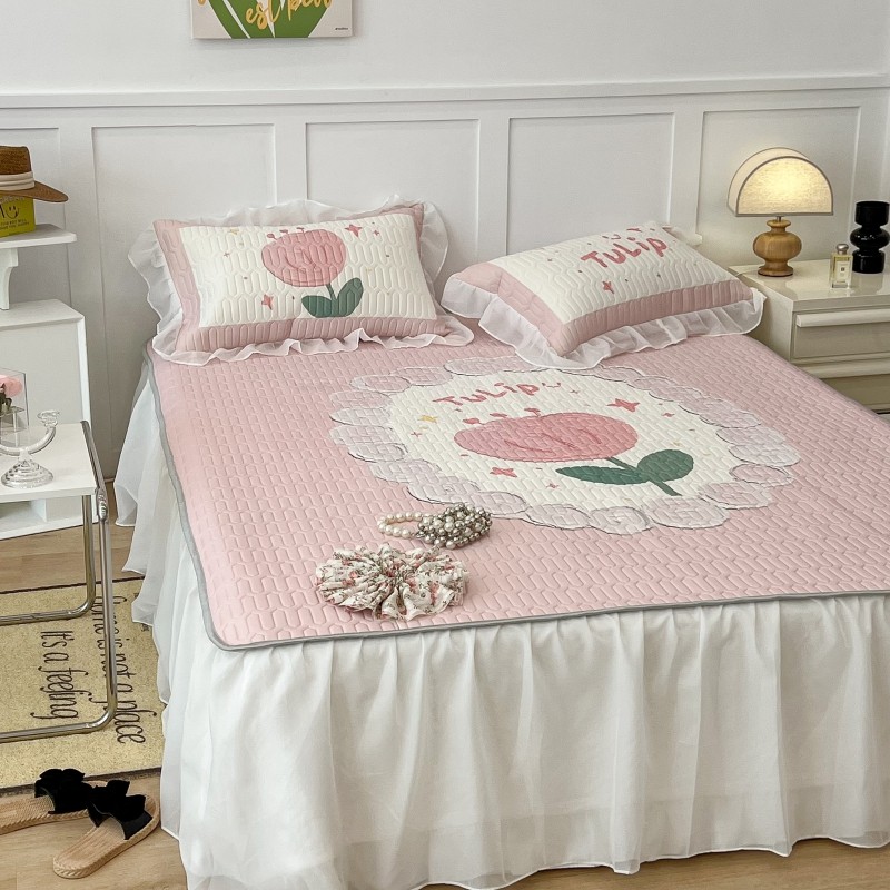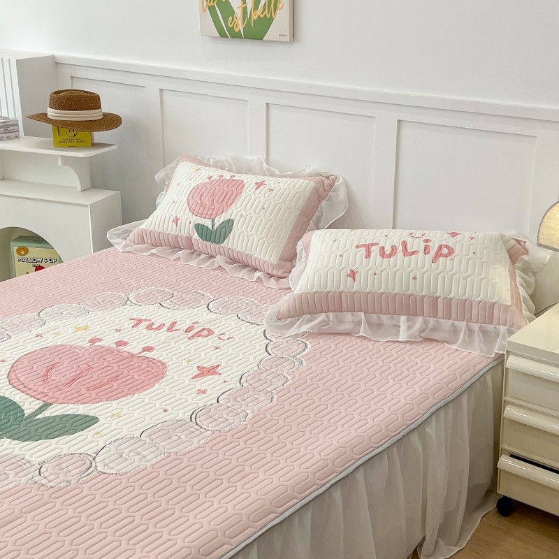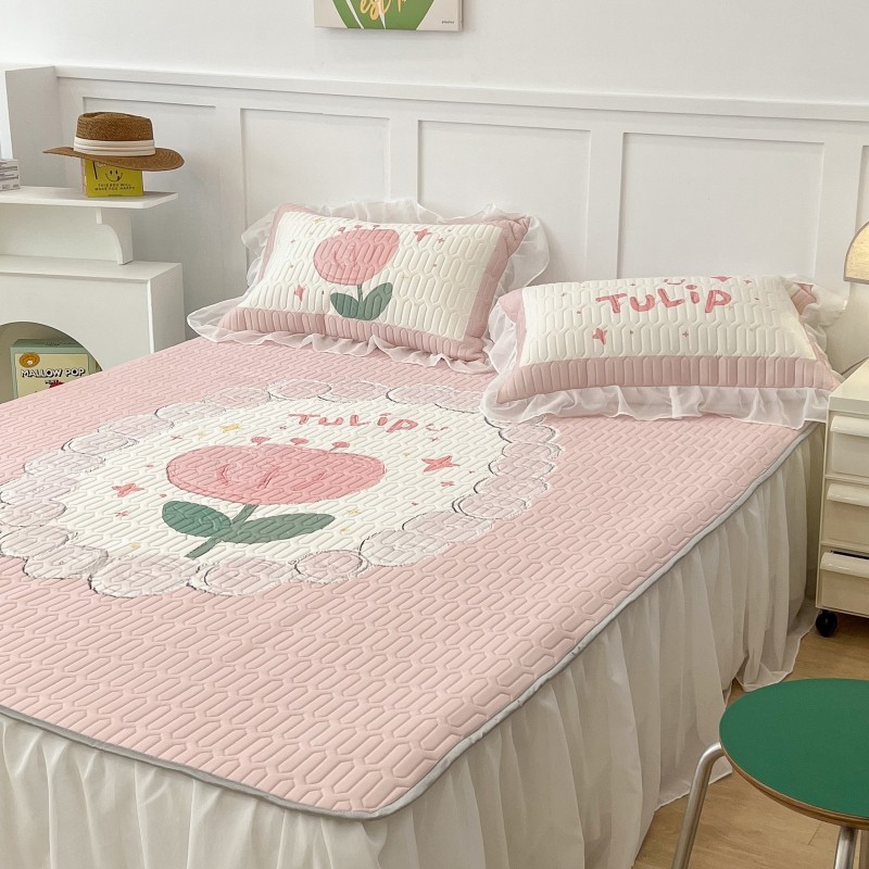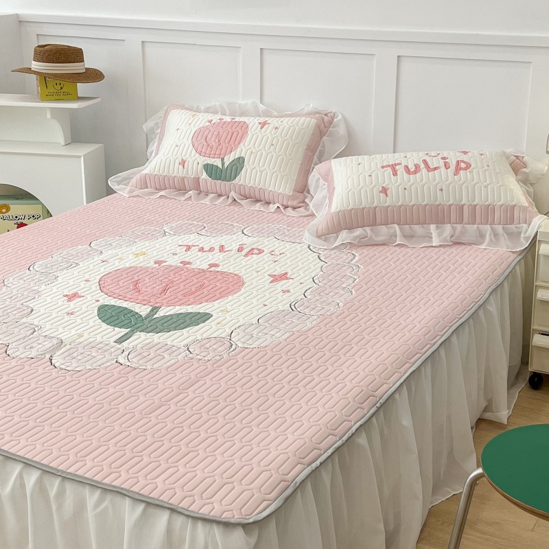 昔可 2022新款ins风小清新床裙款乳胶凉席三件套 床裙款-粉圈郁金香