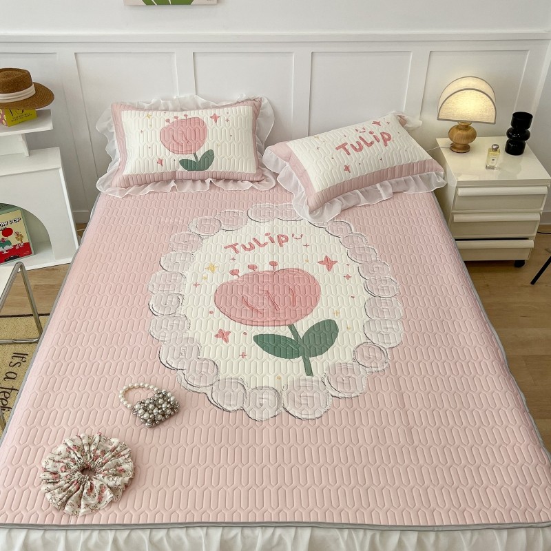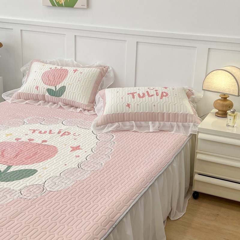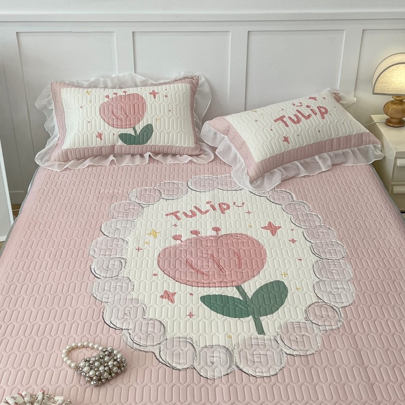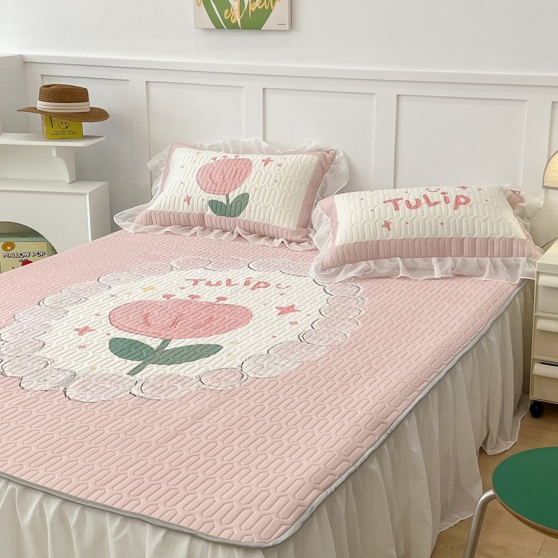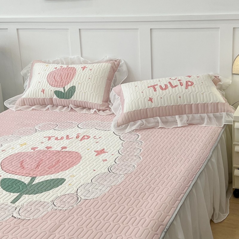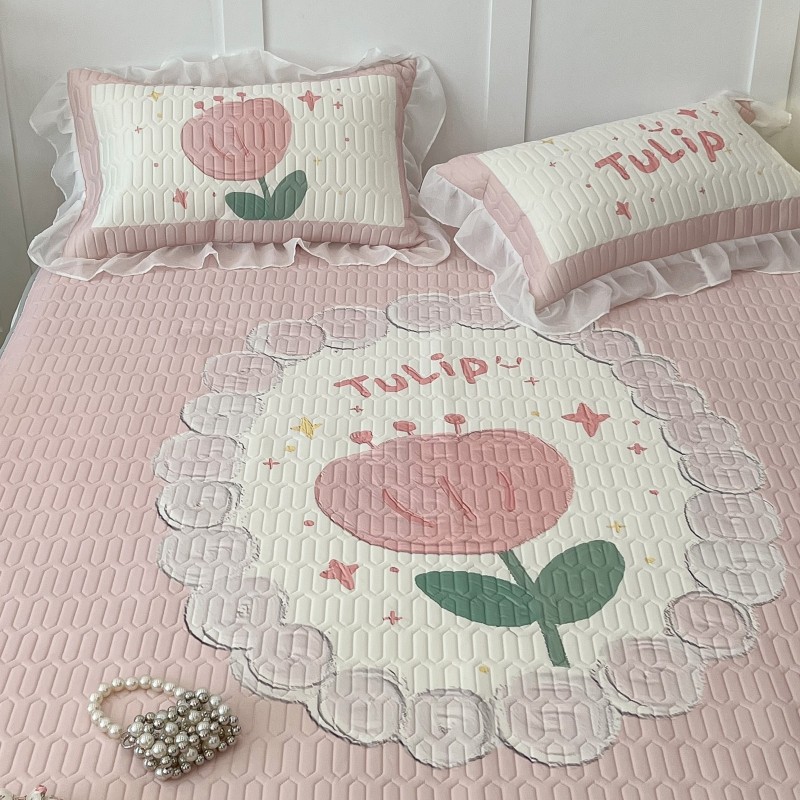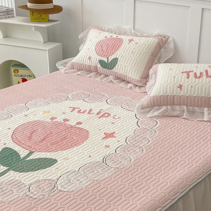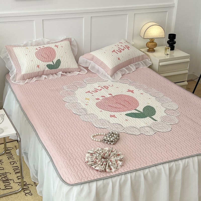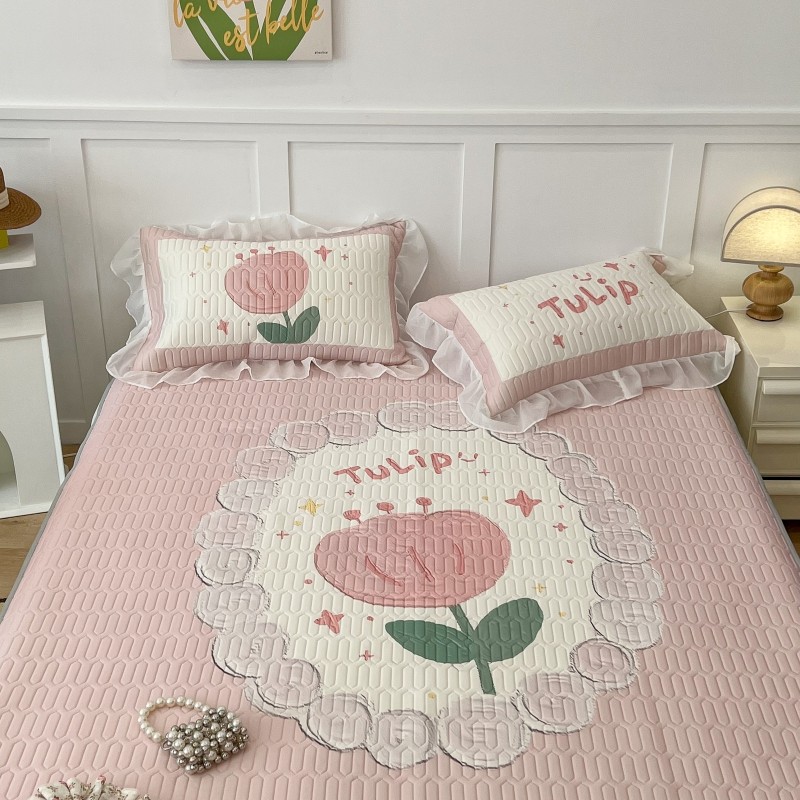 昔可 2022新款ins风小清新床裙款乳胶凉席三件套 床裙款-粉圈郁金香