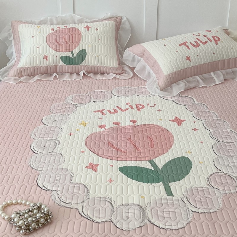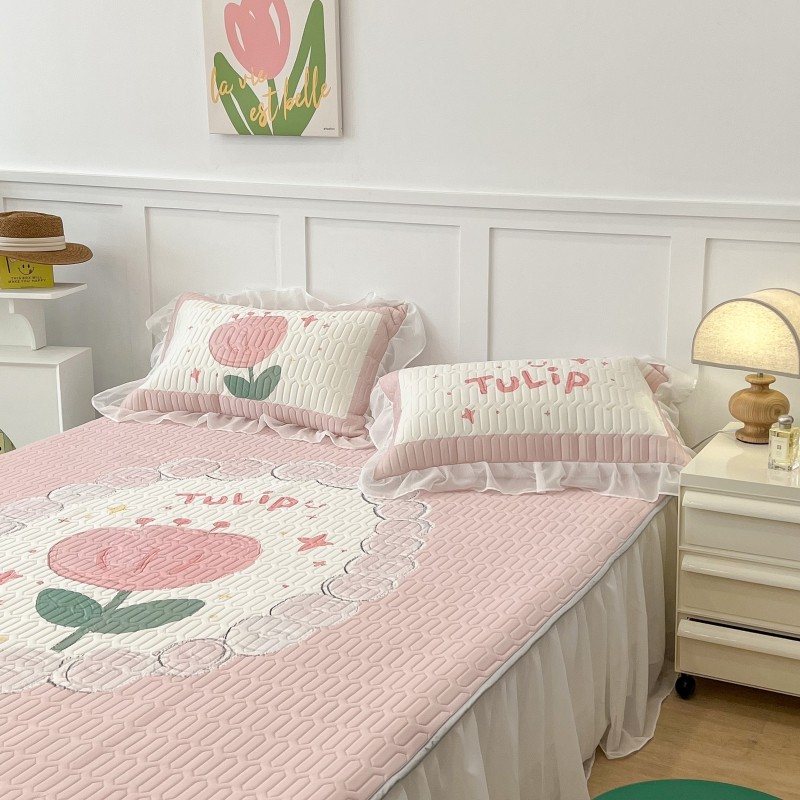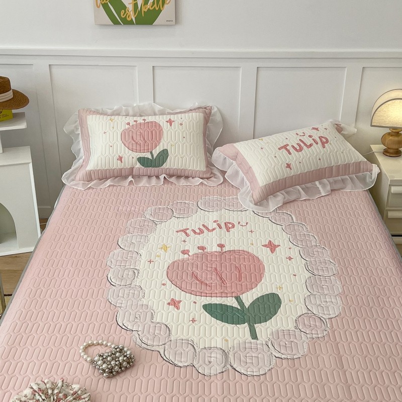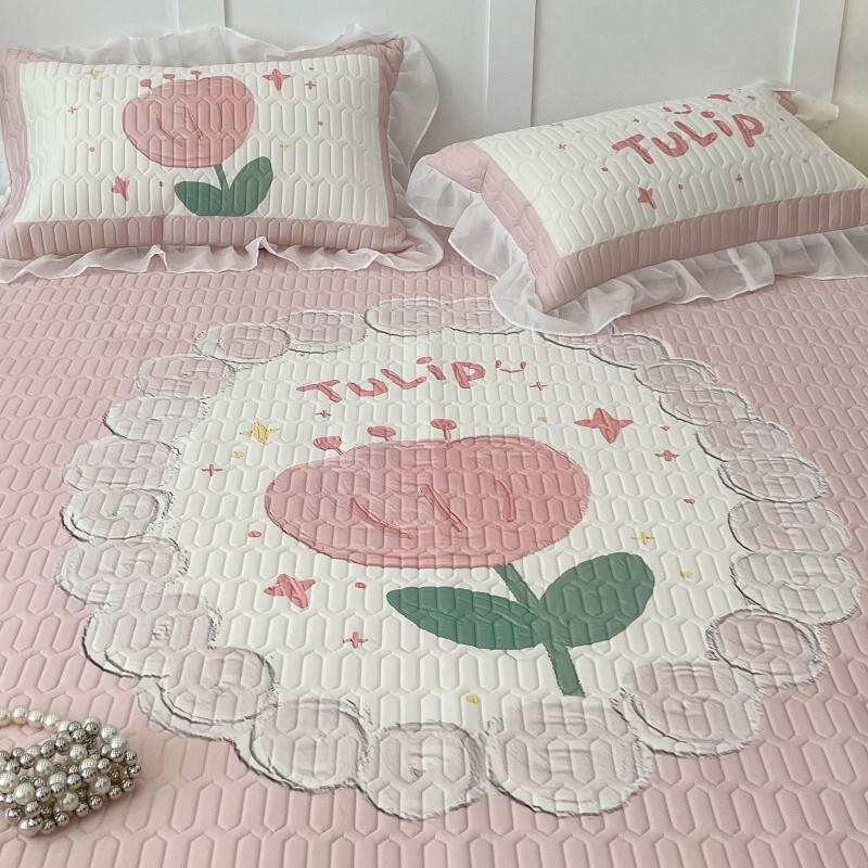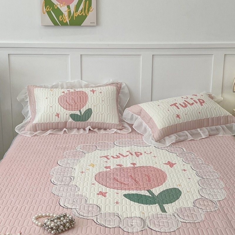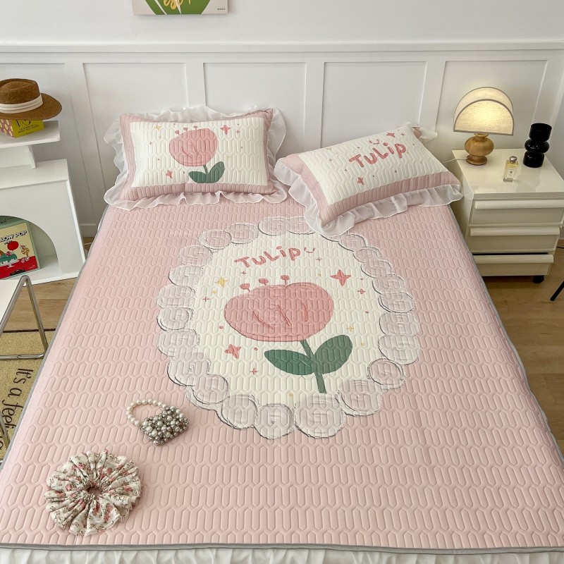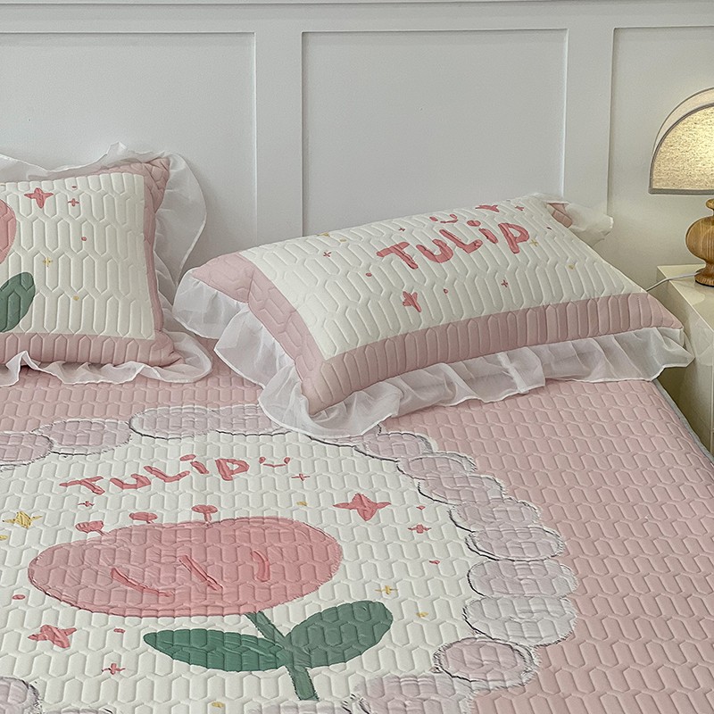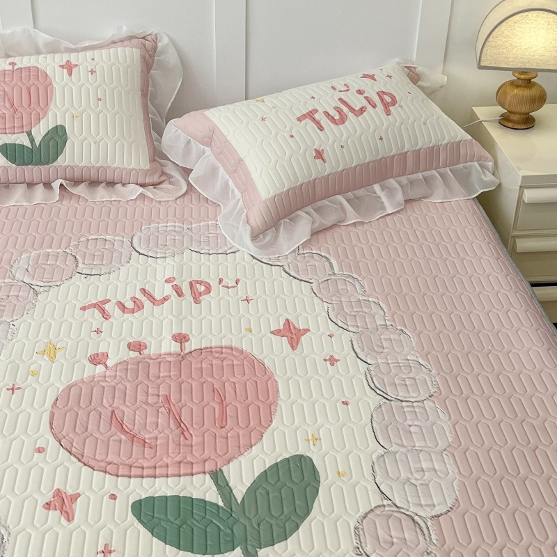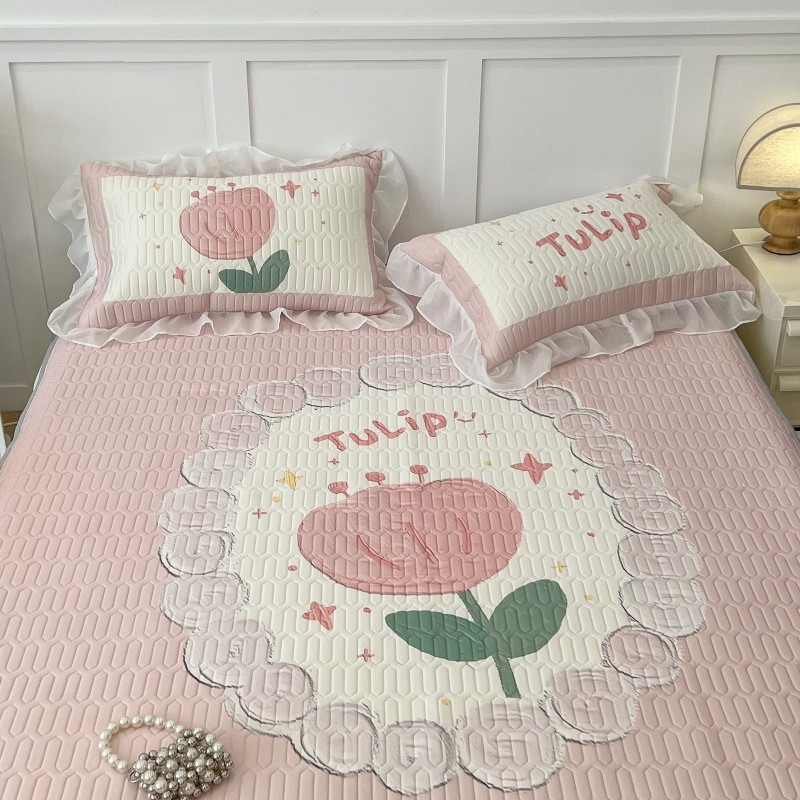 昔可 2022新款ins风小清新床裙款乳胶凉席三件套 床裙款-粉圈郁金香