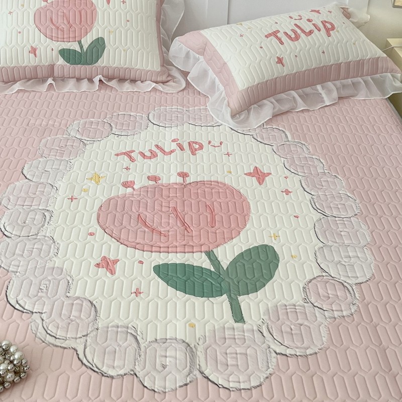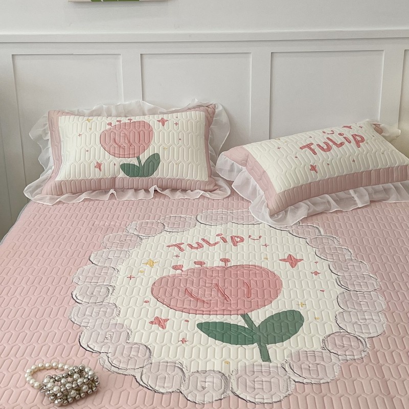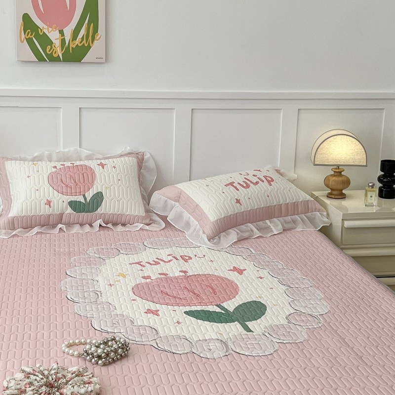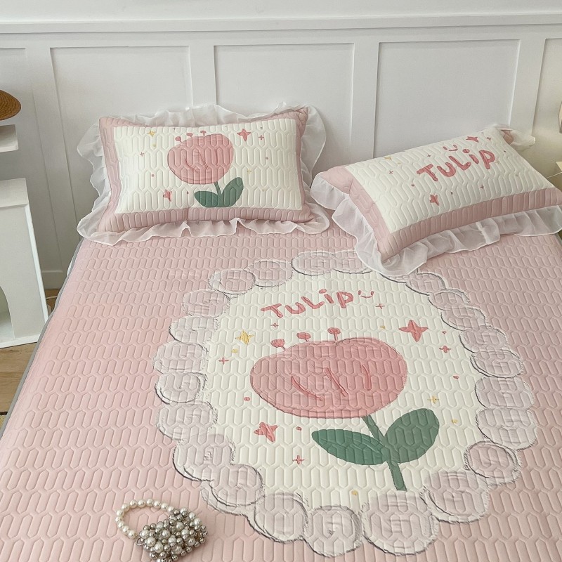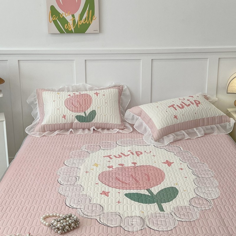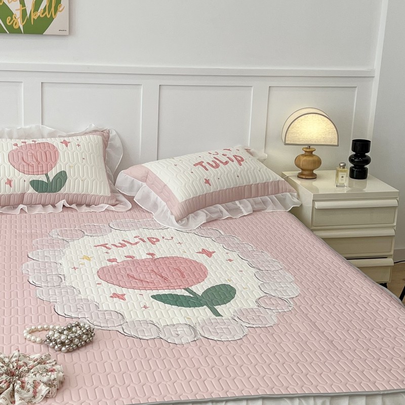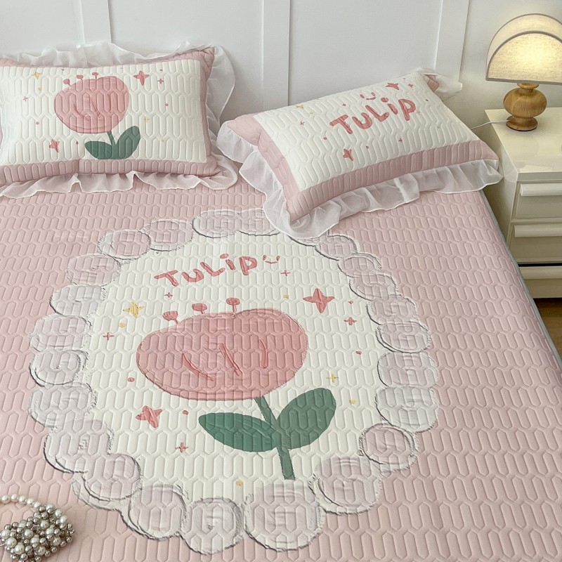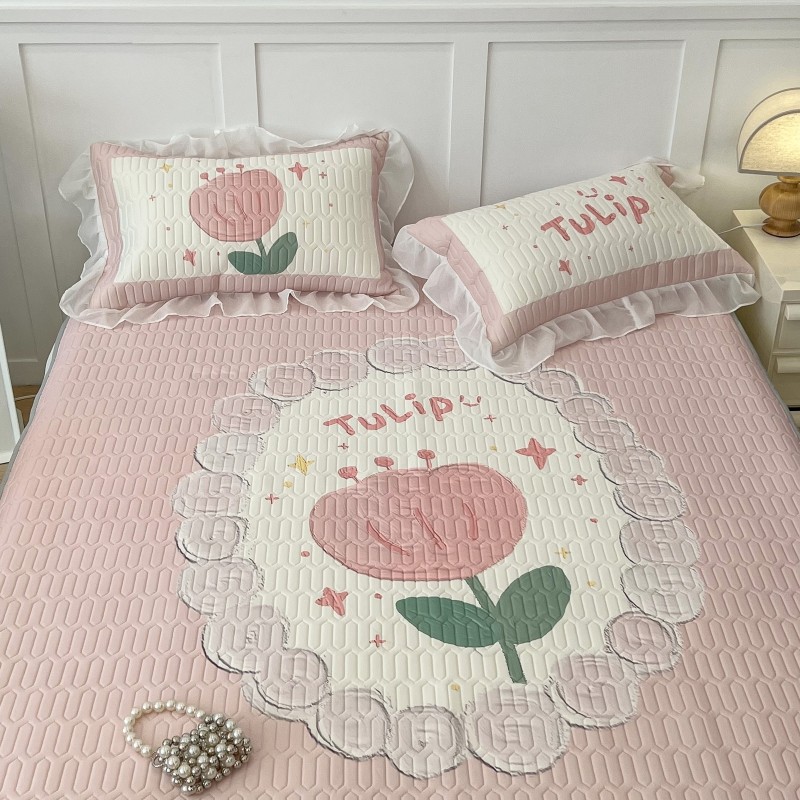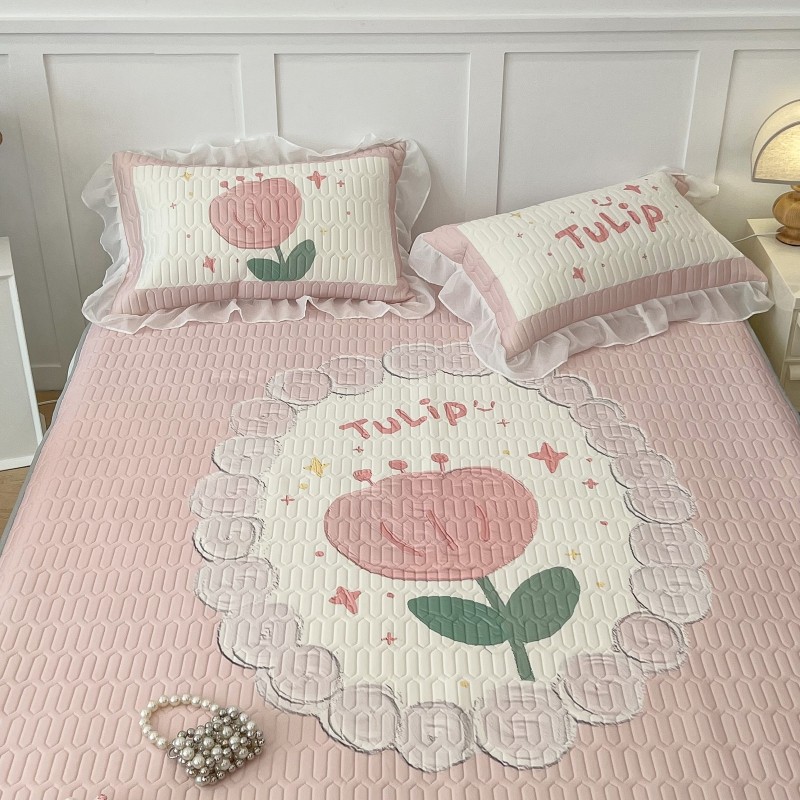 昔可 2022新款ins风小清新床裙款乳胶凉席三件套 床裙款-粉圈郁金香