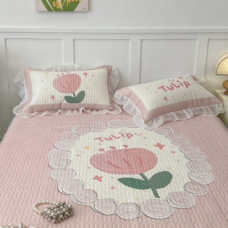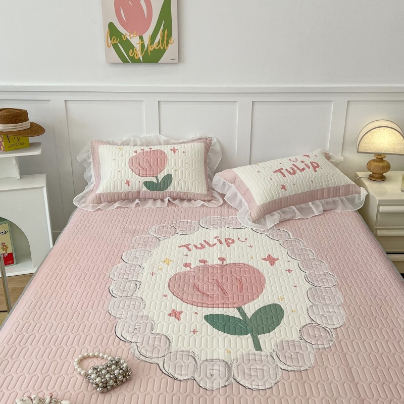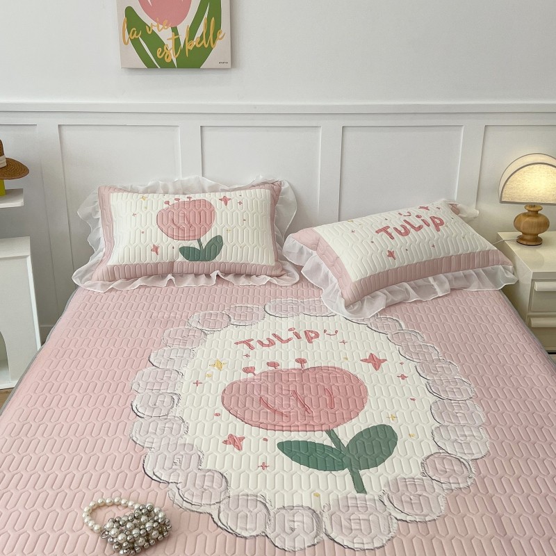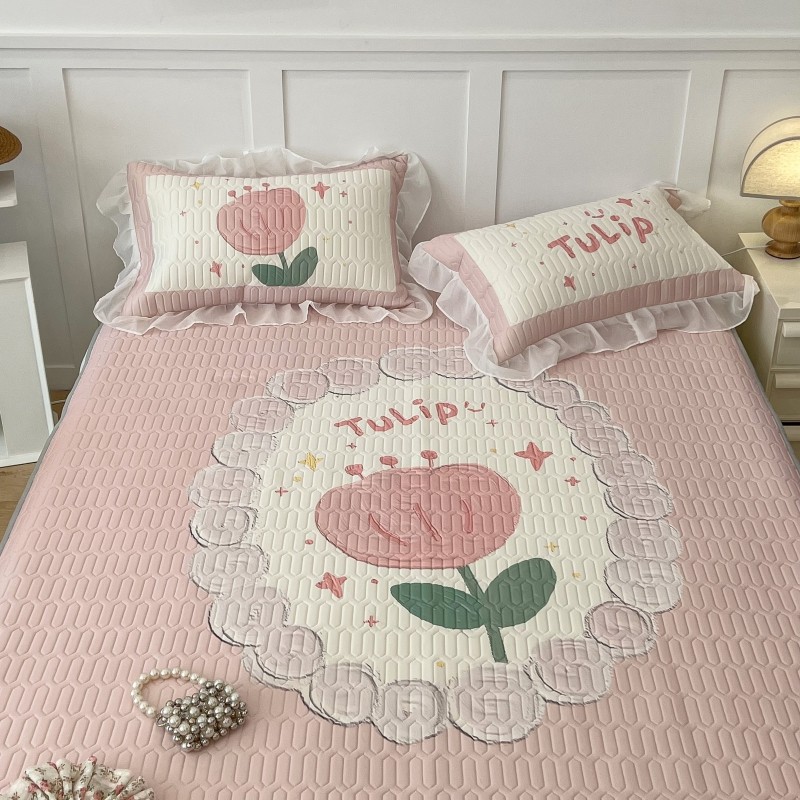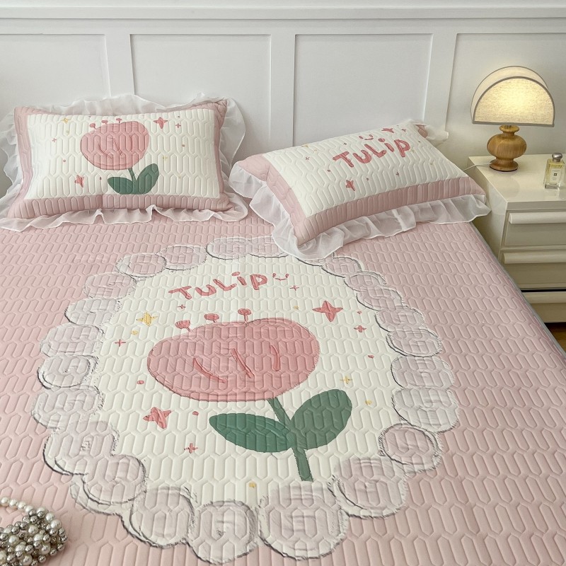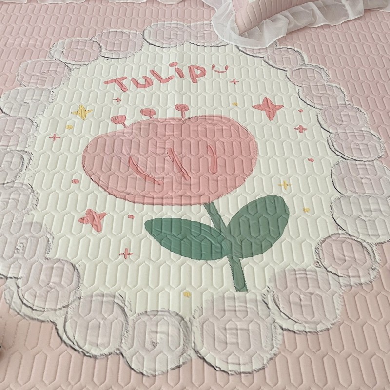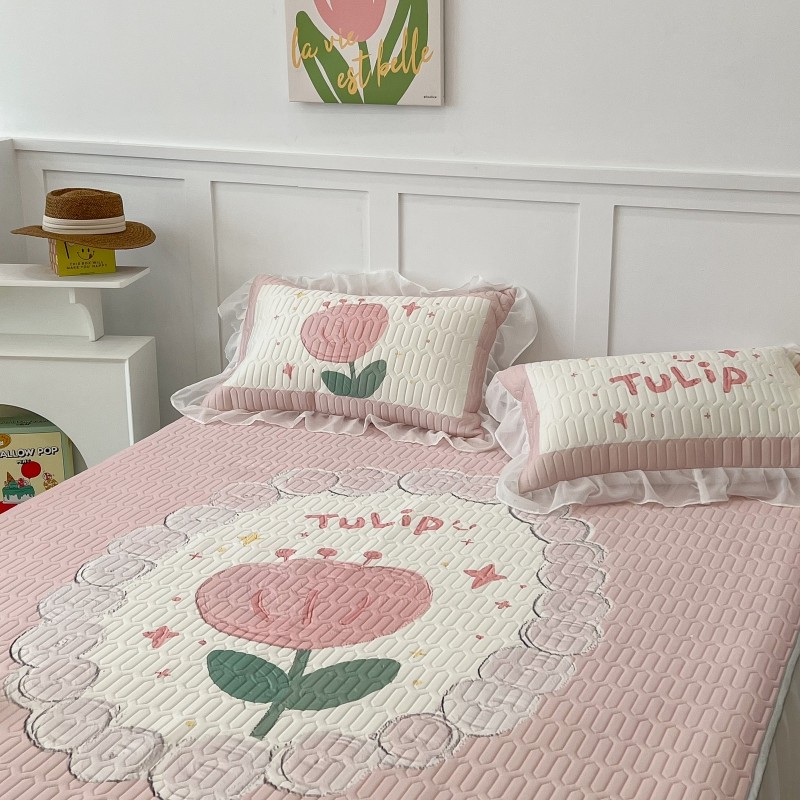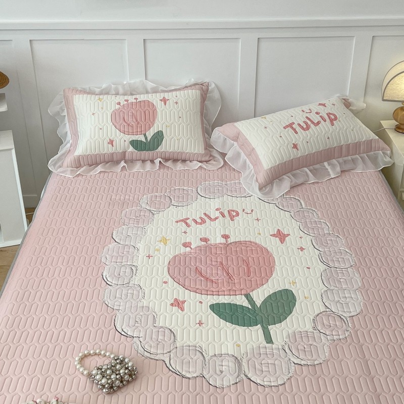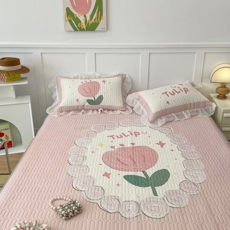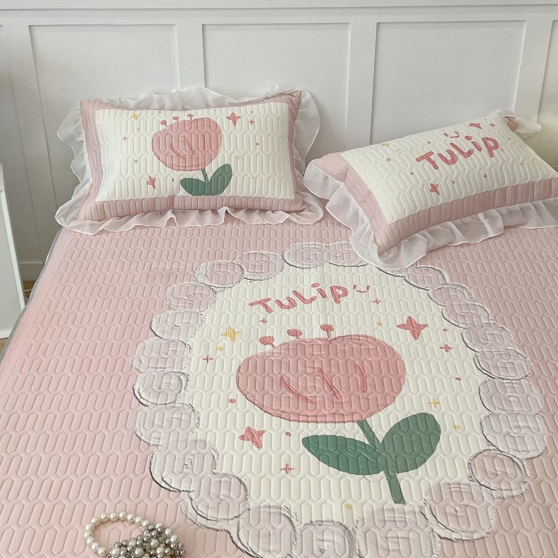昔可 2022新款ins风小清新床裙款乳胶凉席三件套 床裙款-粉圈郁金香