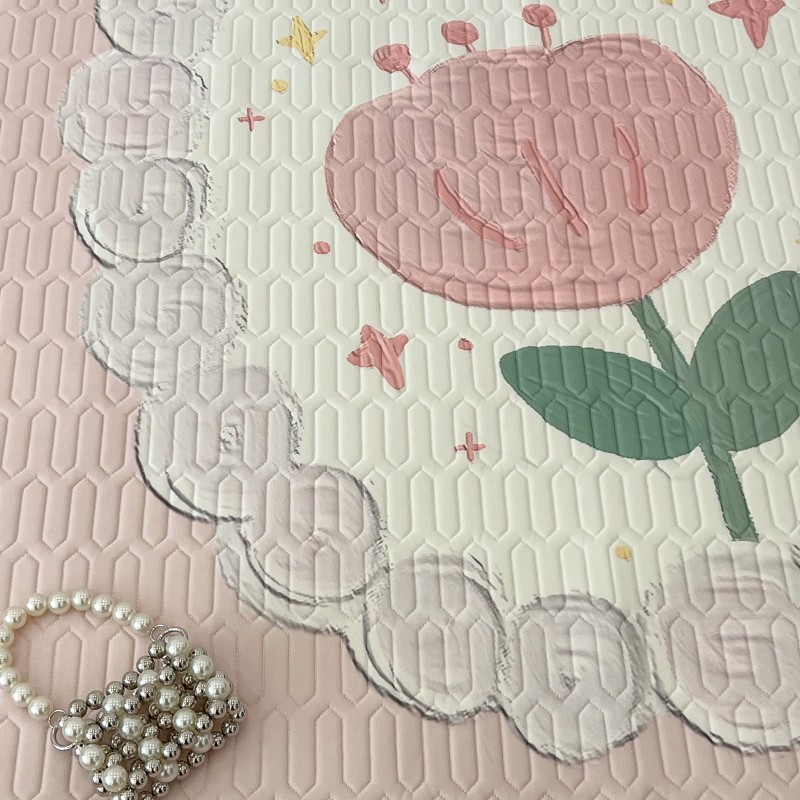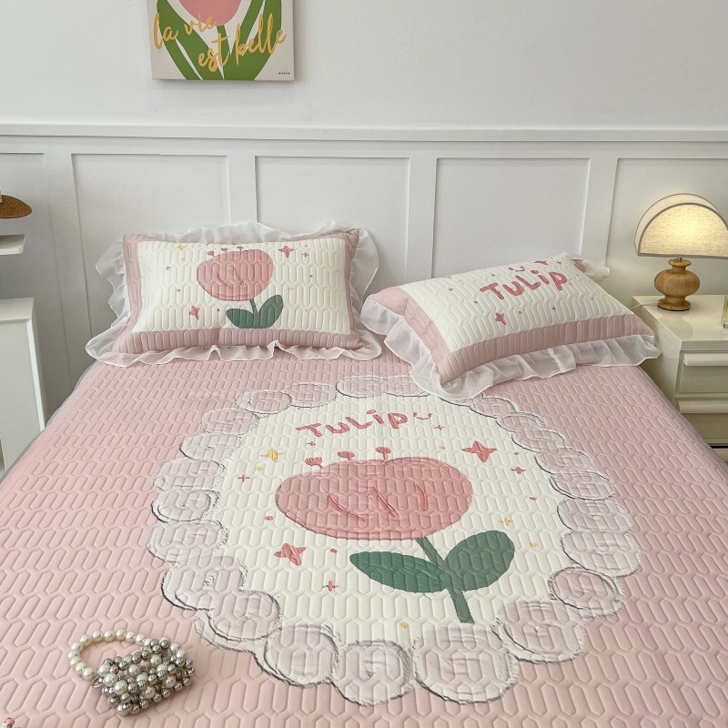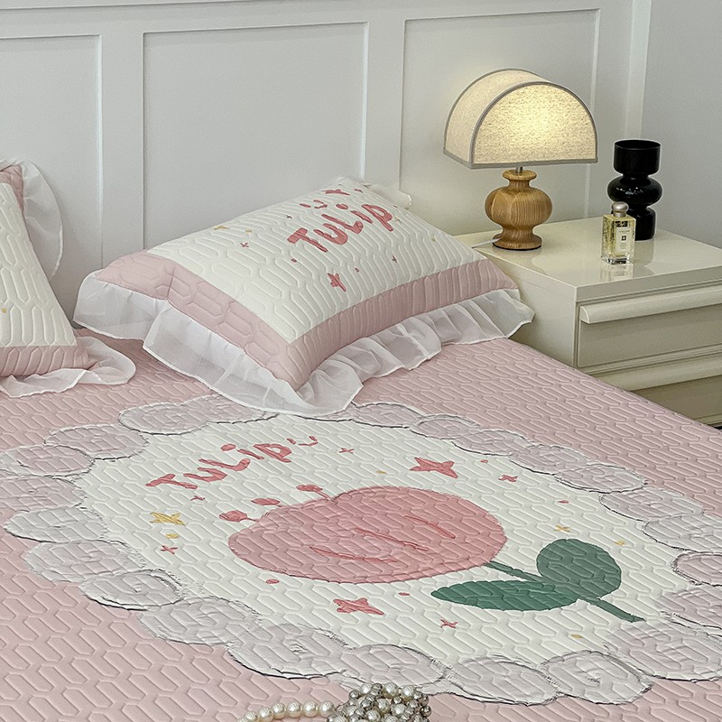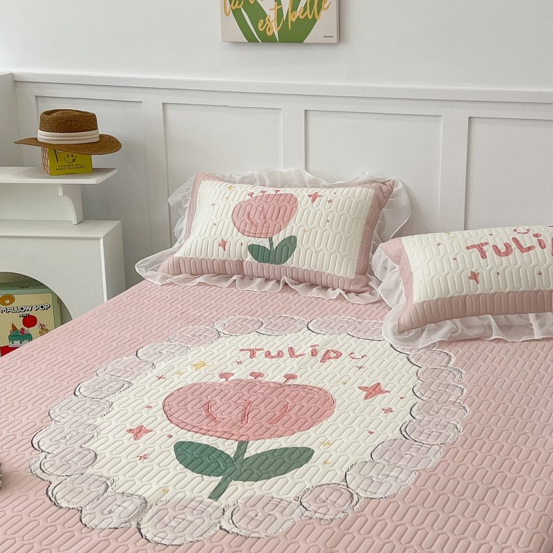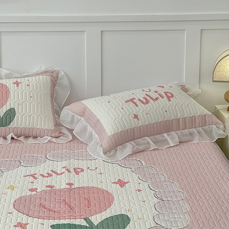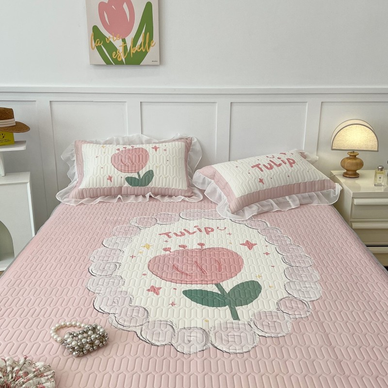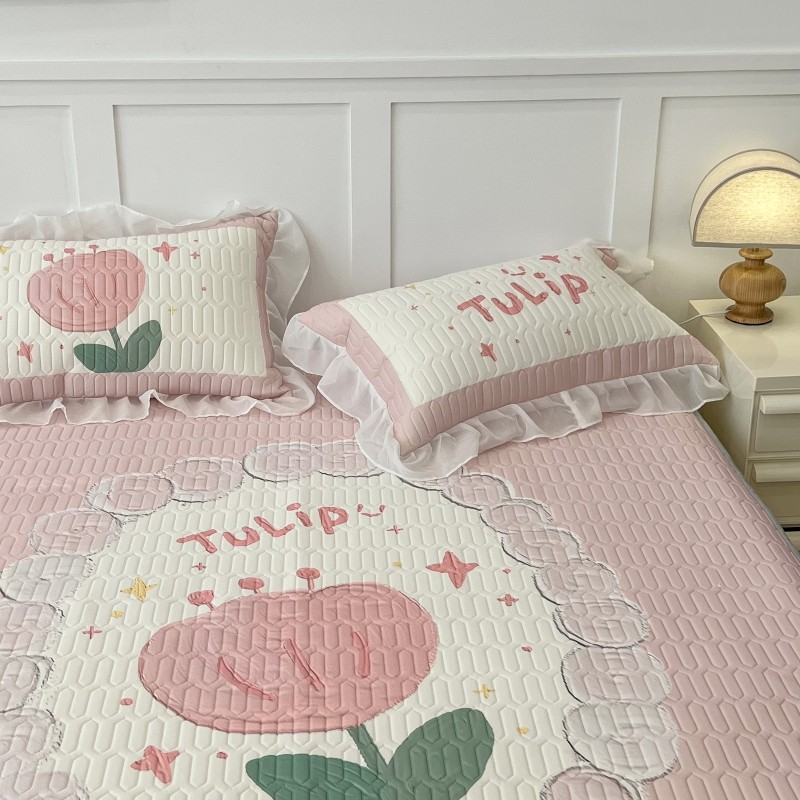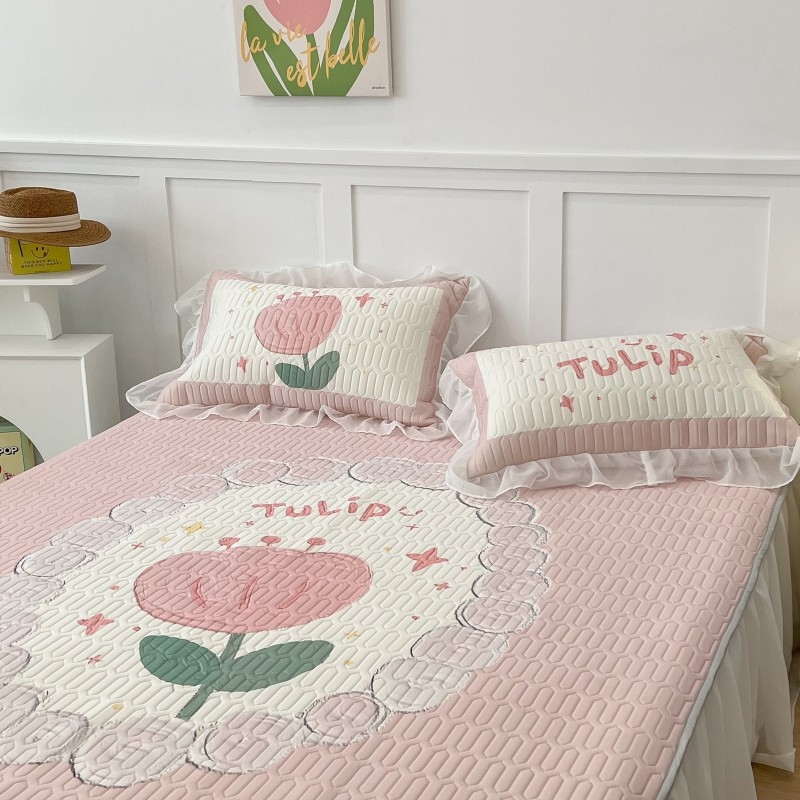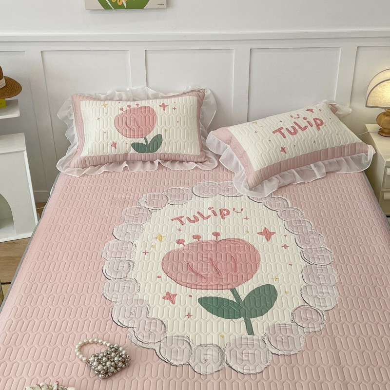 昔可 2022新款ins风小清新床裙款乳胶凉席三件套 床裙款-粉圈郁金香