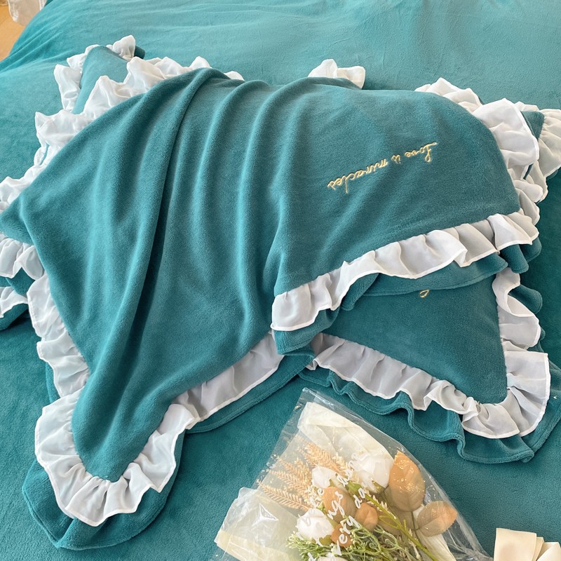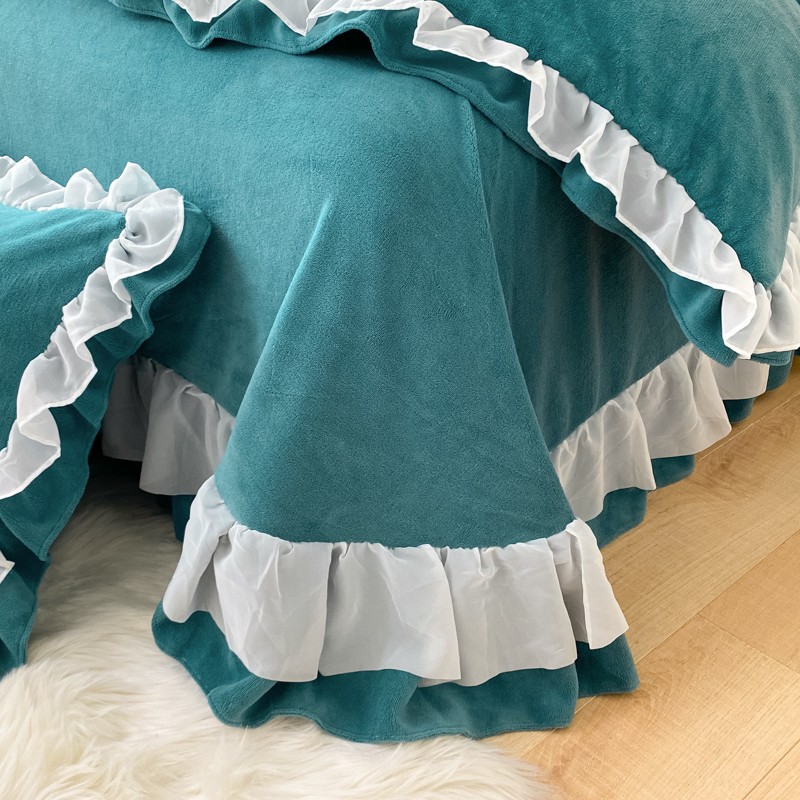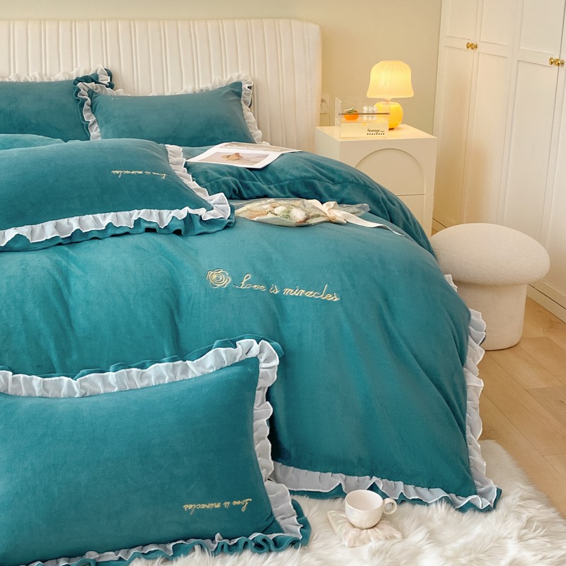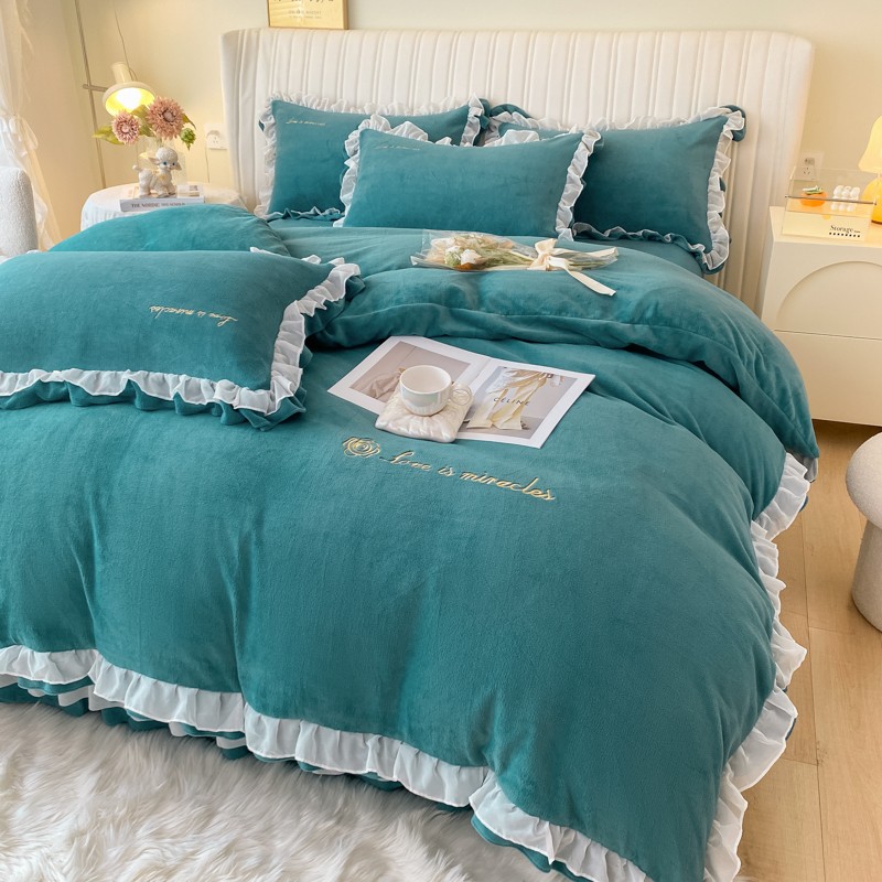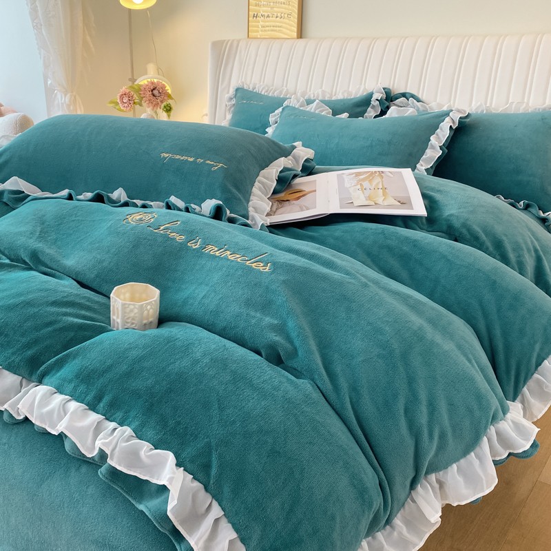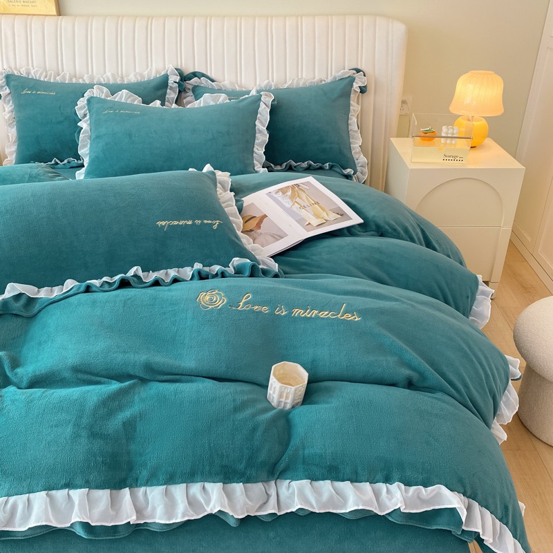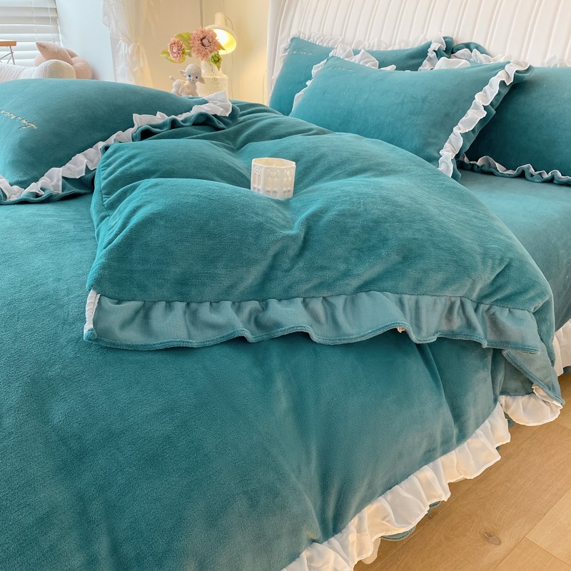 金丝鸟 2022新款200克韩式公主风花边款牛奶绒四件套 祖母绿