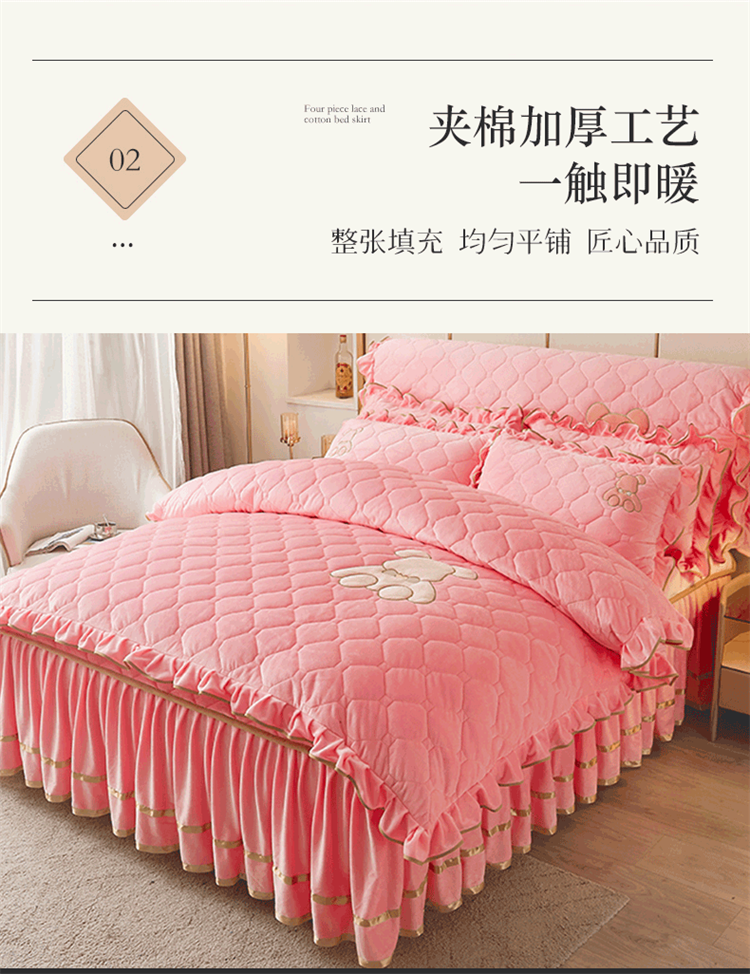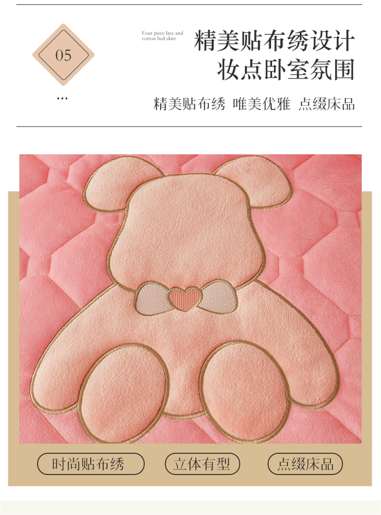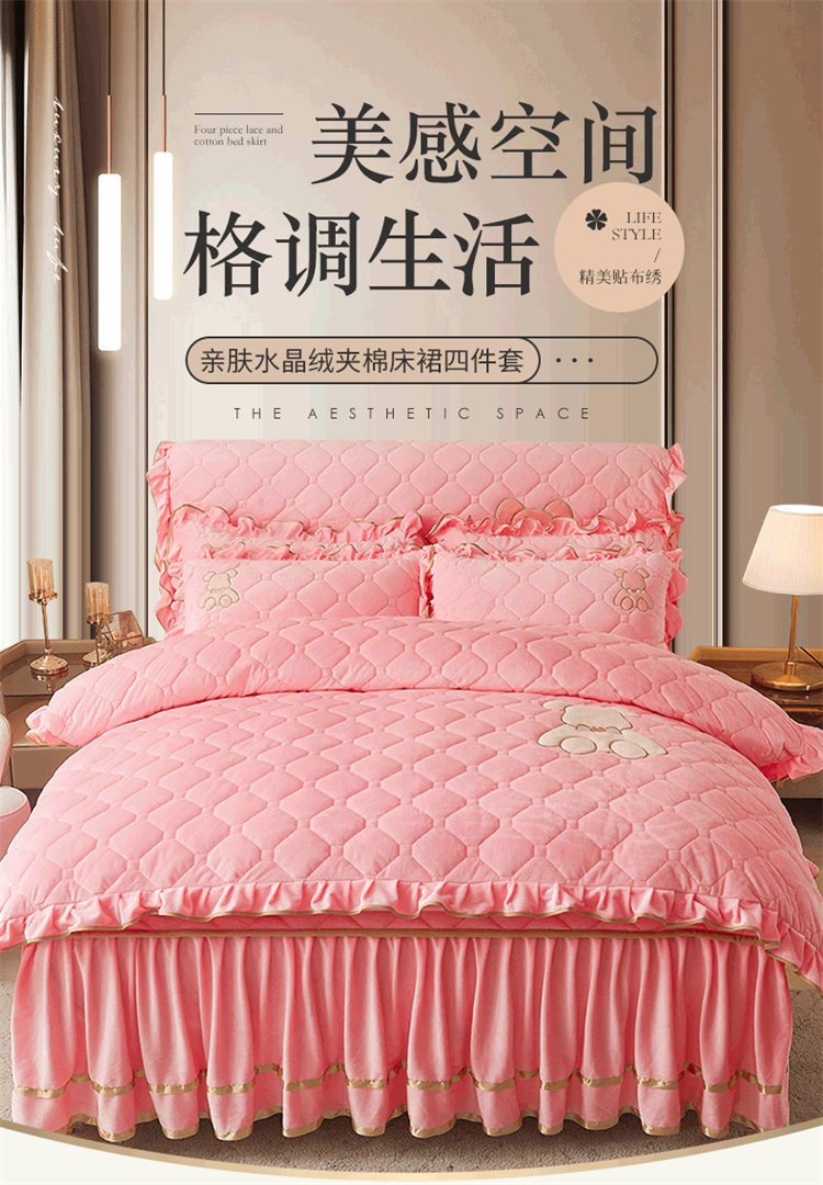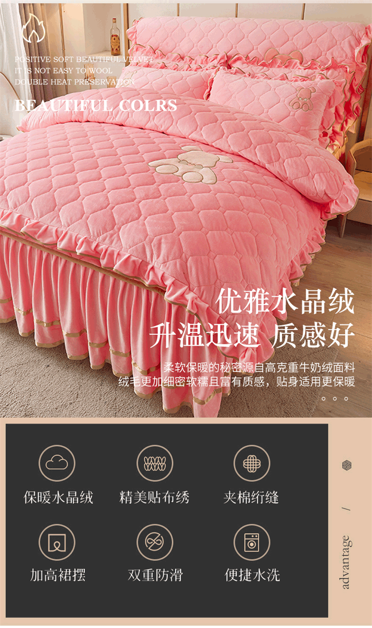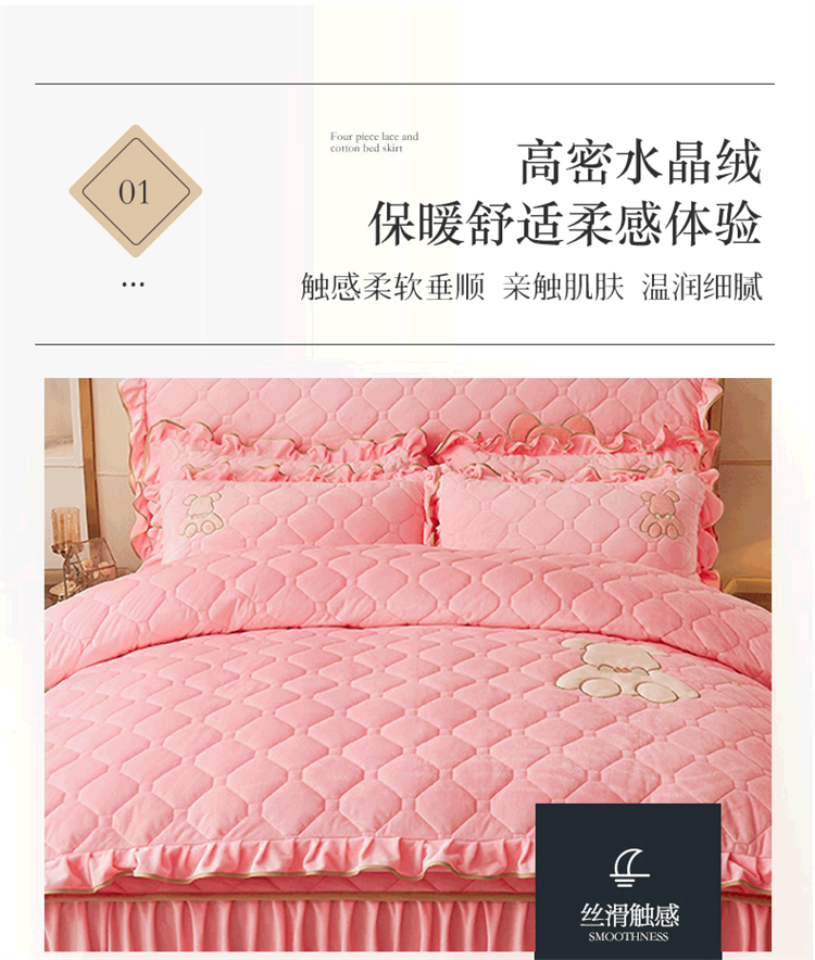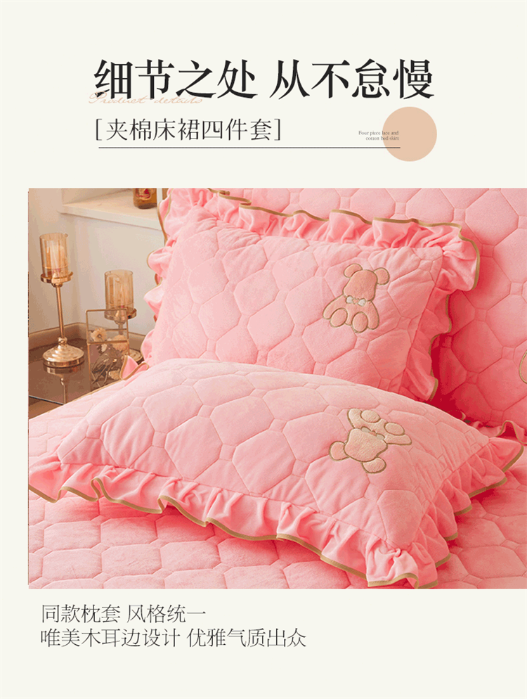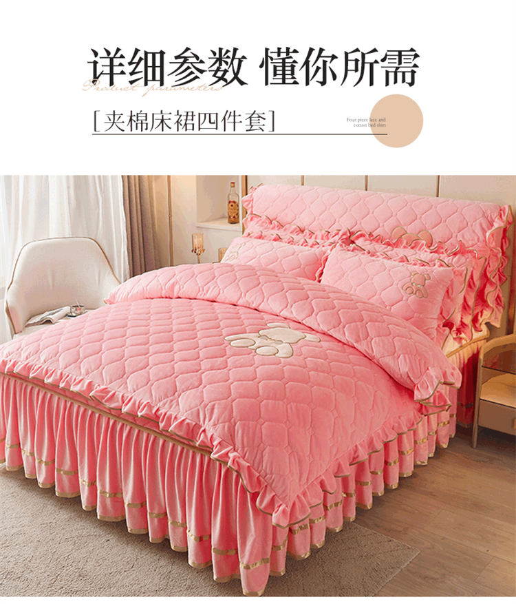 当前位置: 91家纺网 > 商品网购 > 床品套件 > 四件套 > 水晶绒四件套 > 屹成家纺 2024新款亲肤水晶绒夹棉床裙四件套-小熊款 粉玉