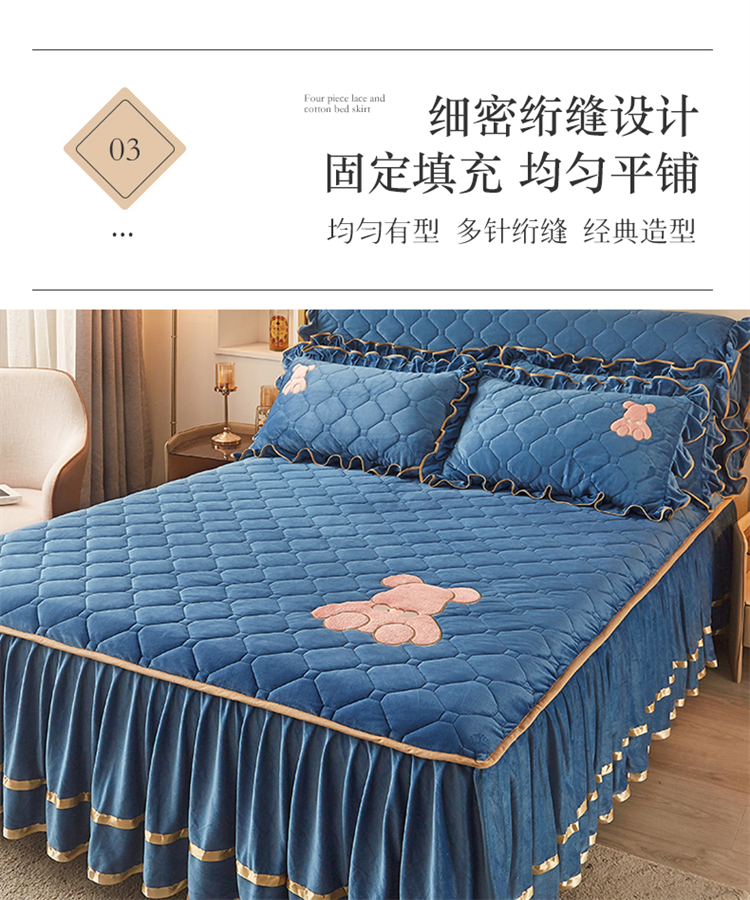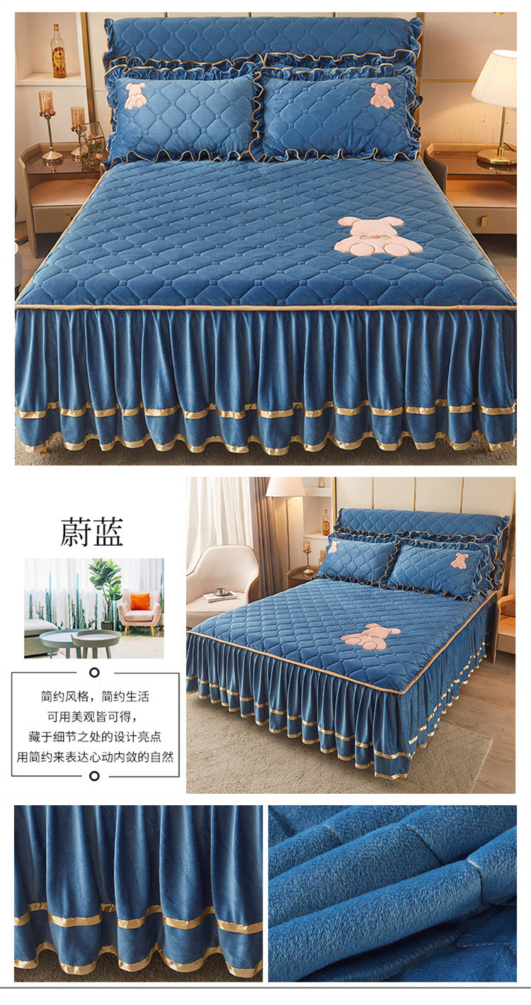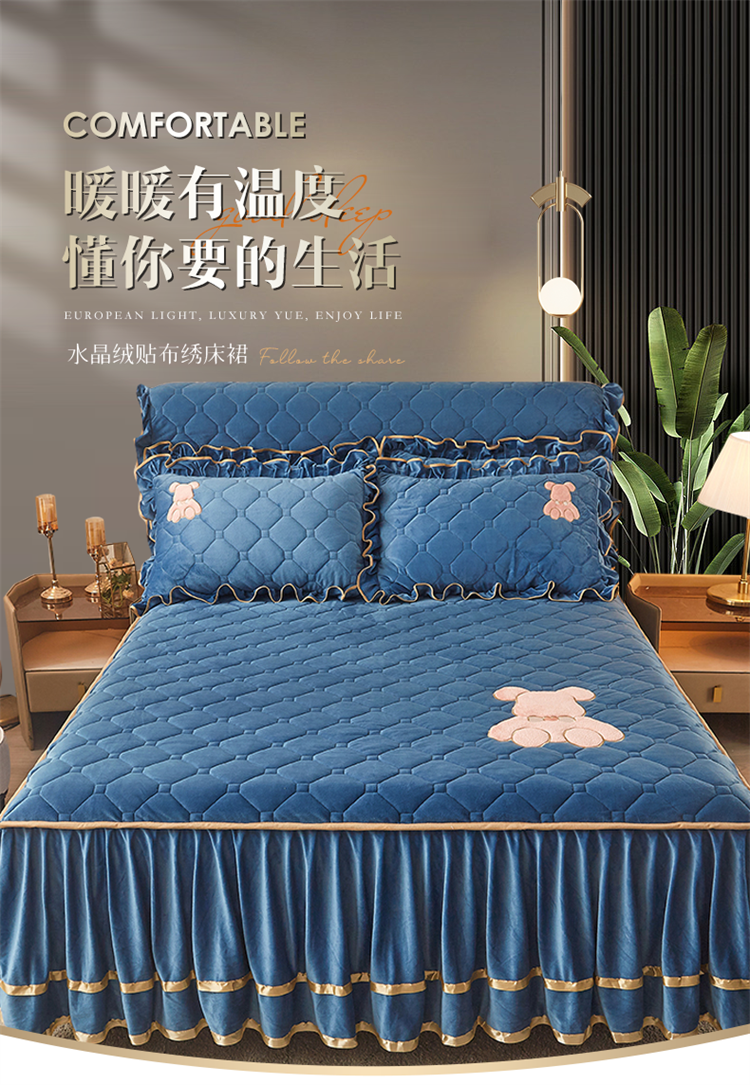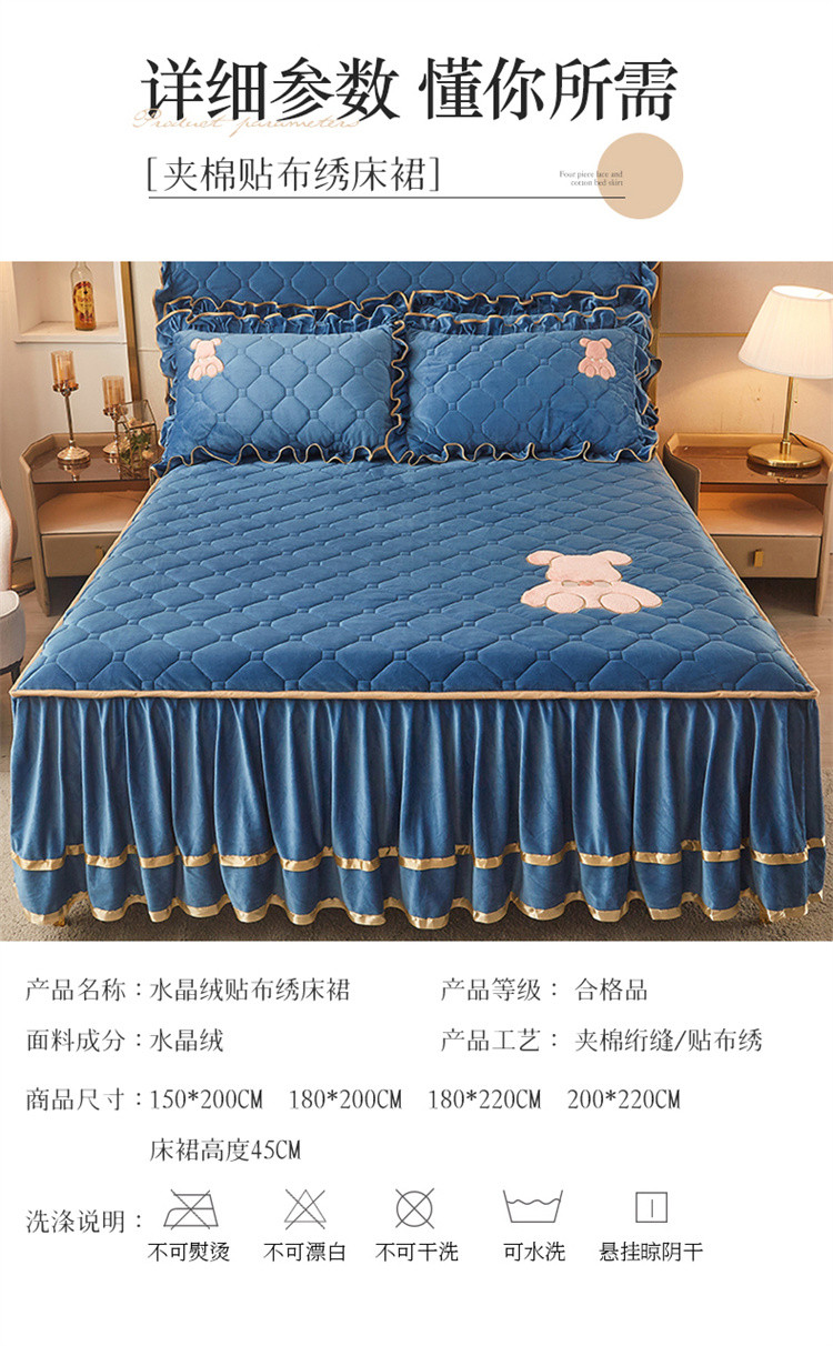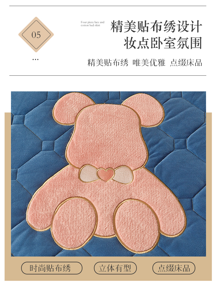 屹成 2024新款水晶绒夹棉床裙贴布绣款-小熊款 蔚蓝
