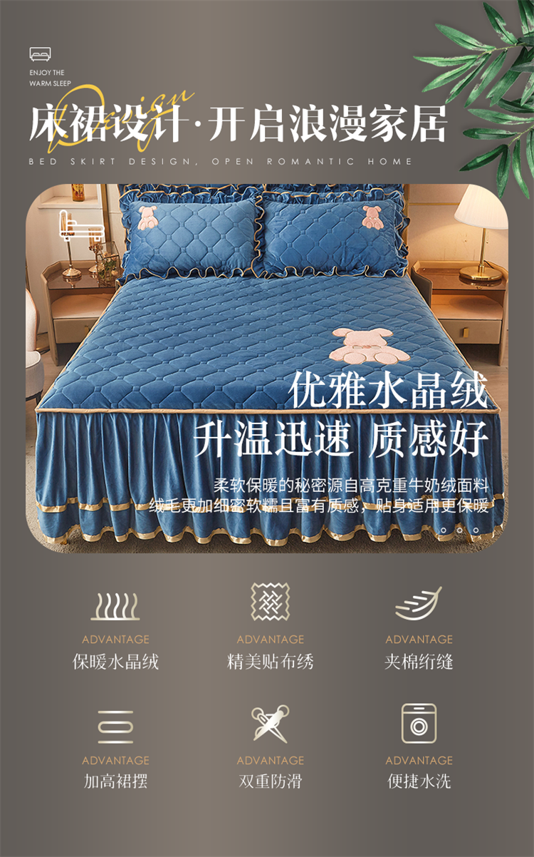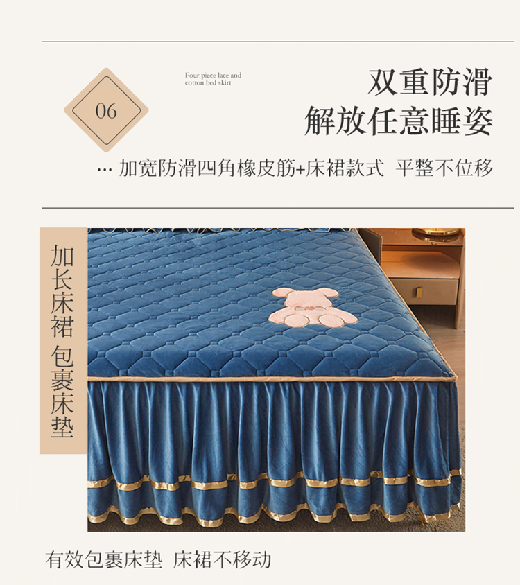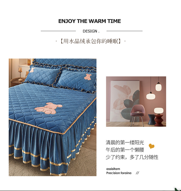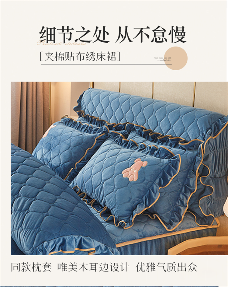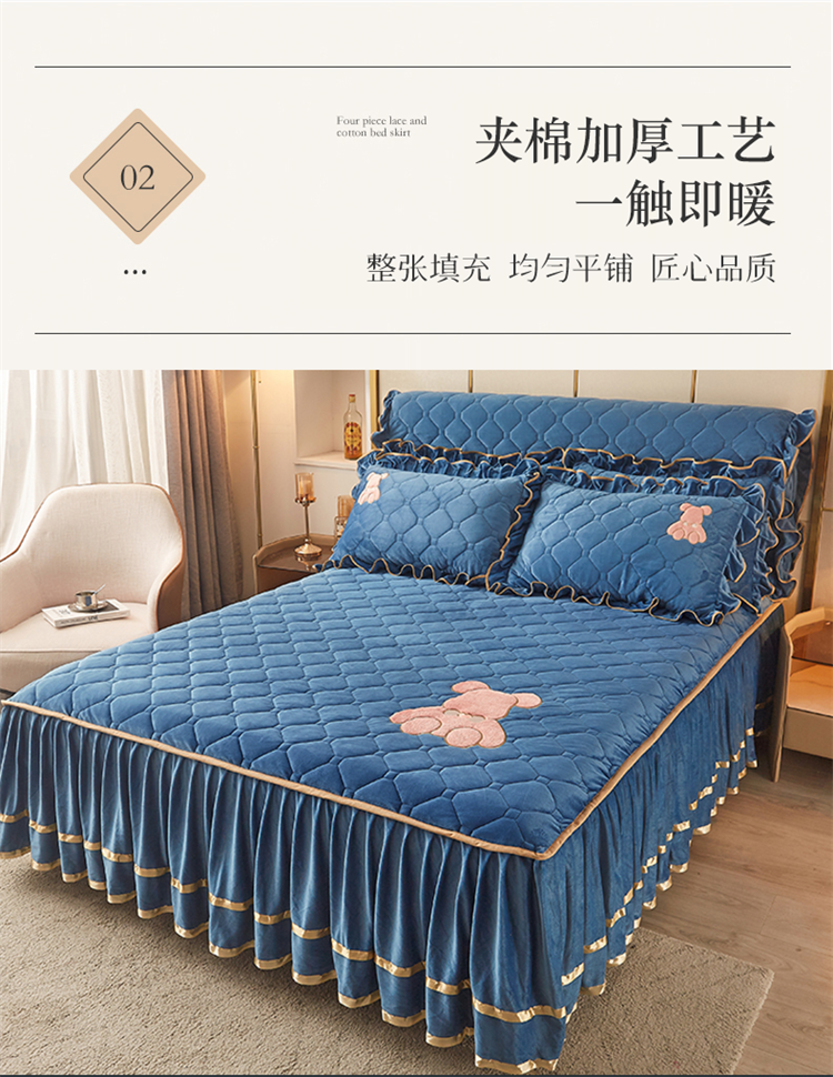 屹成 2024新款水晶绒夹棉床裙贴布绣款-小熊款 蔚蓝