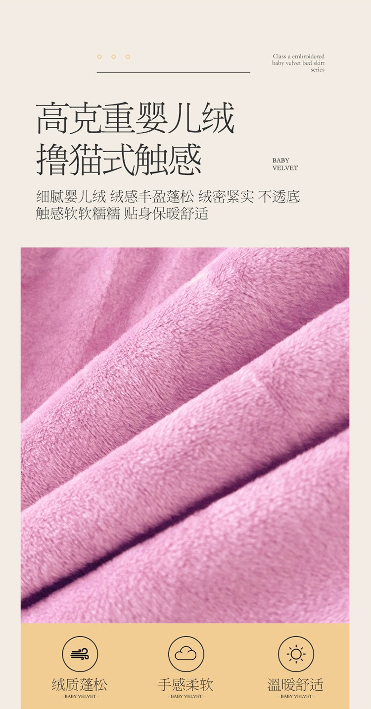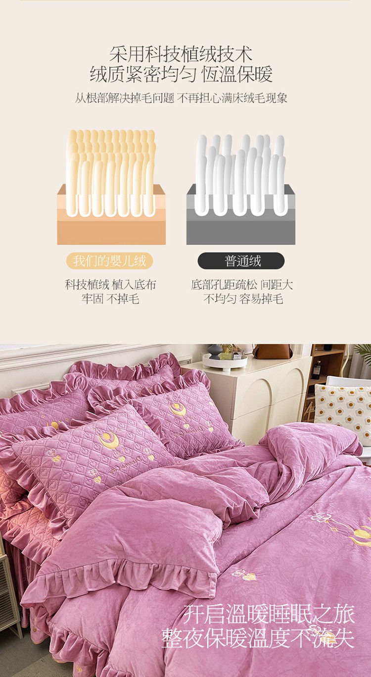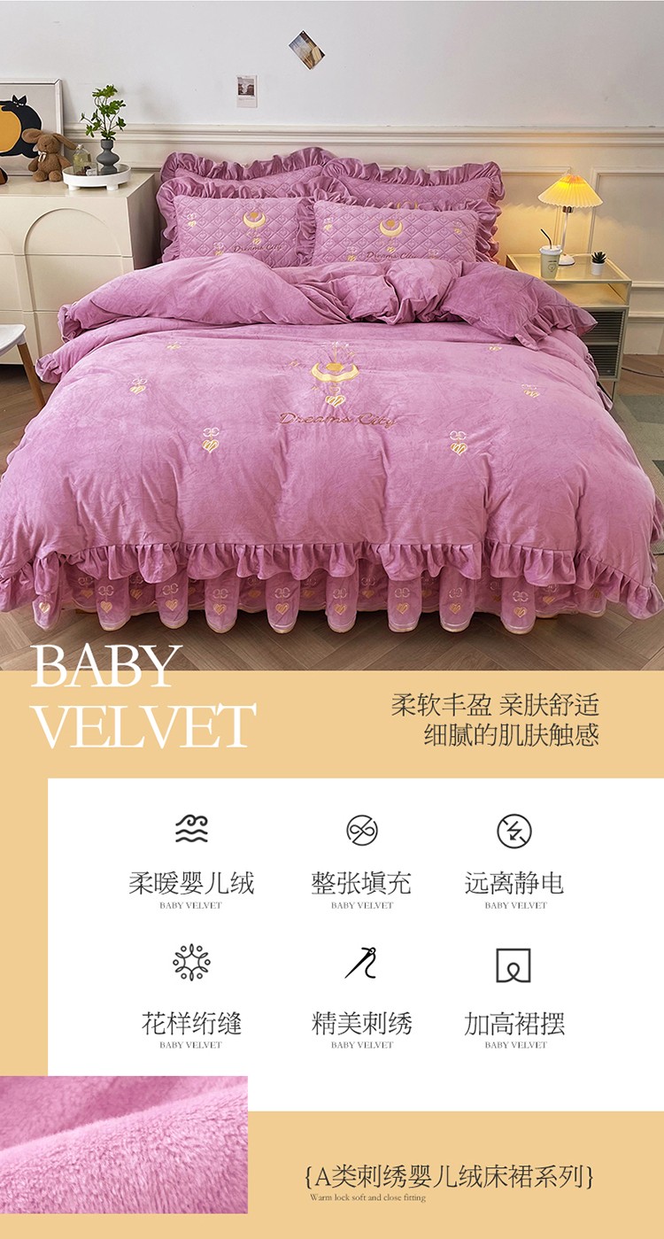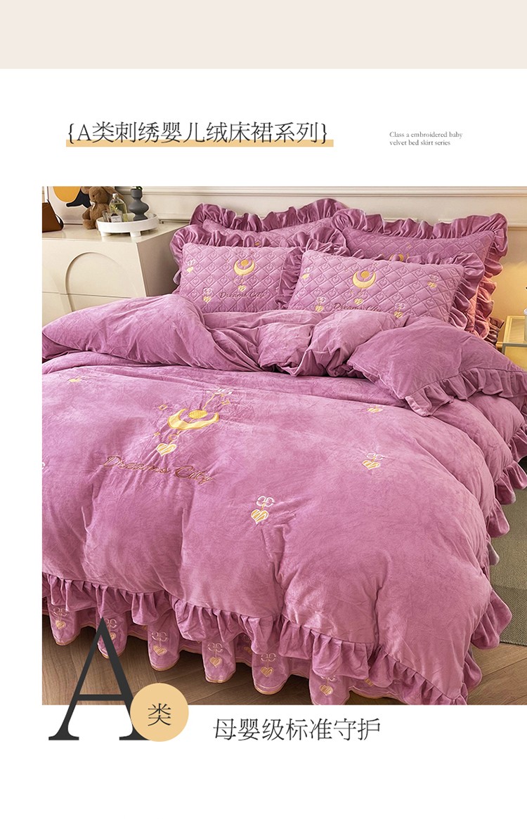 当前位置: 91家纺网 > 商品网购 > 床品套件 > 四件套 > 宝宝绒四件套 > 宜凡家纺 2022新款A类婴儿绒床裙星悦系列四件套 星悦-香芋紫