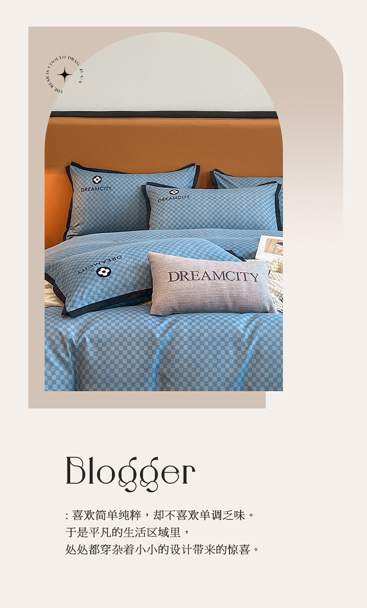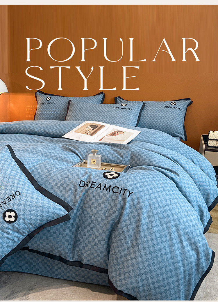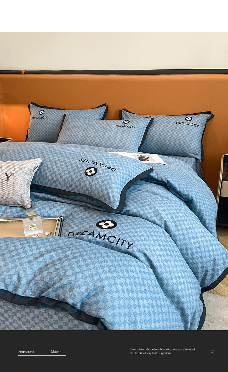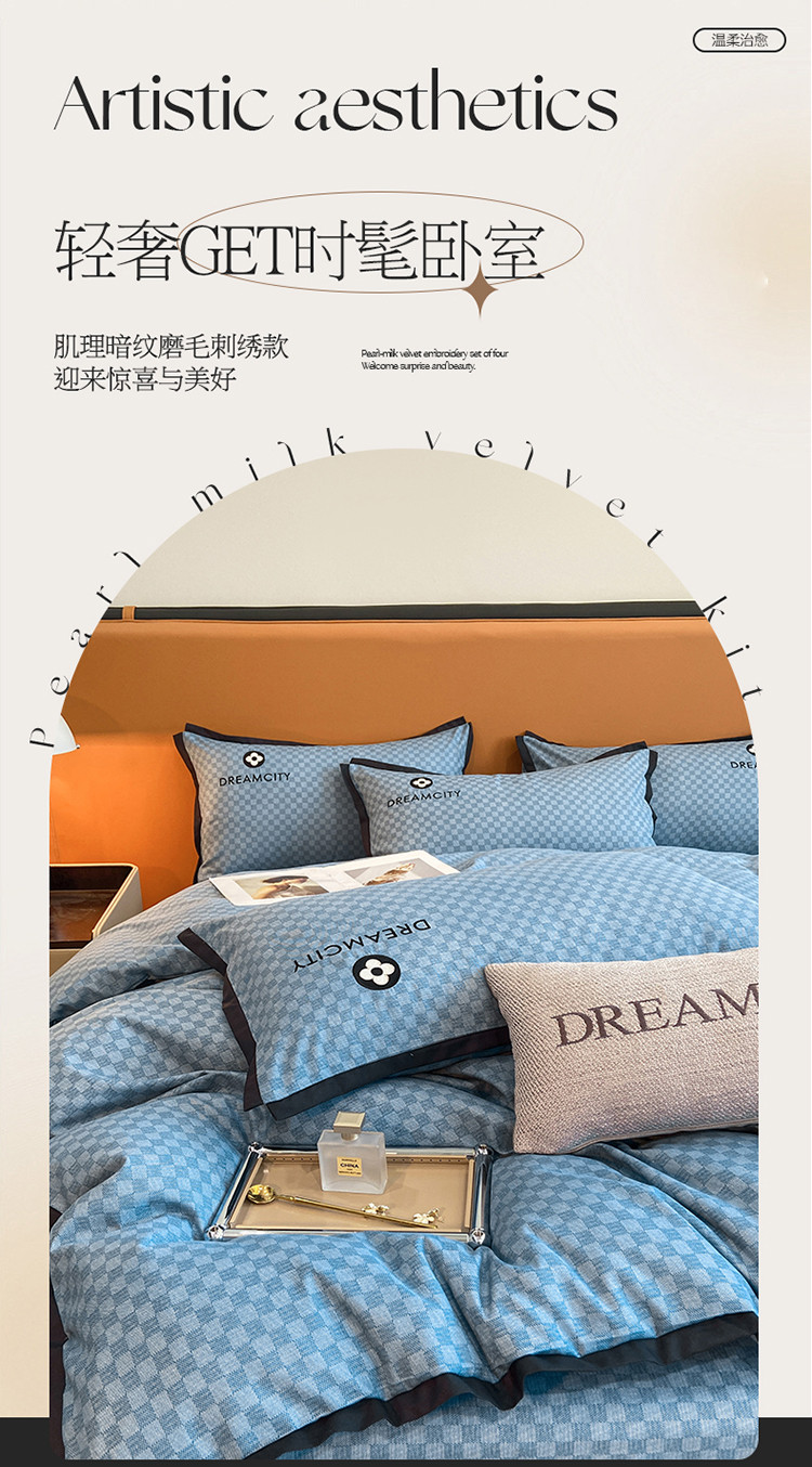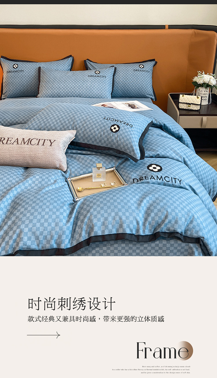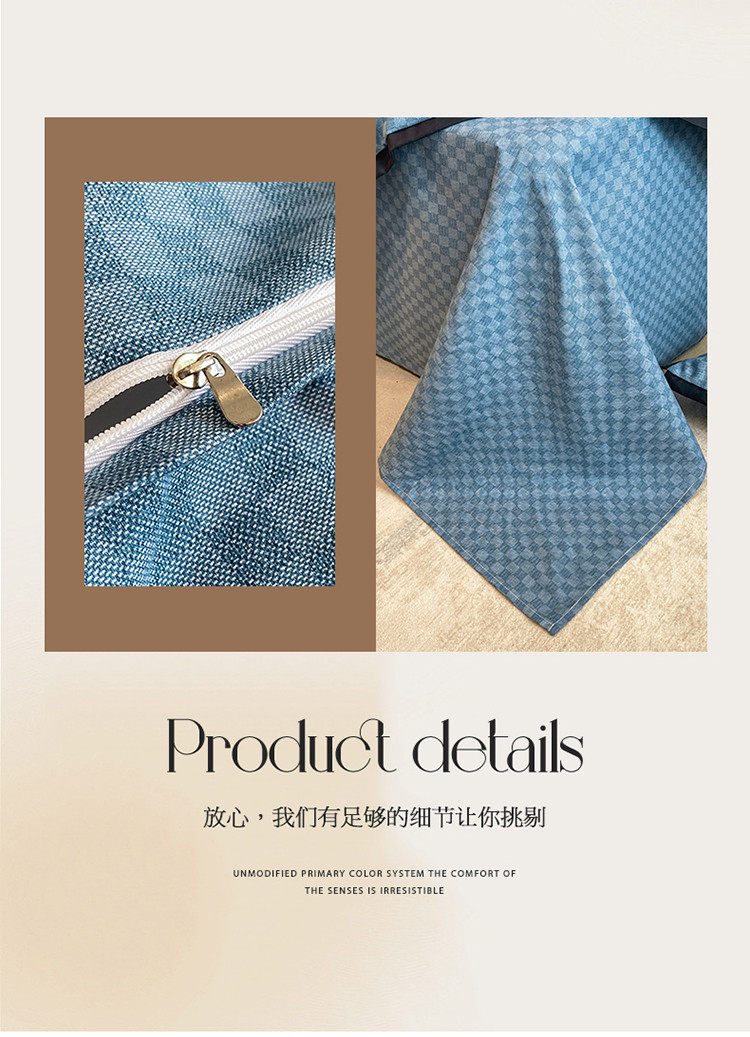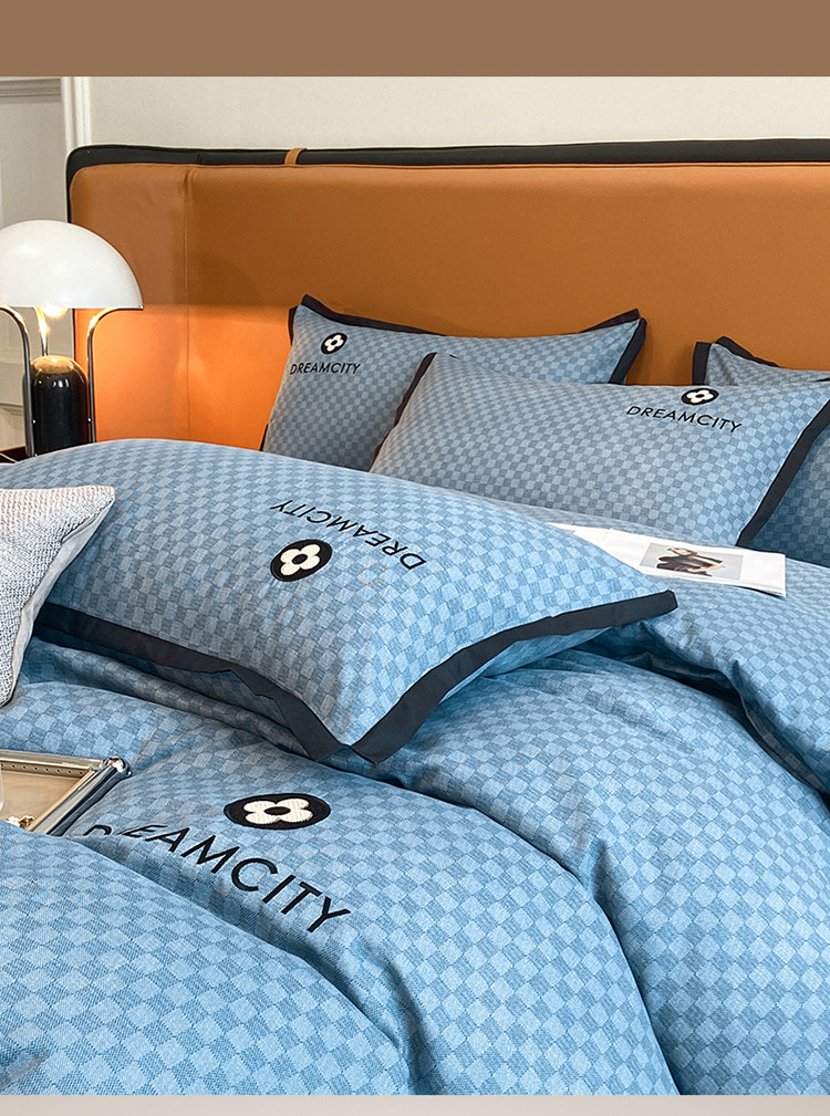 金麦 新款肌理纹加厚磨毛刺绣棋盘格四件套—赫本系列 蓝
