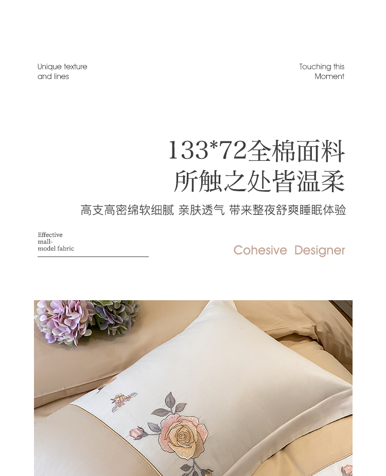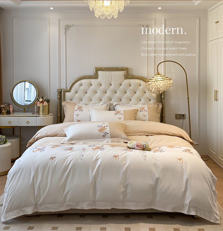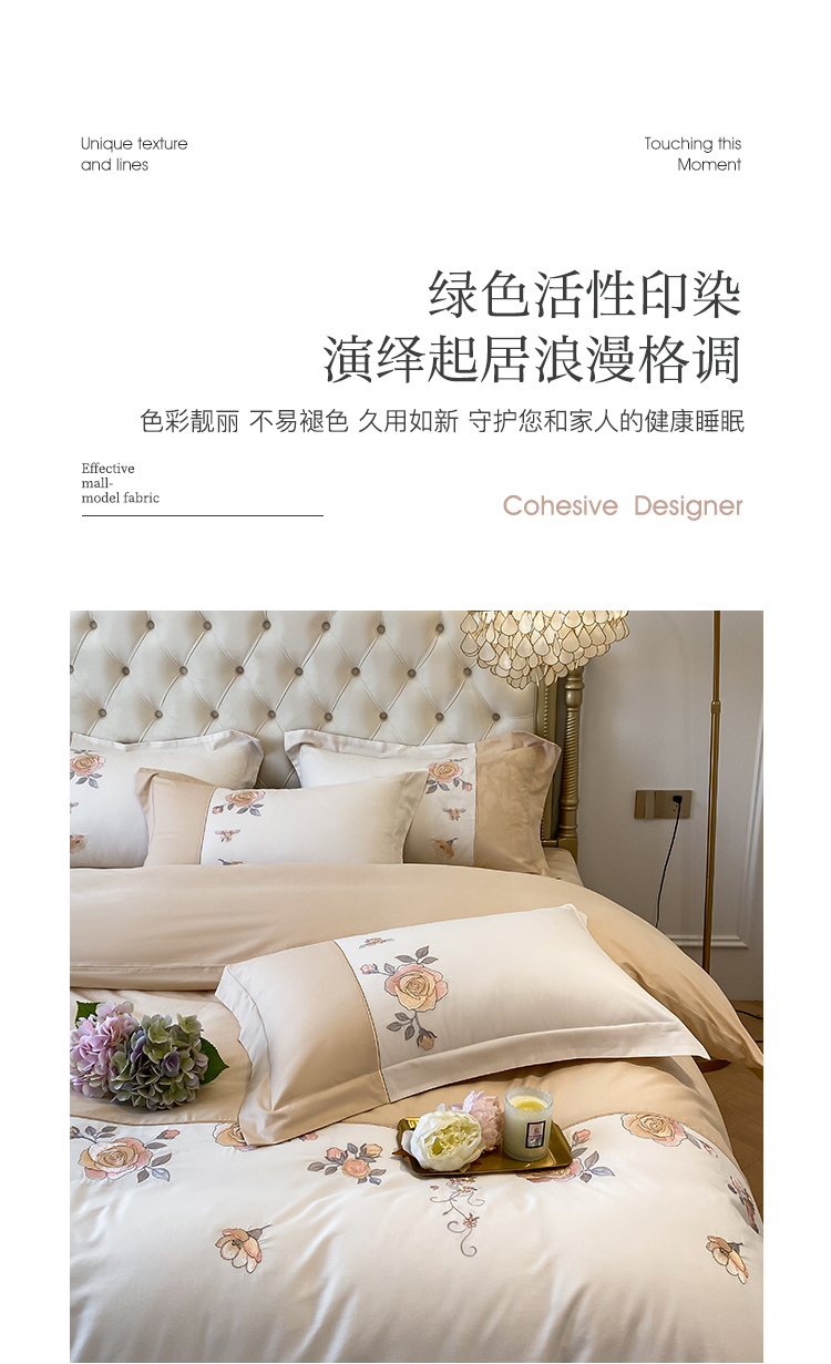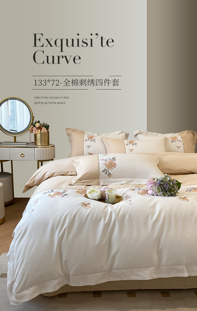 (总)理想家家纺 2025新款纯棉轻奢刺绣四件套--心愿系列场景二,心愿粉,心愿红,心愿黄,心愿蓝
