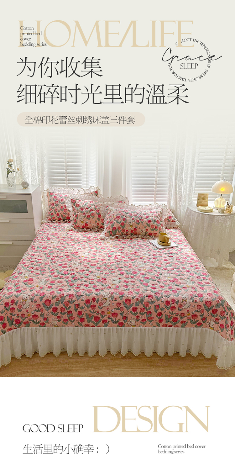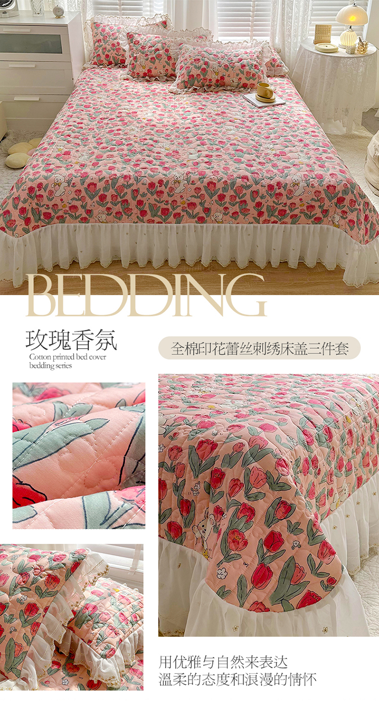 宜凡 2023新款全棉蕾丝刺绣床盖三件套 玫瑰香氛