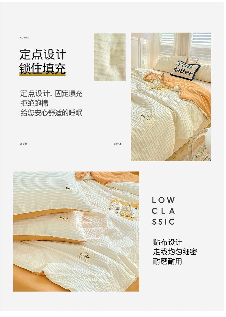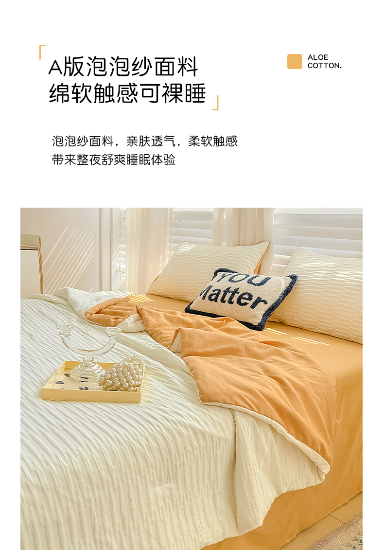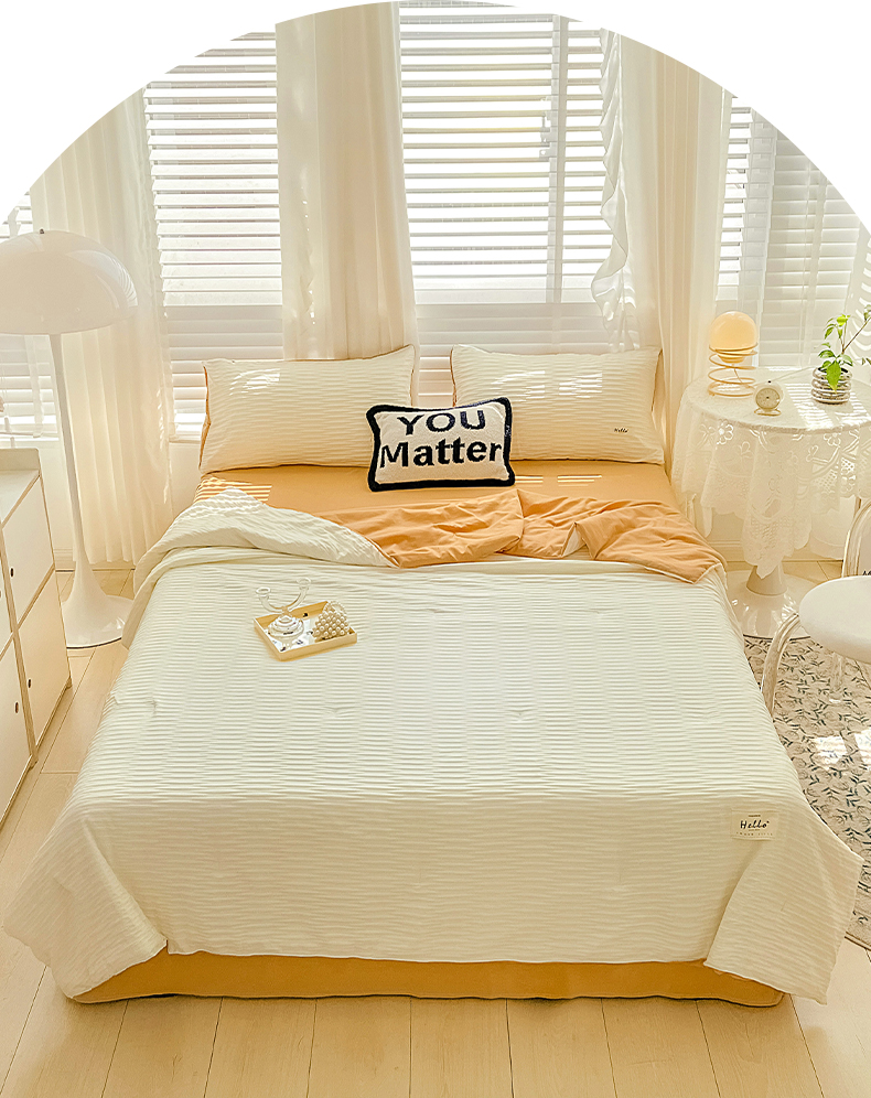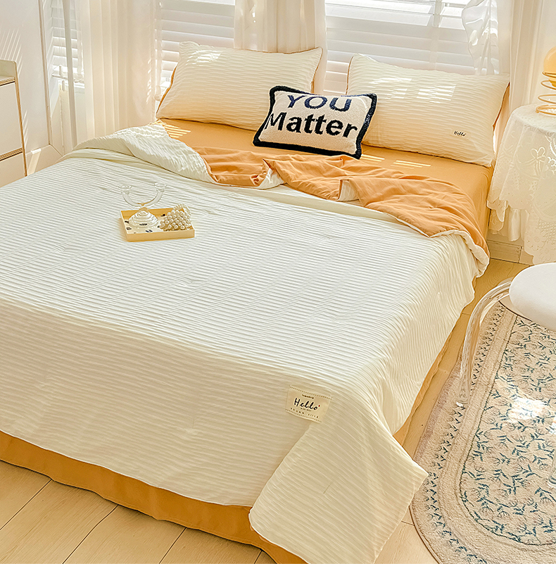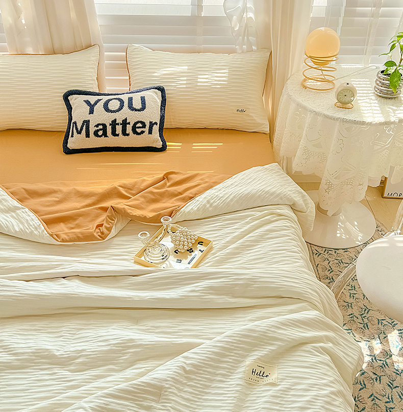 商品名称:天商 2025新款韩版泡泡纱水洗棉拼色床单夏被四件套 米白橙