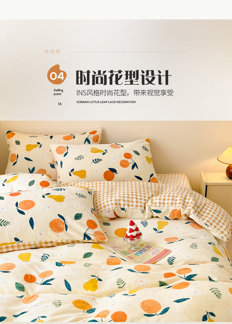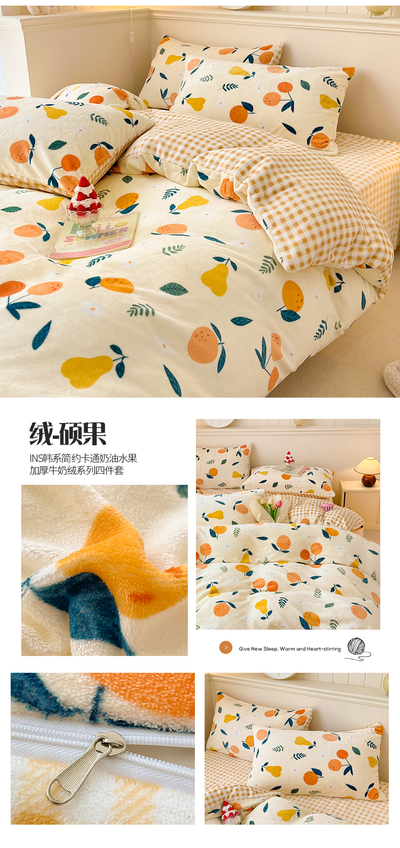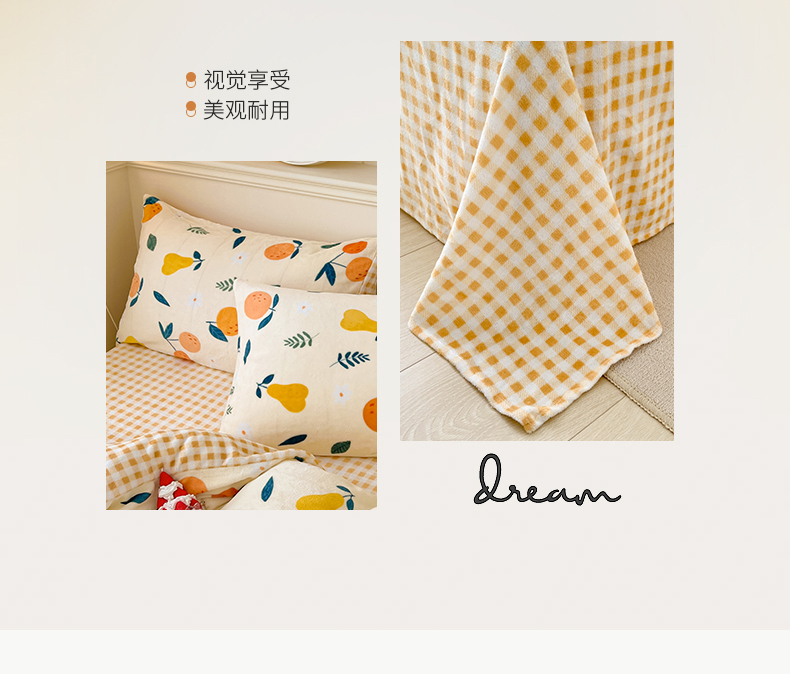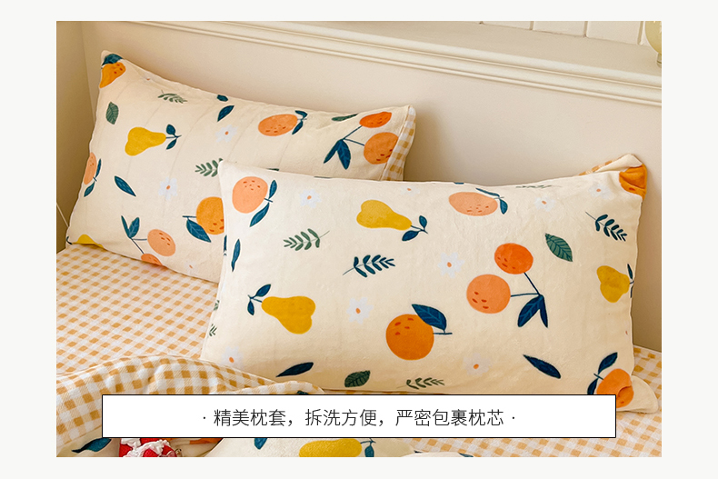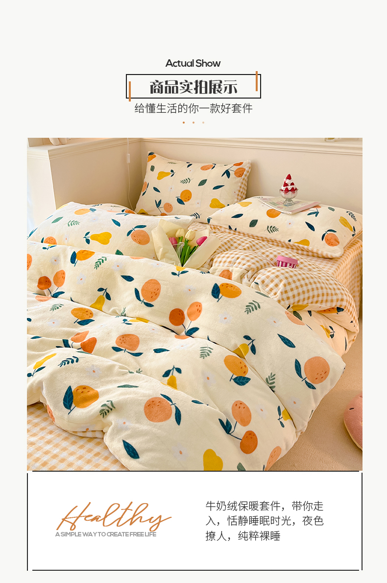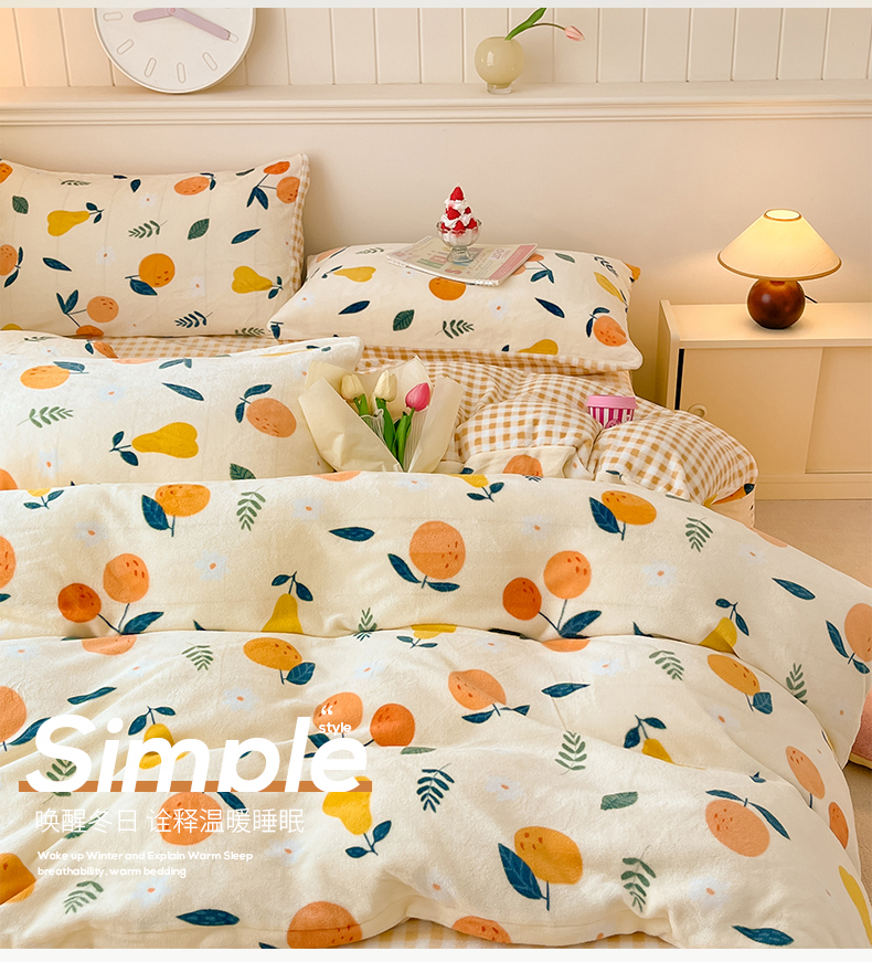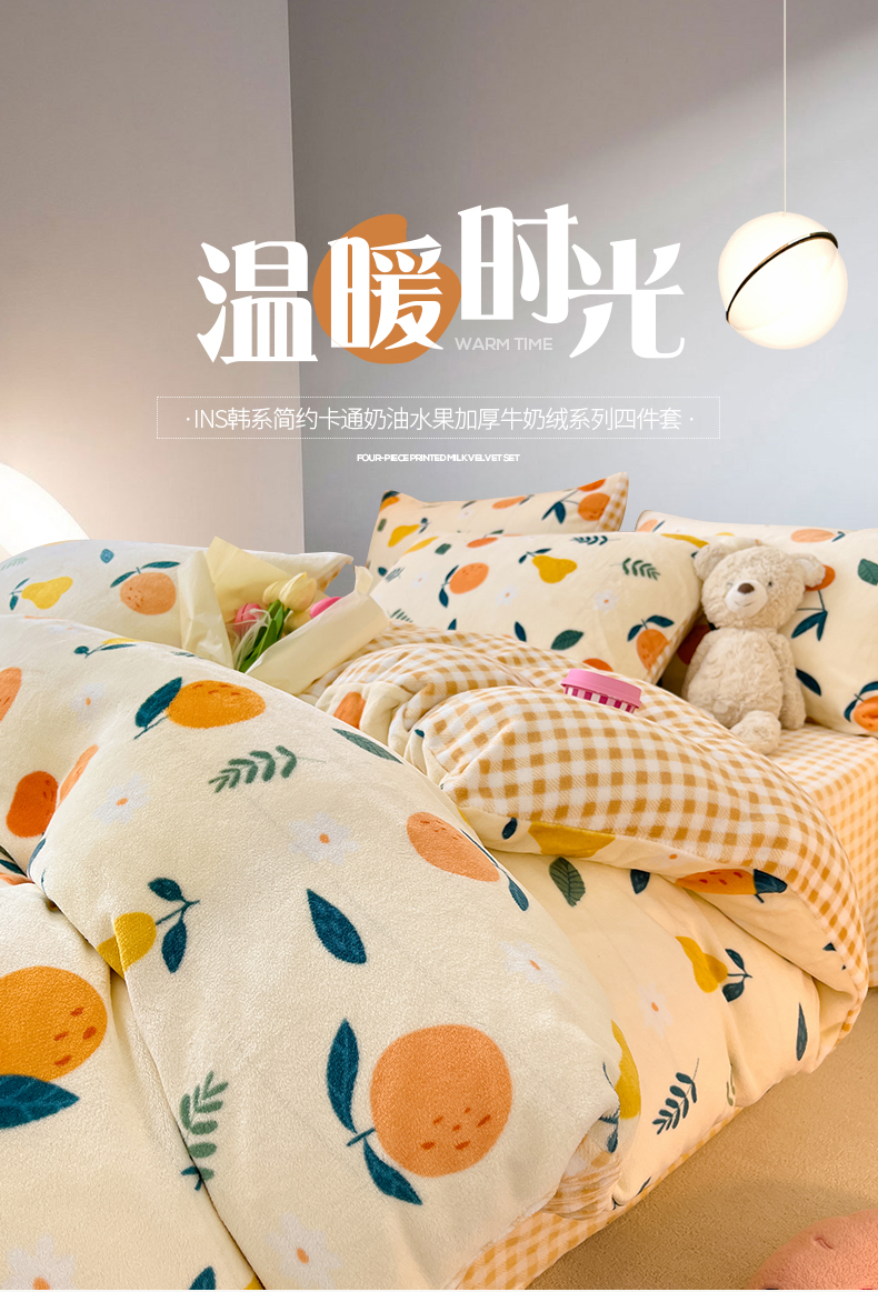 商品名称:桃子家居 2023新款ins韩系简约卡通奶油小清新加厚牛奶绒系列四件套 绒-硕果