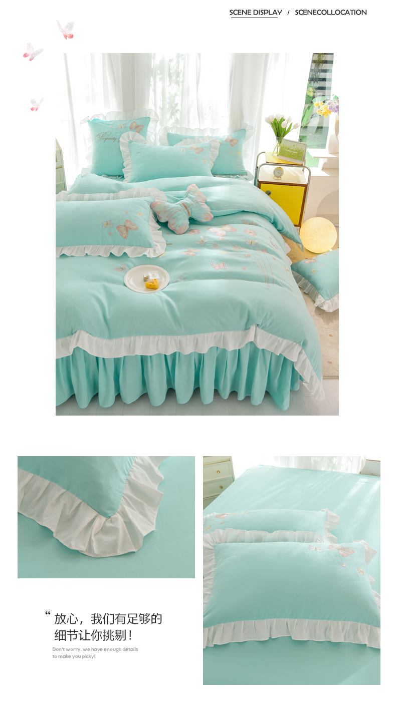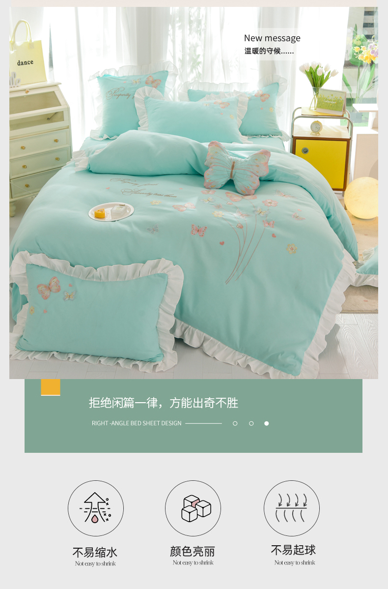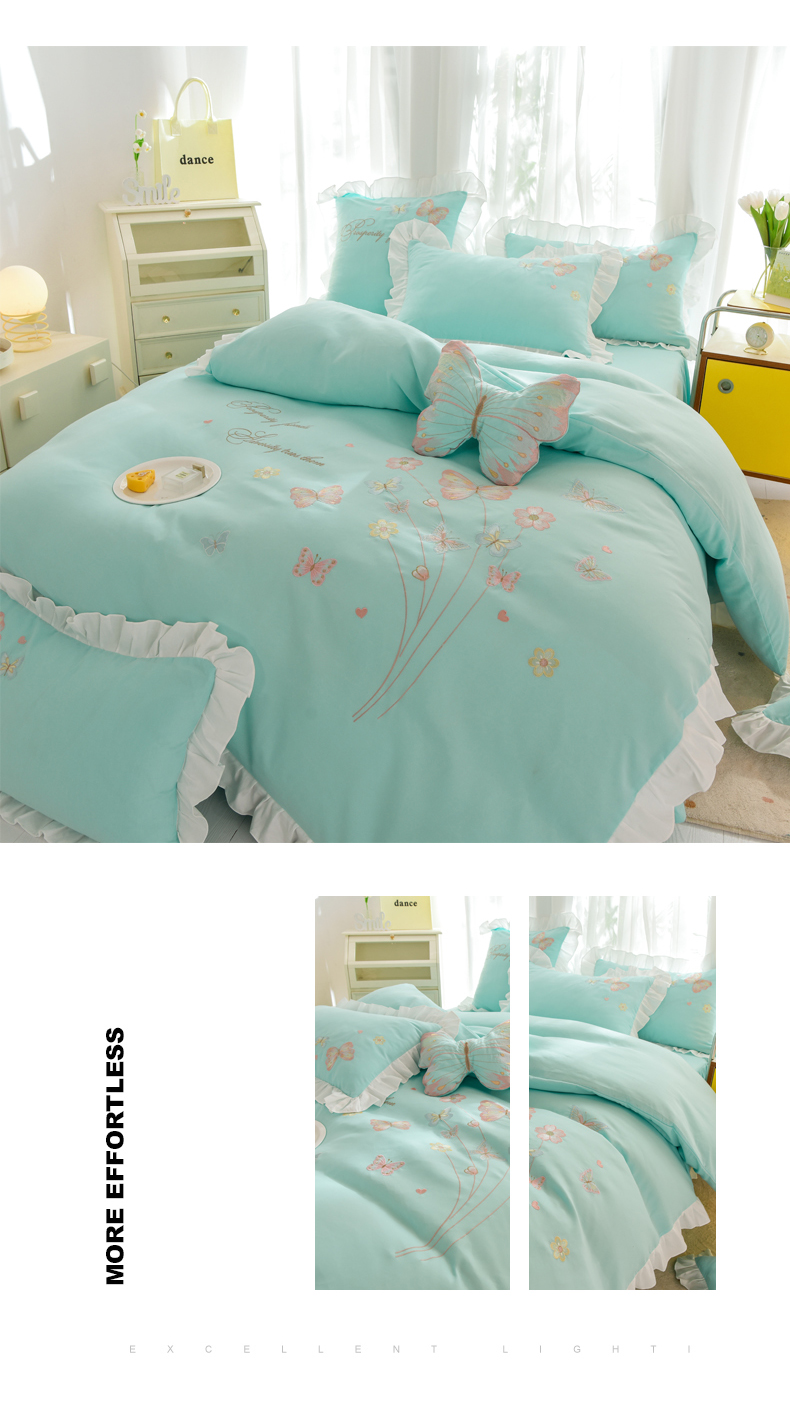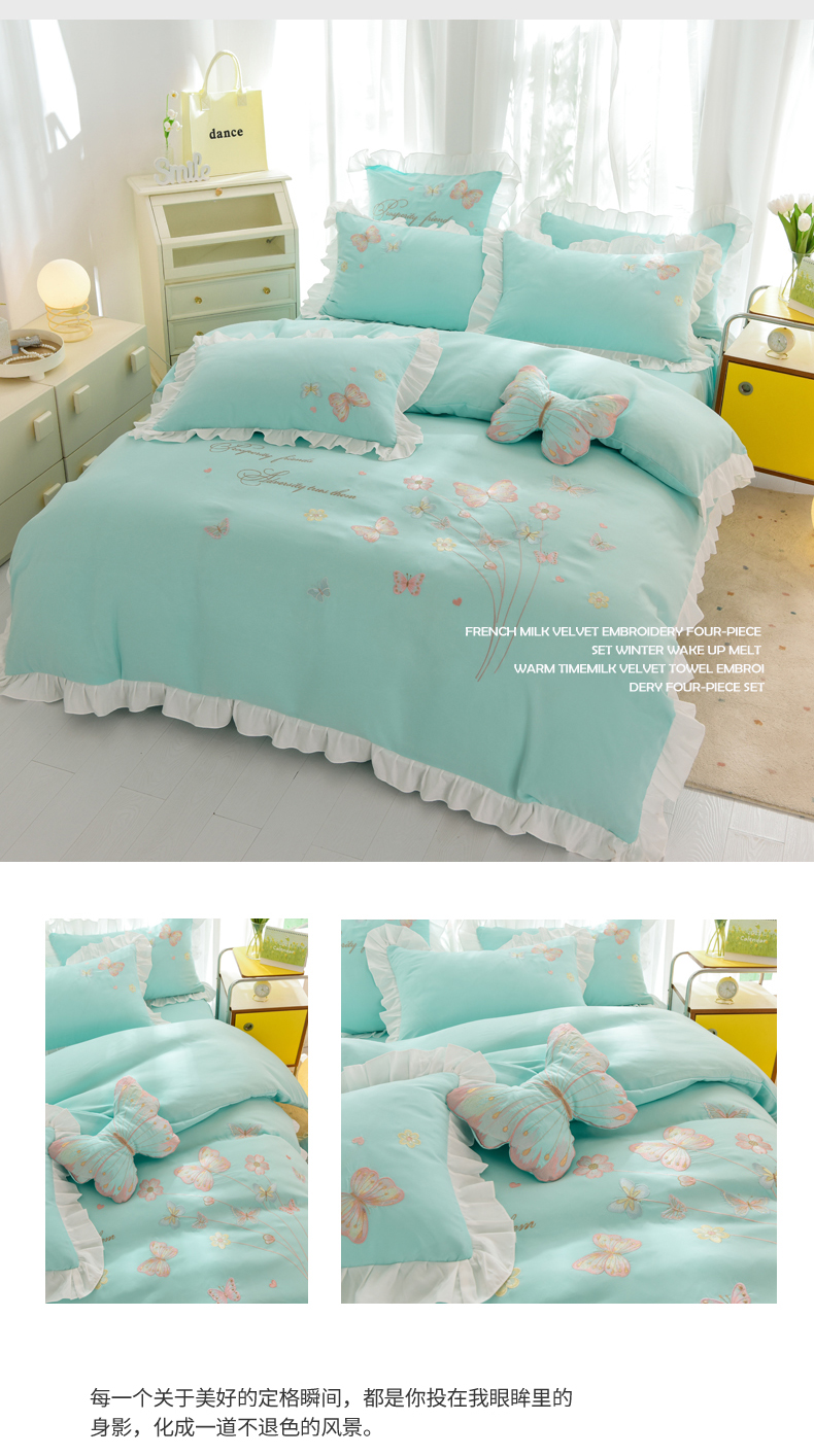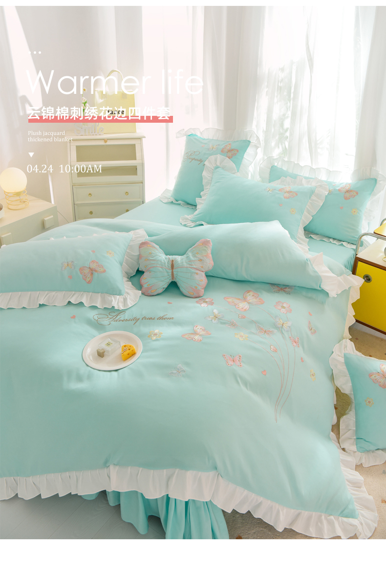 当前位置: 91家纺网 > 商品网购 > 床品套件 > 四件套 > 化纤活性四件套 > 丝印良品 2023新款秋冬保暖云锦棉刺绣花边春卉系列四件套 春卉-碧绿