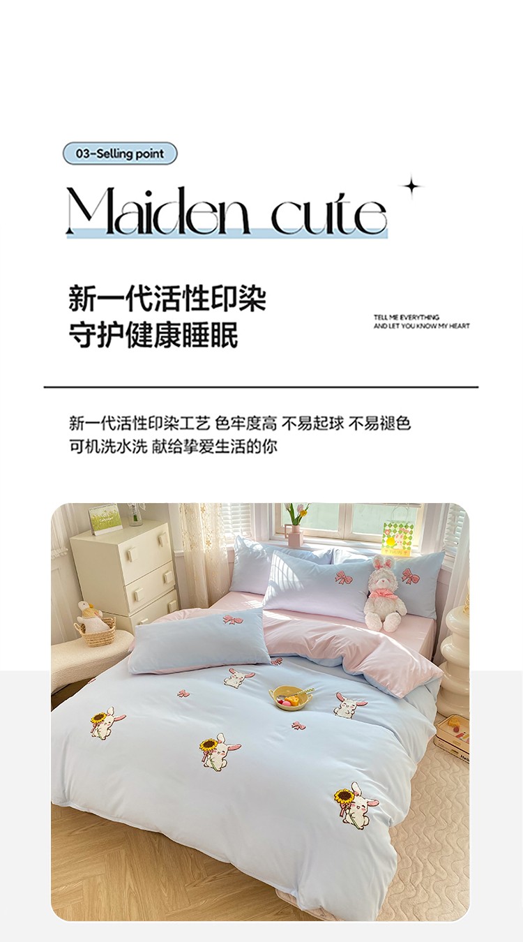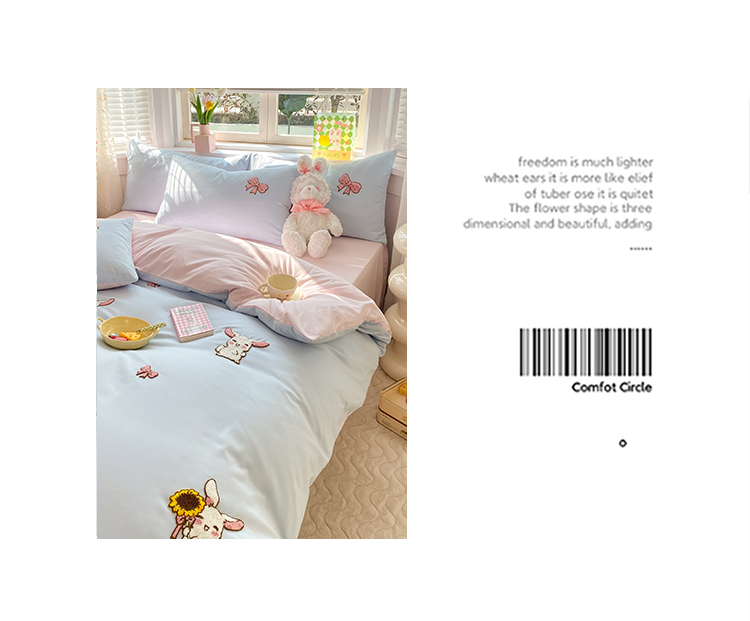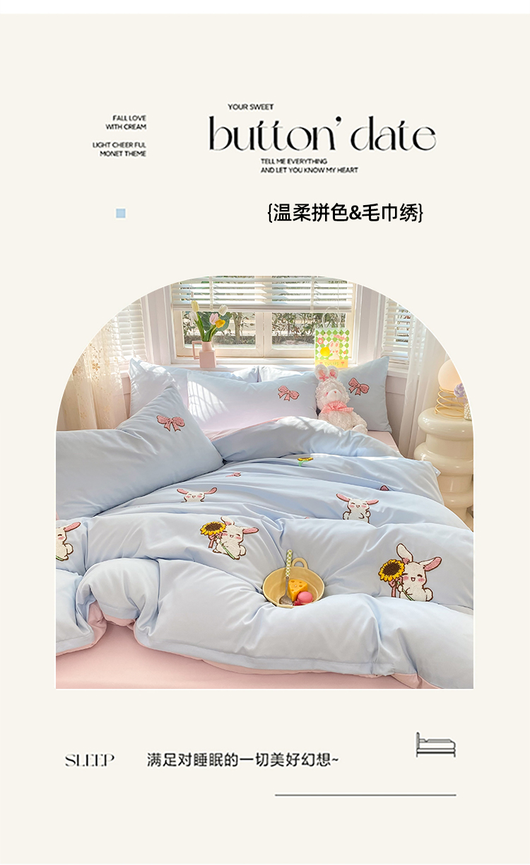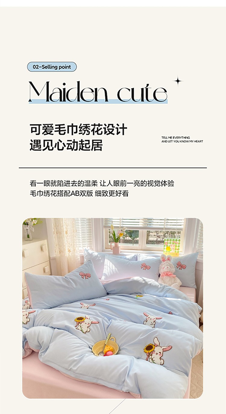 商品名称:欧冠 2023新款秋冬保暖专版水洗棉麻毛巾绣四件套 兔宝贝-兰