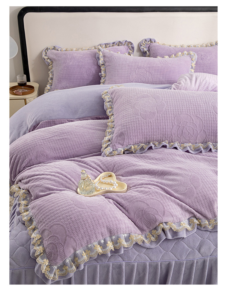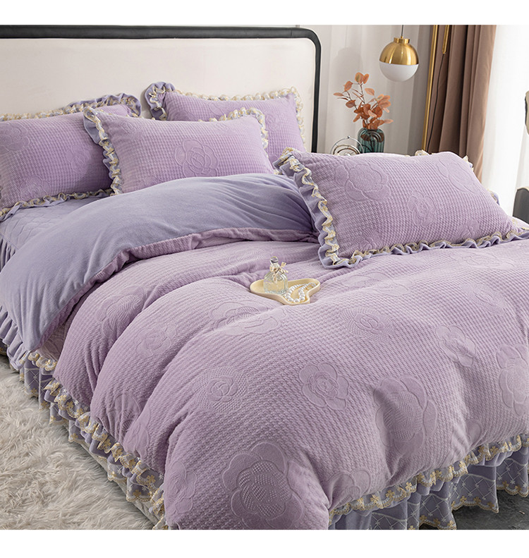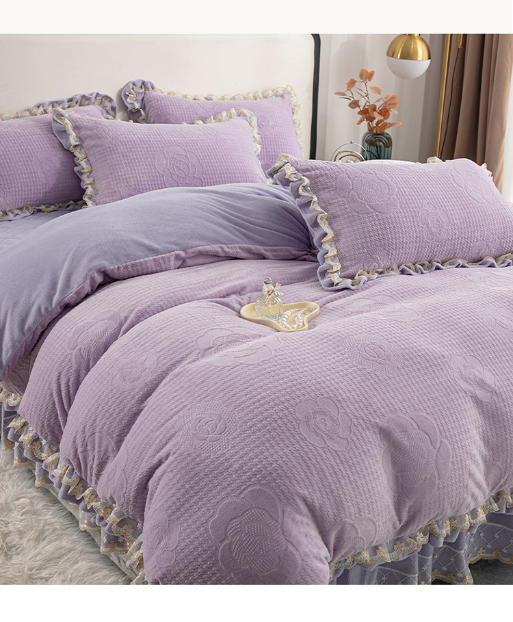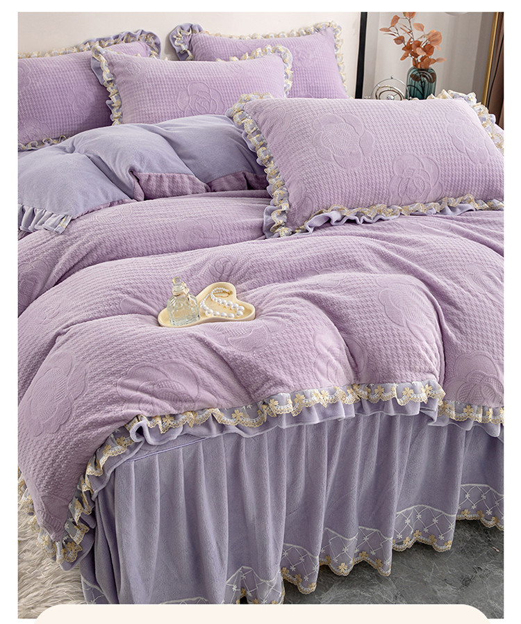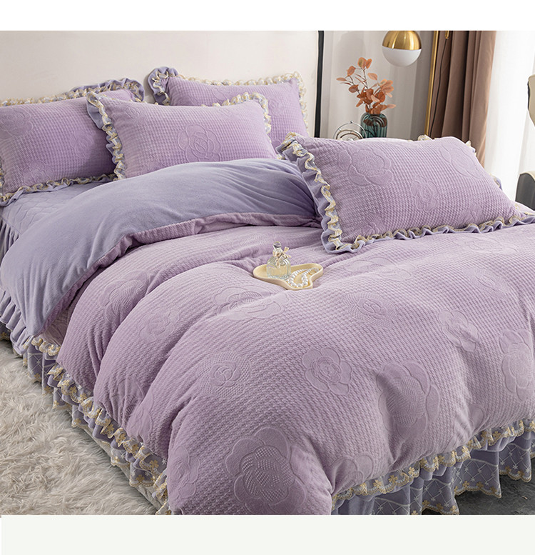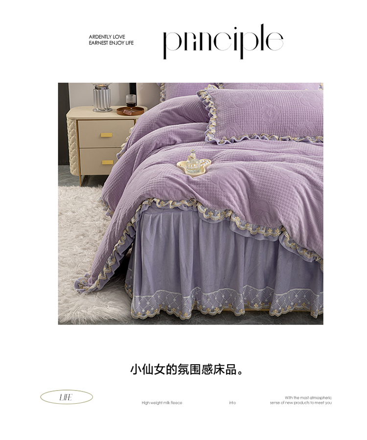 当前位置: 91家纺网 > 商品网购 > 床品套件 > 四件套 > 牛奶绒四件套 > 青竹苑 2023新款网红款牛奶绒雕花绗缝床裙款四件套 莫妮紫