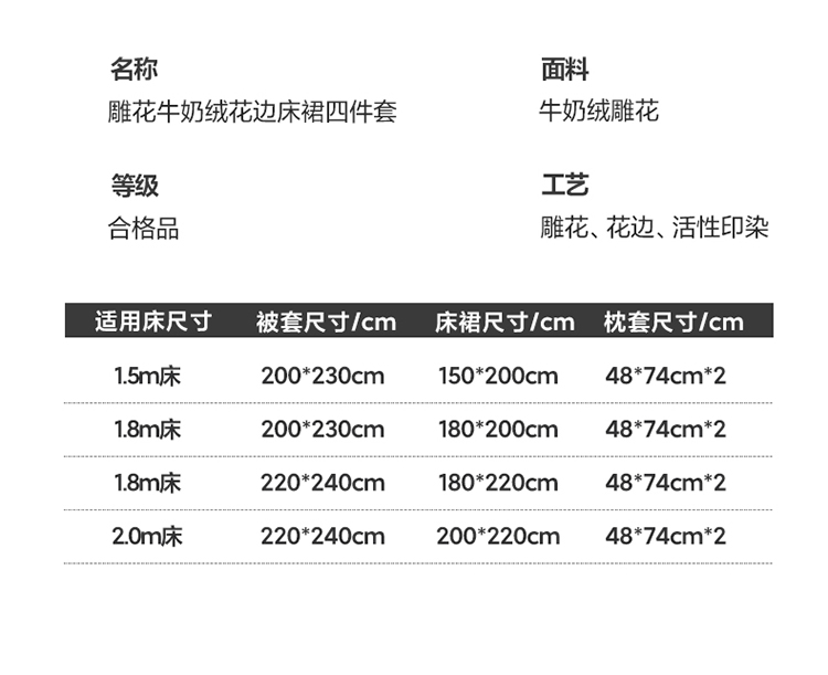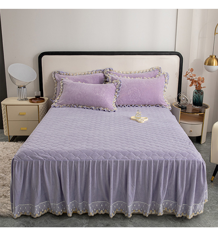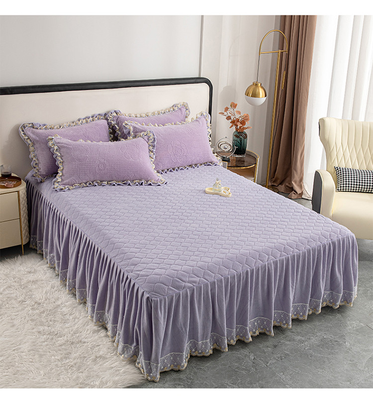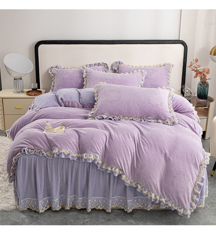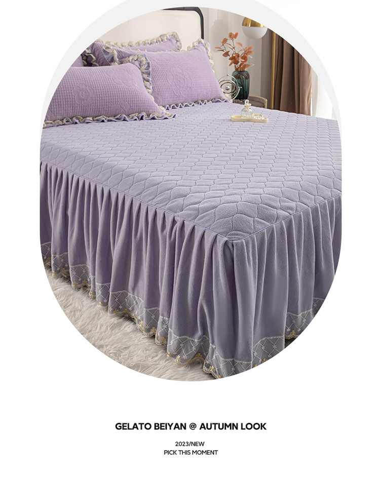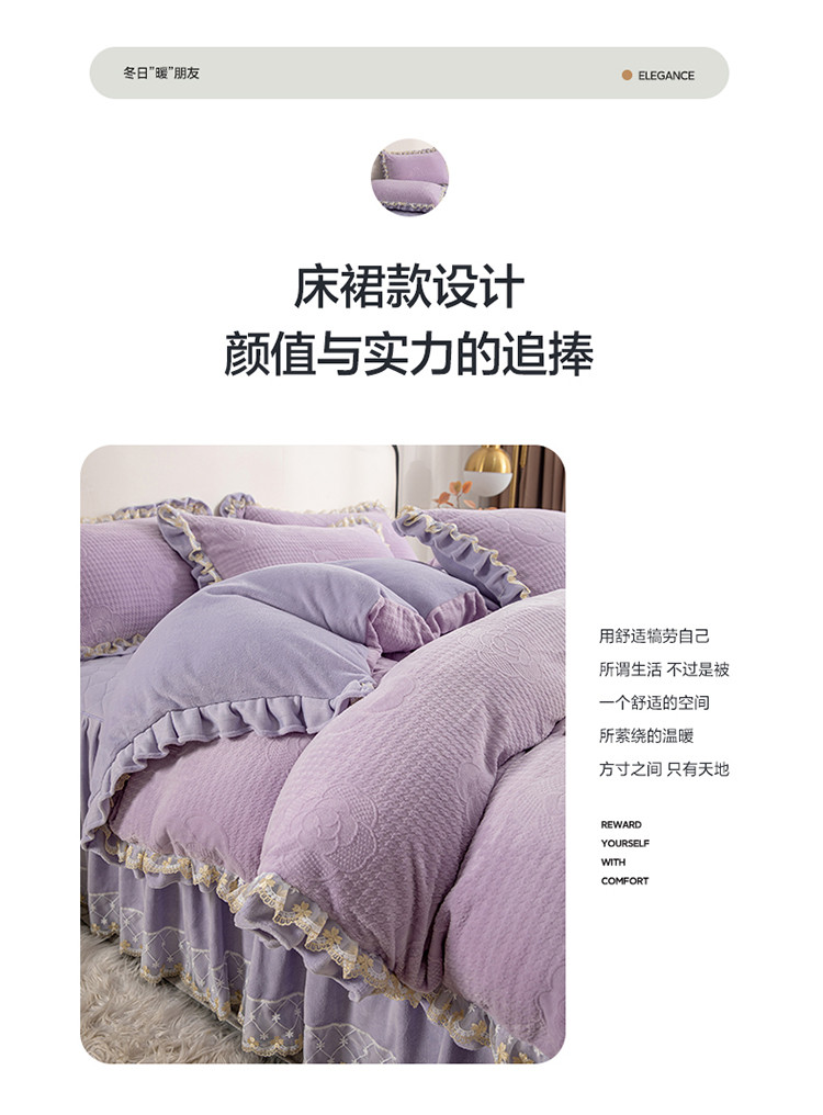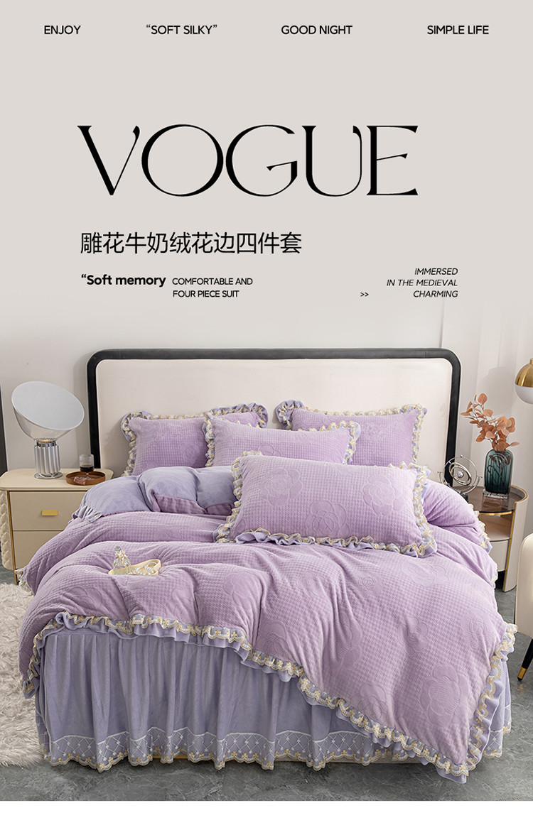 当前位置: 91家纺网 > 商品网购 > 床品套件 > 四件套 > 牛奶绒四件套 > 青竹苑 2023新款网红款牛奶绒雕花绗缝床裙款四件套 莫妮紫