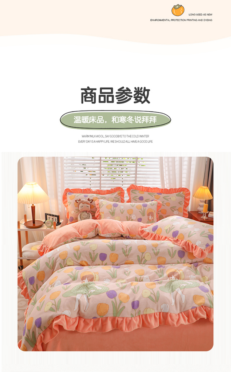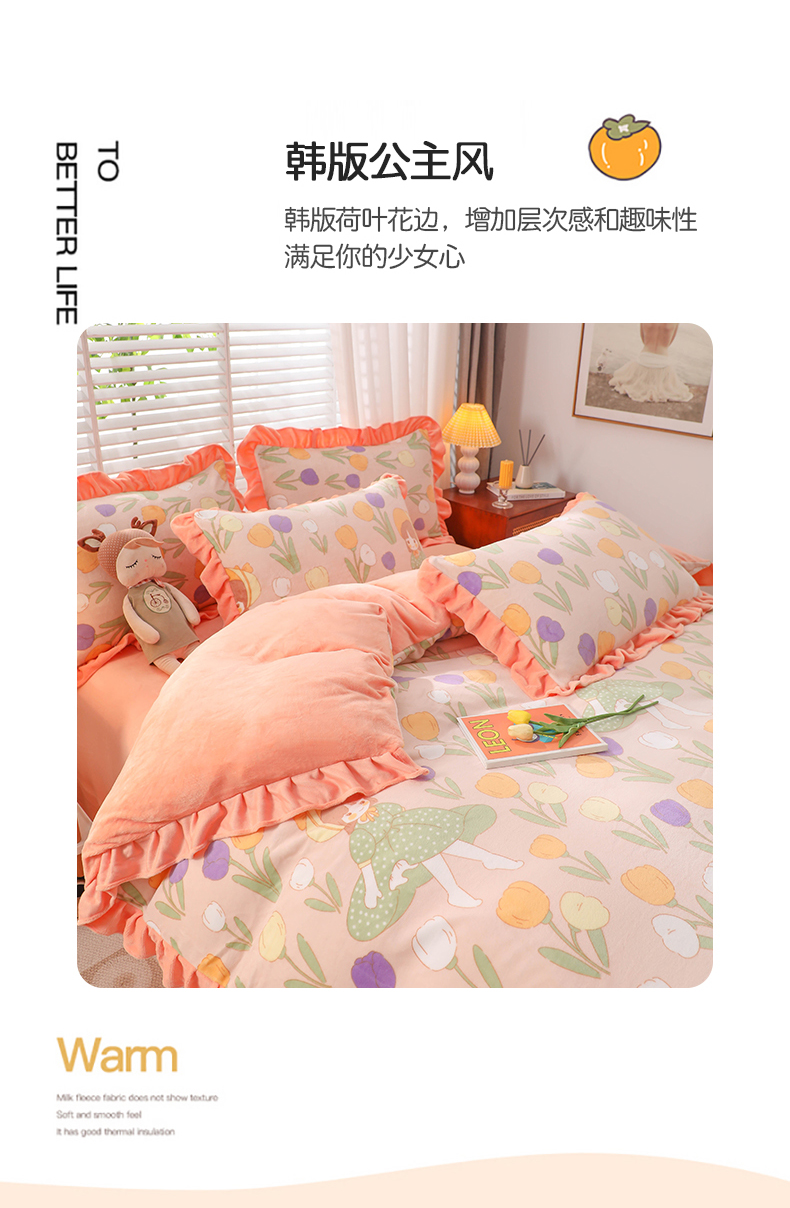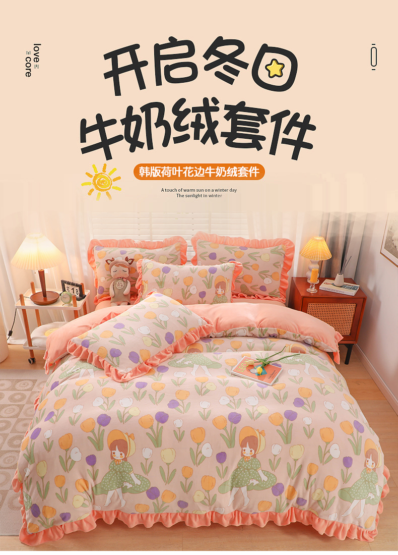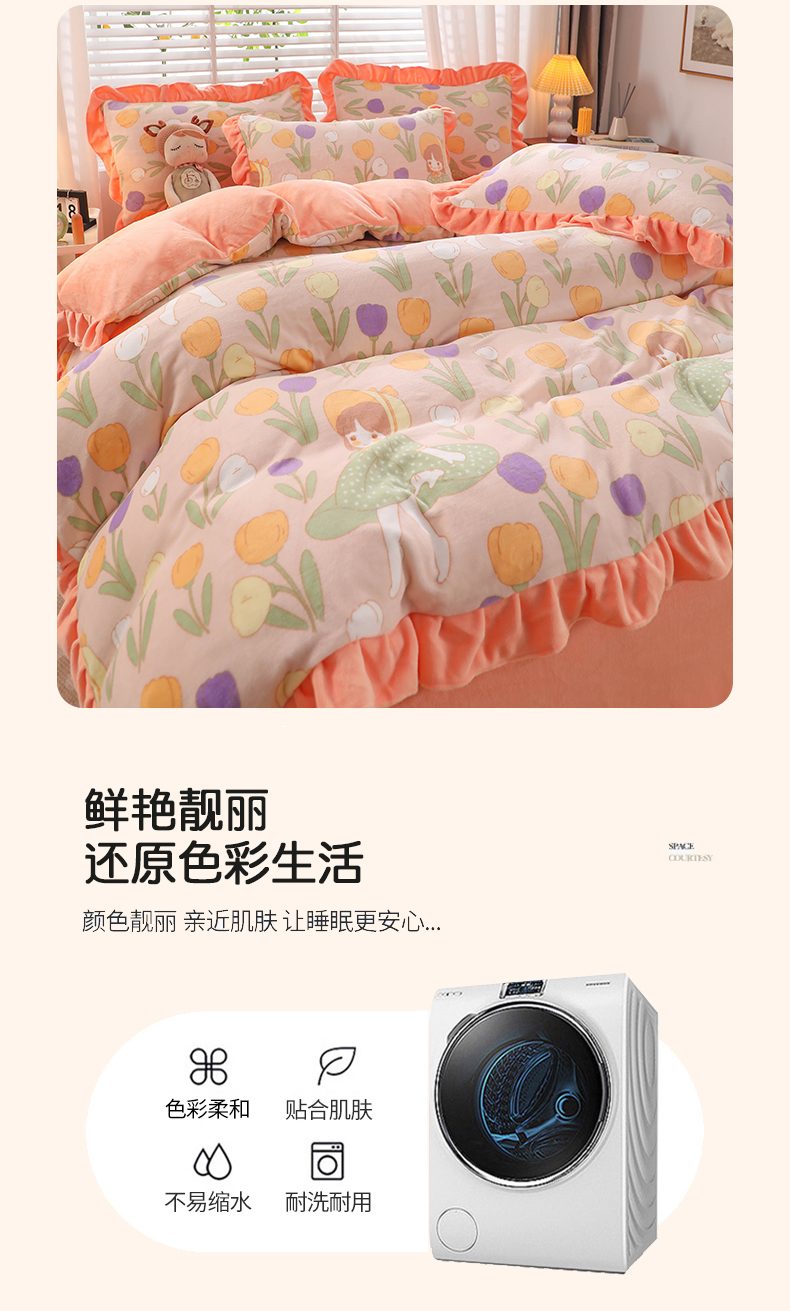 商品名称:家之硕 2023新款韩版荷叶边印花牛奶绒四件套 花园女孩